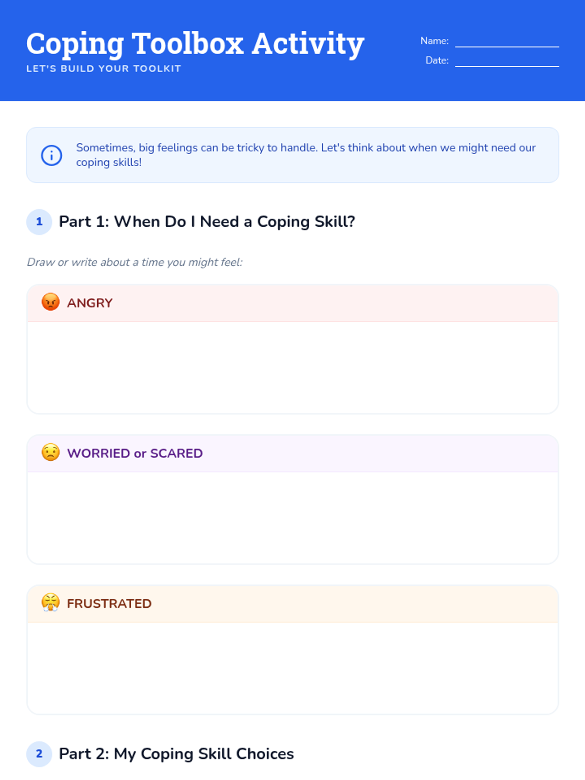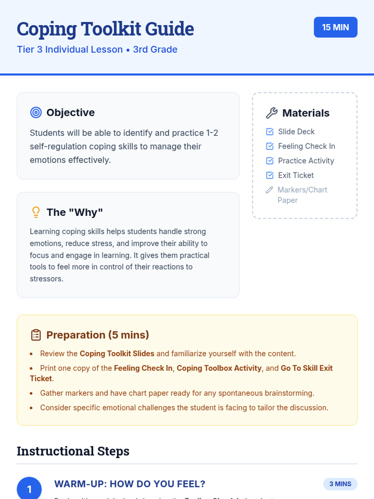 A 15-minute Tier 3 intervention for 3rd graders to identify and practice self-regulation strategies for managing big emotions. Students explore specific coping tools and commit to a 'go-to' skill for the week.