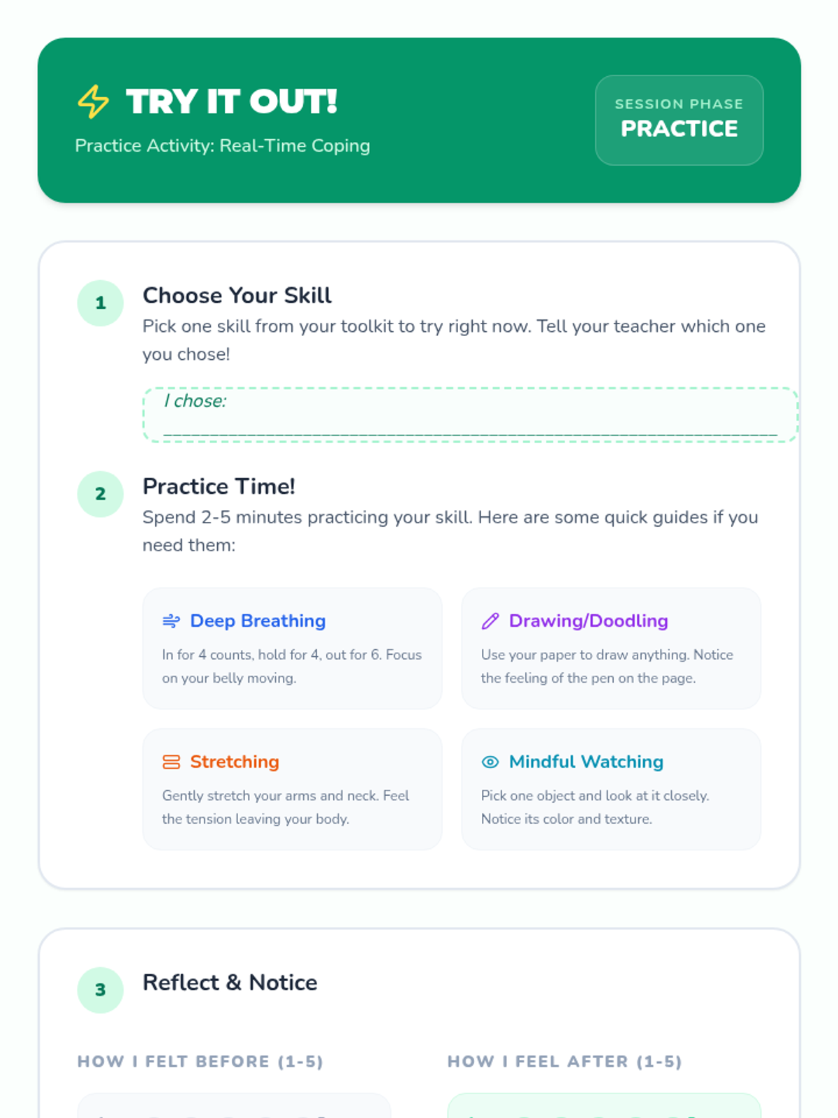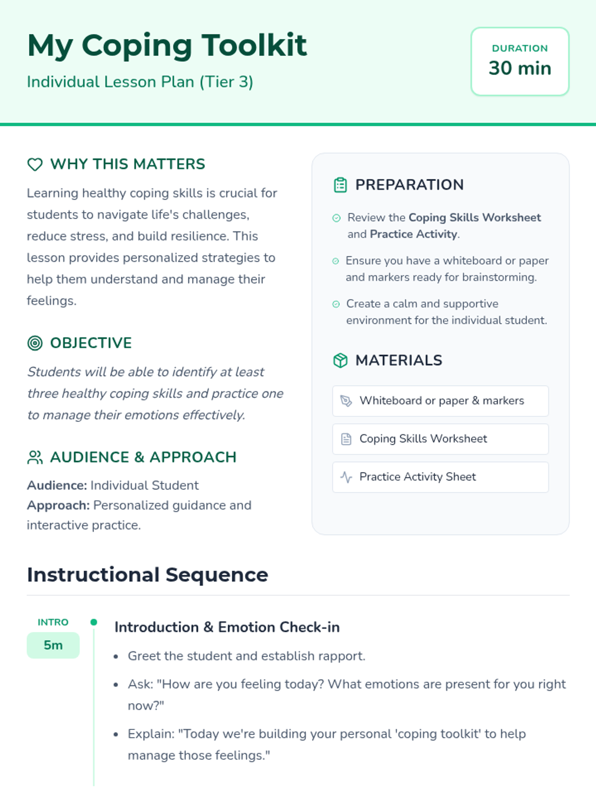 This individual lesson helps students identify and practice healthy coping skills to manage their emotions effectively. By understanding their feelings and developing a personalized toolkit, students will gain valuable strategies for emotional regulation. Designed for individual students, this lesson is 30 minutes long.