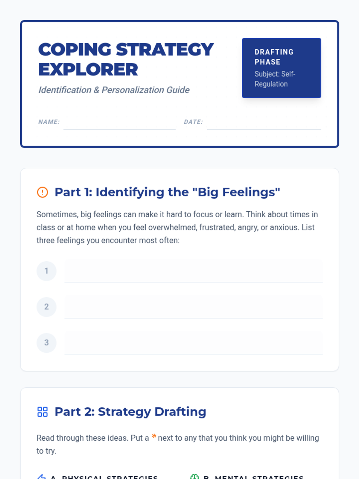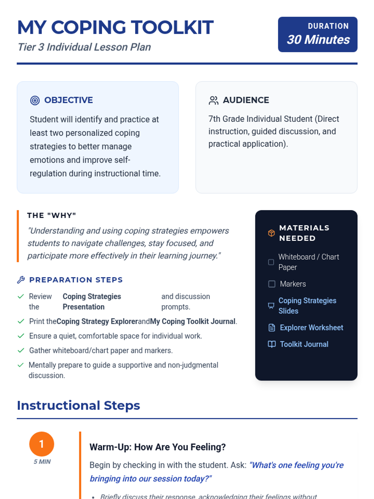 A 30-minute Tier 3 individual lesson for 7th-grade students to identify, practice, and personalize coping strategies for better self-regulation and classroom engagement.
