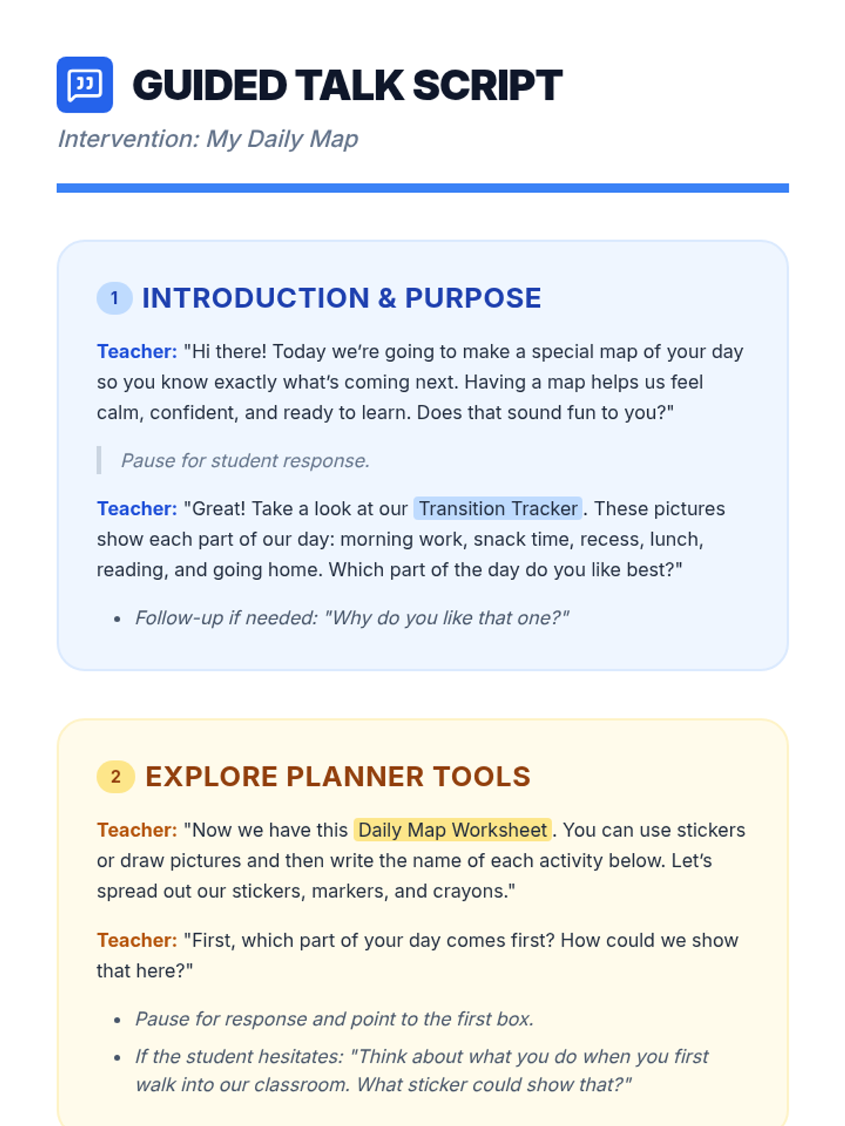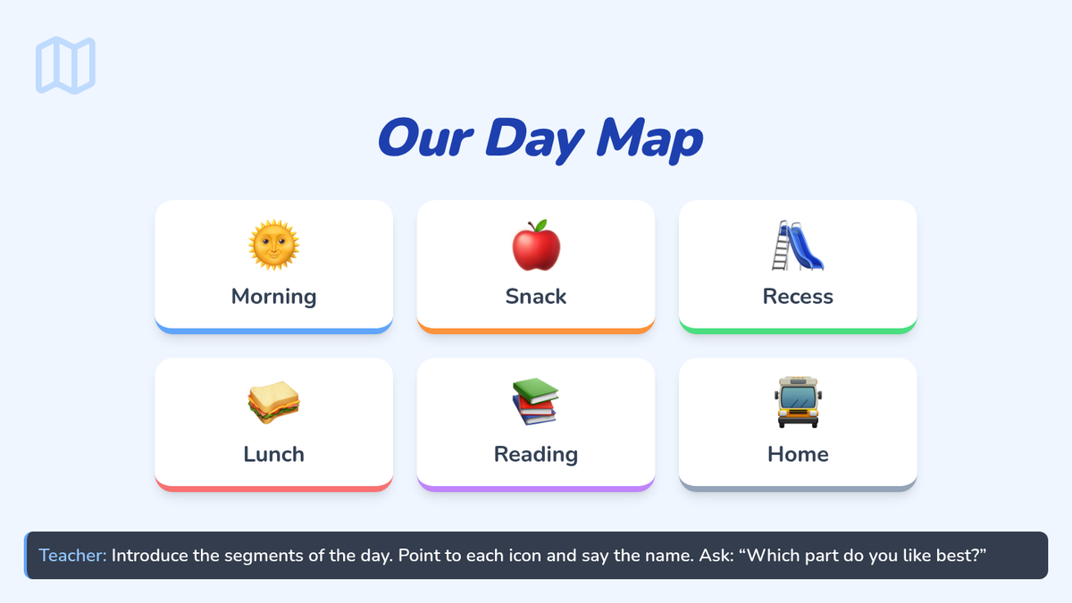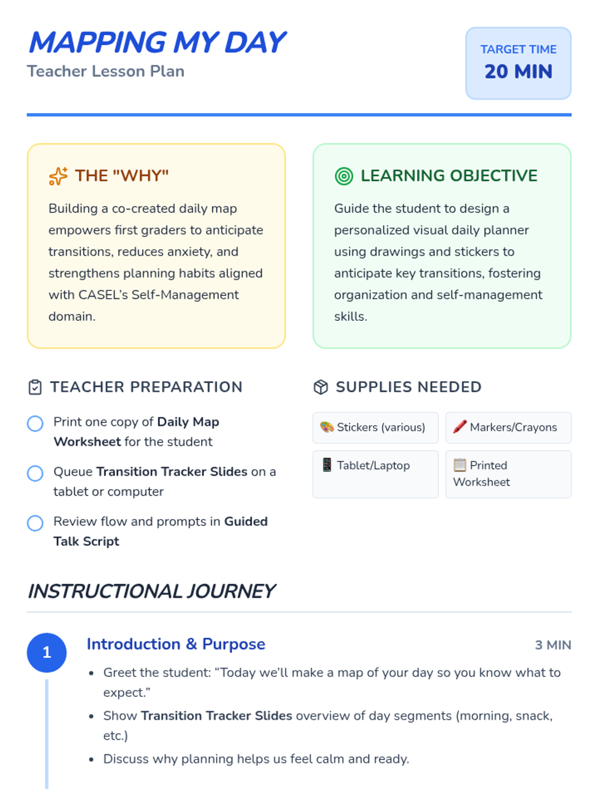 A 20-minute Tier 3 intervention for first graders to build self-management and transition skills by co-creating a personalized visual daily schedule. Students map out their school day using drawings and stickers to foster organization and reduce anxiety.