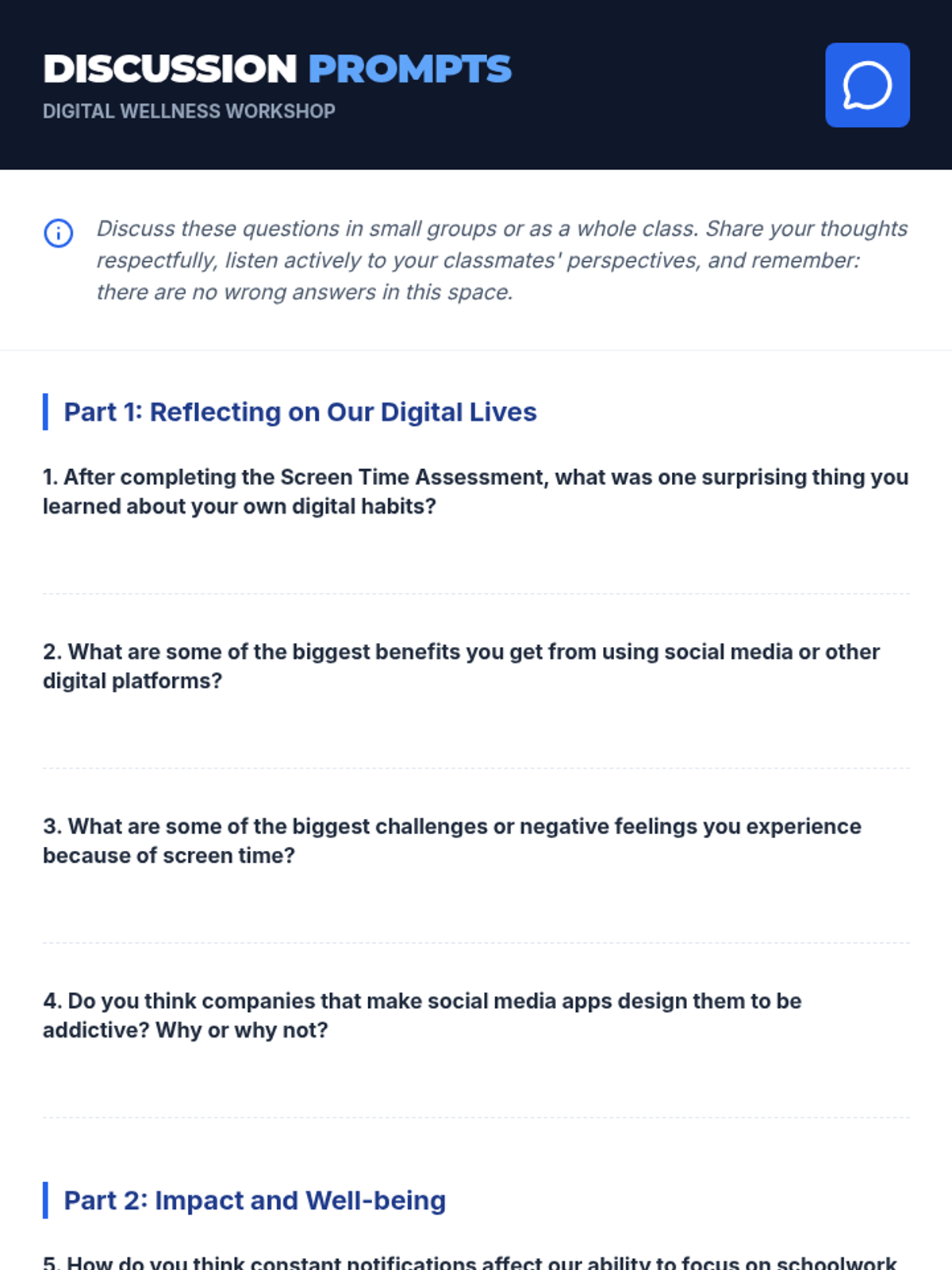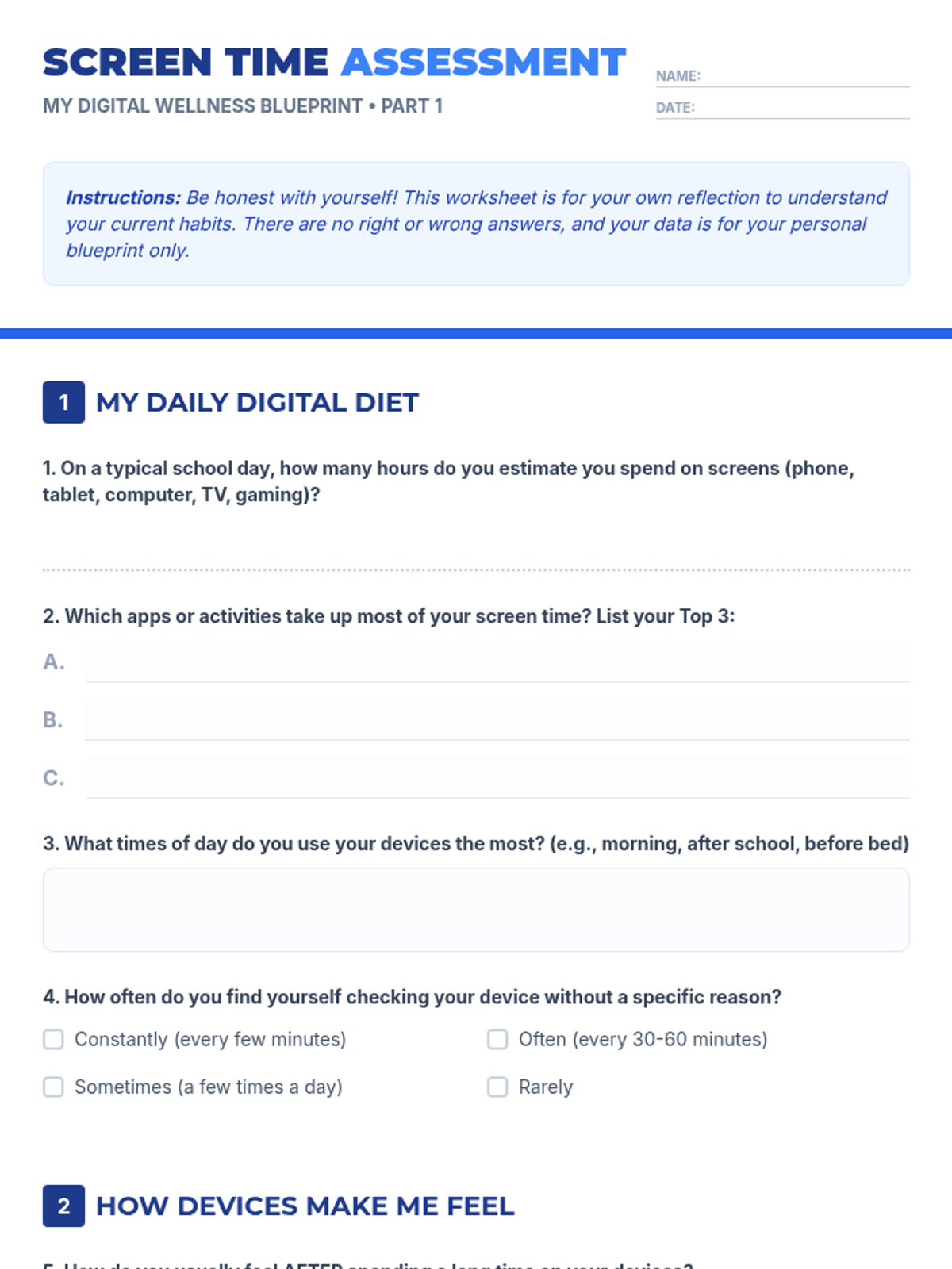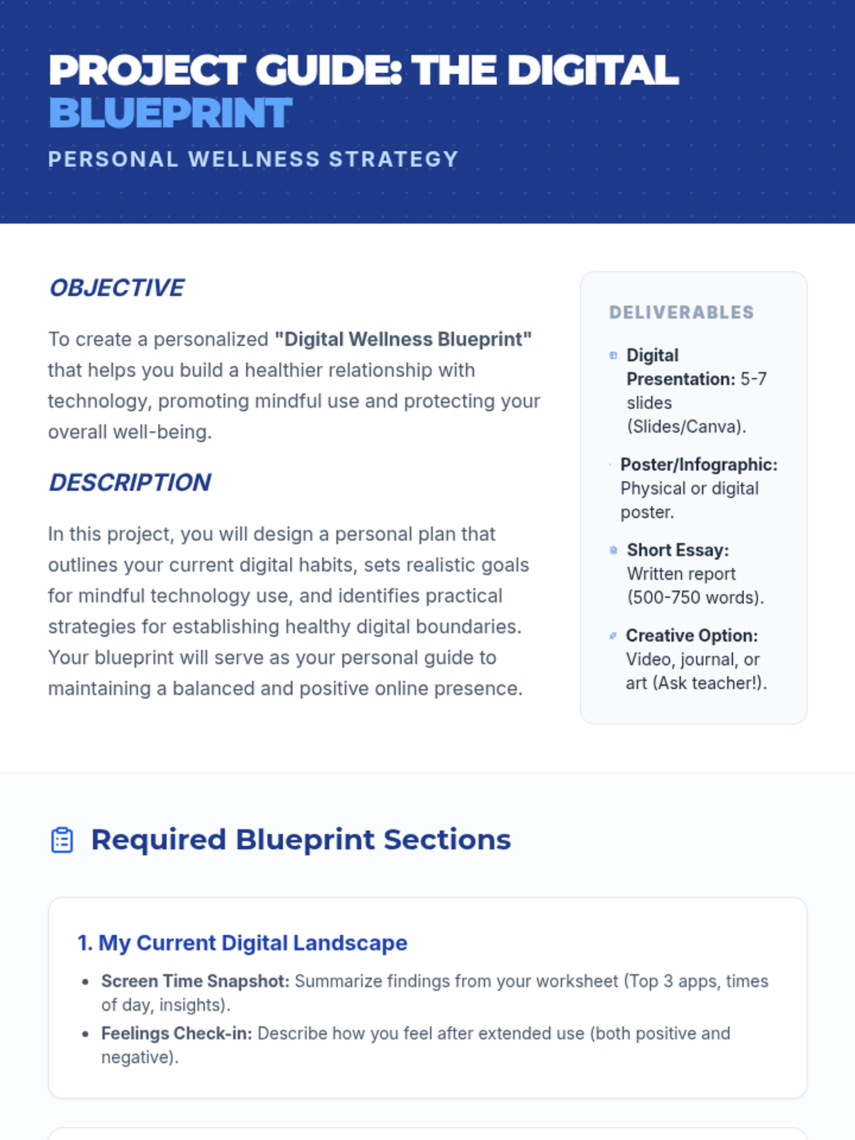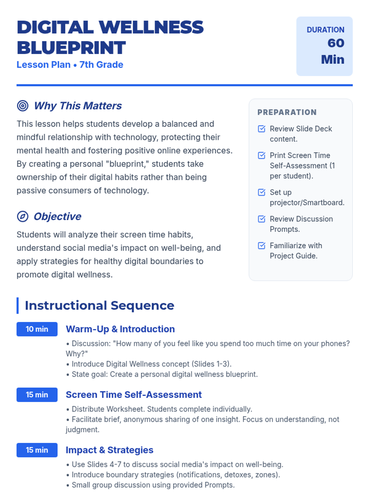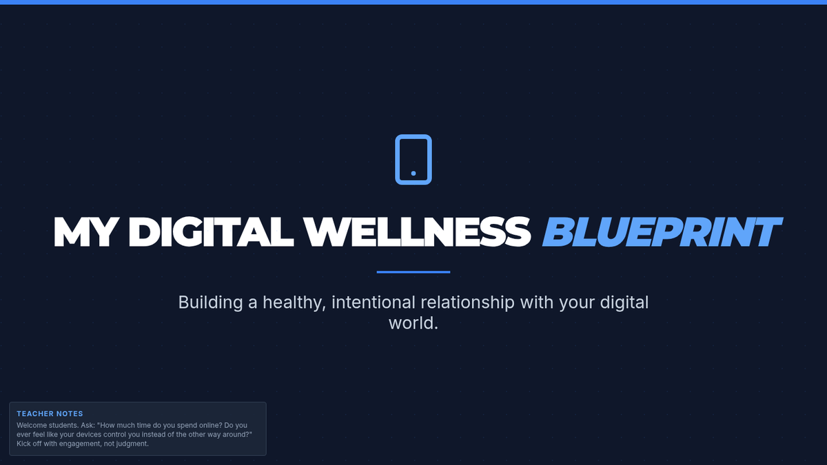 A 60-minute lesson for 7th graders focusing on digital wellness, screen time habits, and building healthy boundaries with technology through self-reflection and a personal blueprint project.