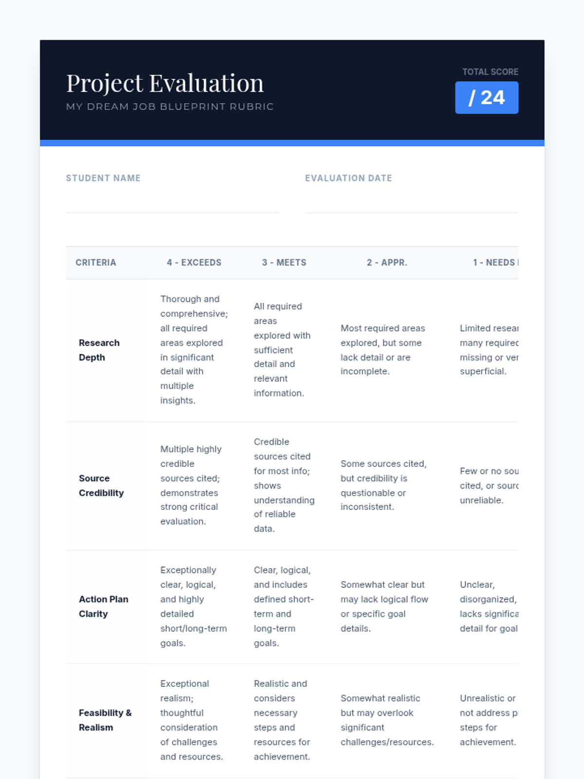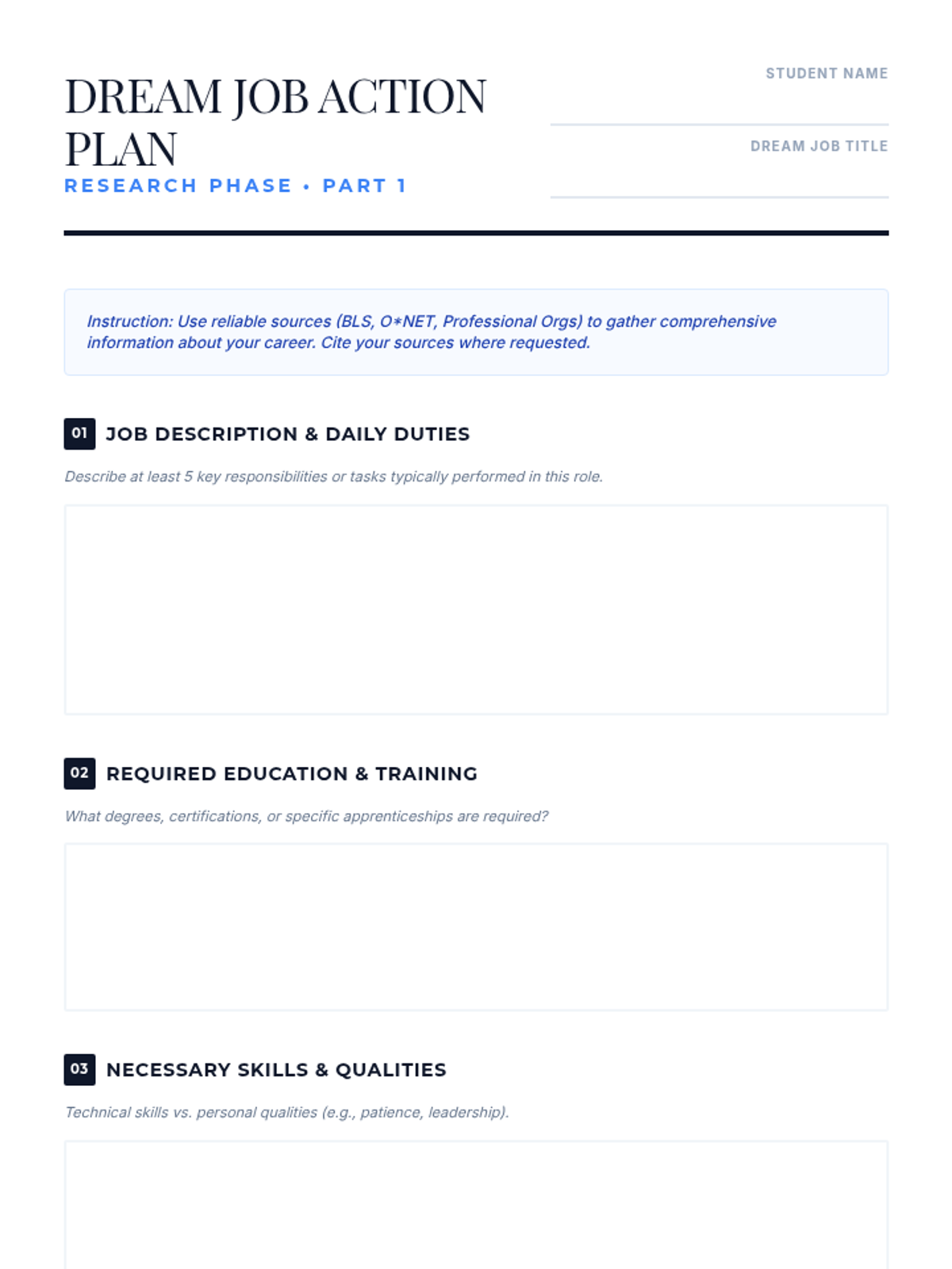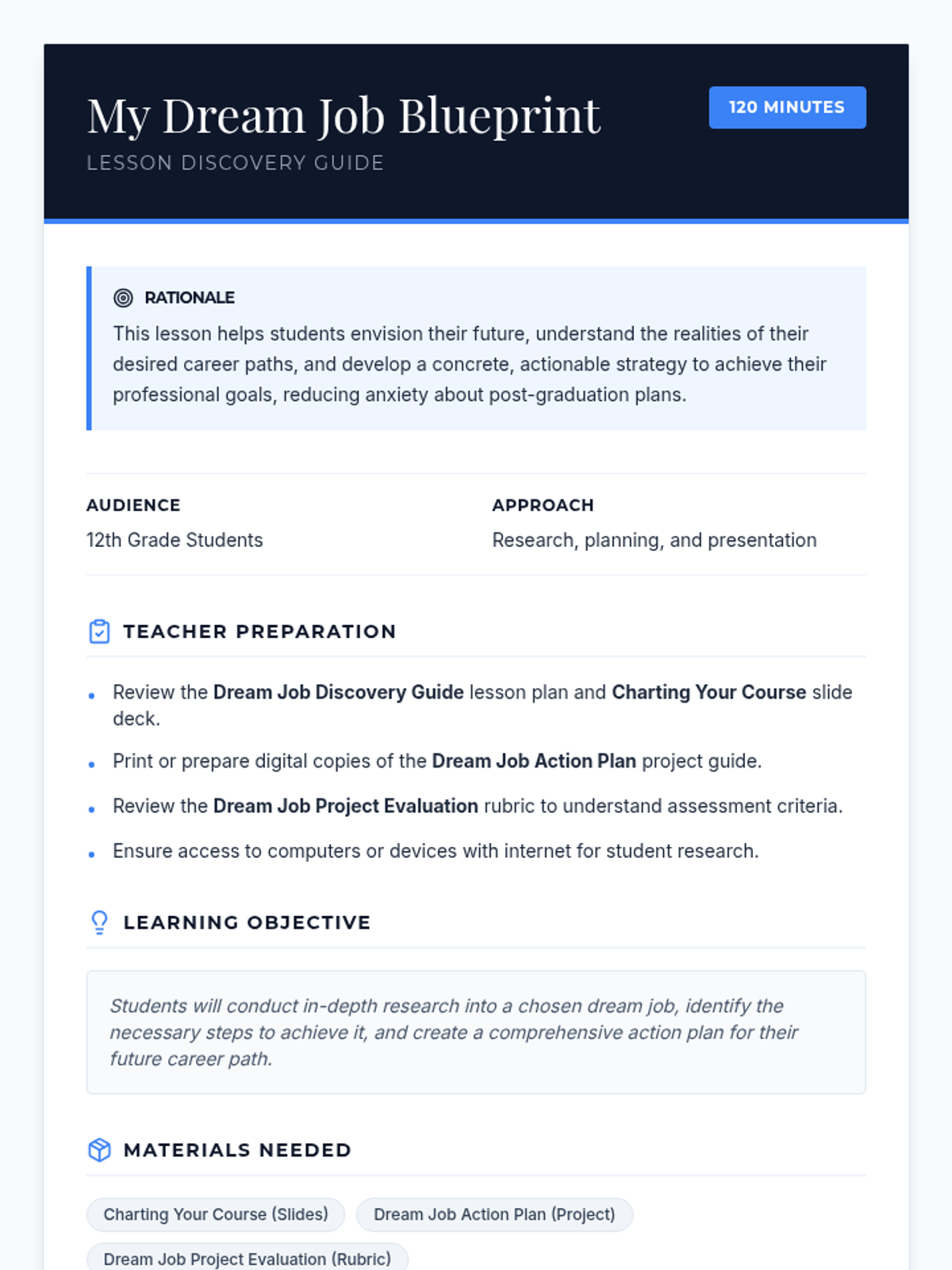 A comprehensive 120-minute project for 12th-grade students to research their dream careers and build a step-by-step action plan for their future. This lesson empowers students with concrete research and planning tools to turn their aspirations into reality.