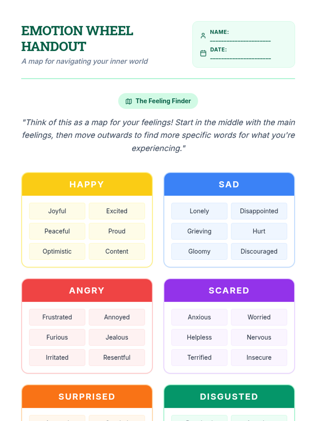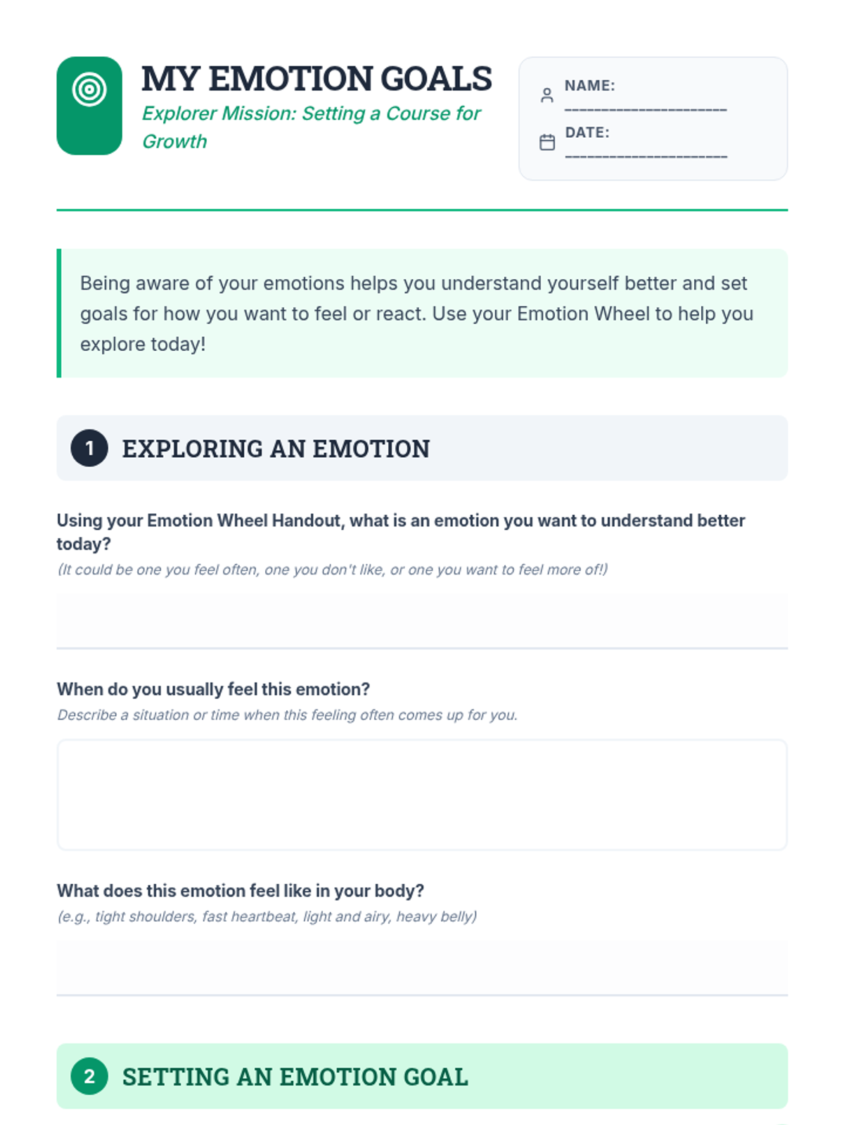 A 30-minute Tier 1 lesson for 5th graders to explore their emotions using an emotion wheel and set personal self-awareness goals.