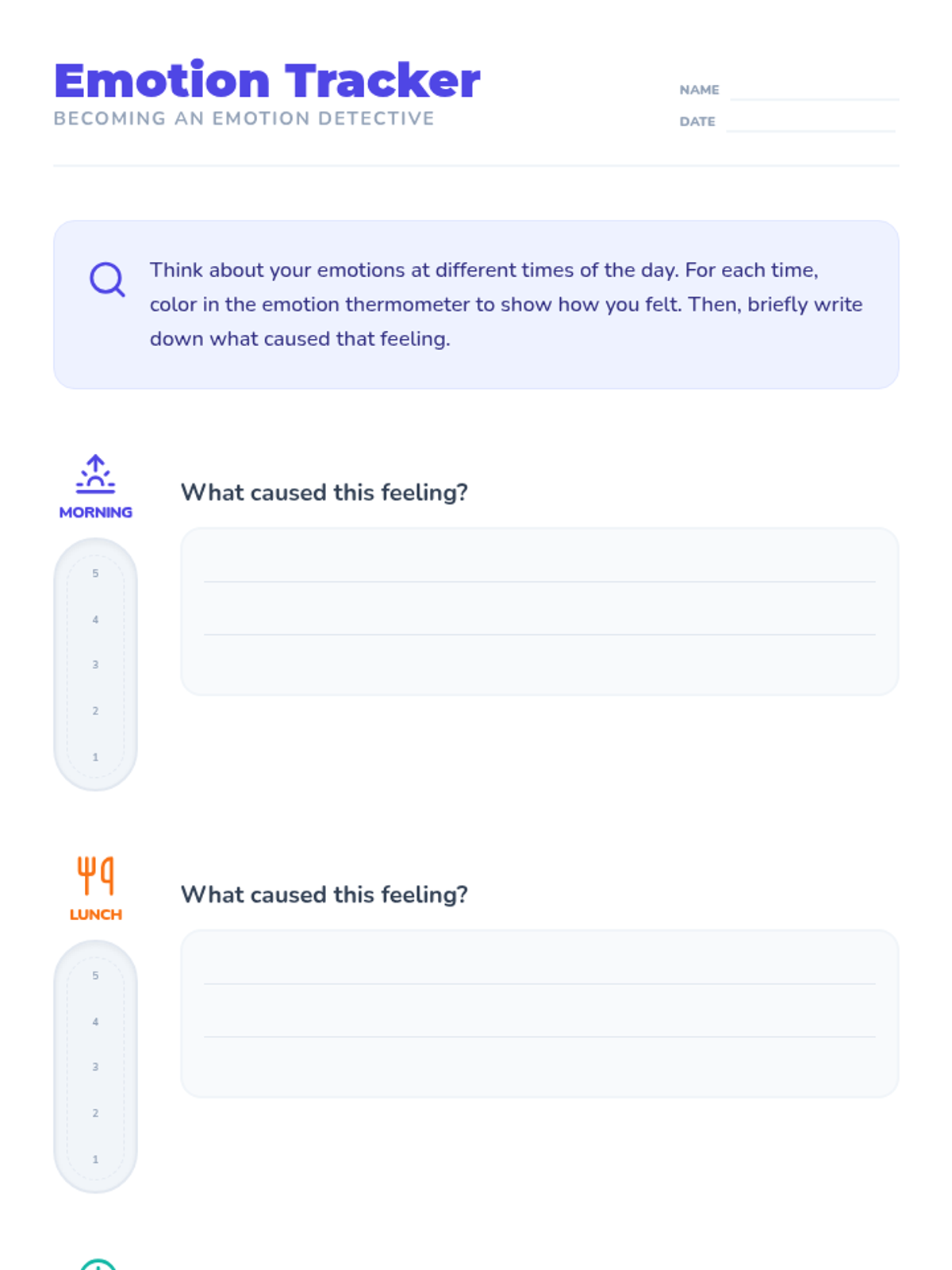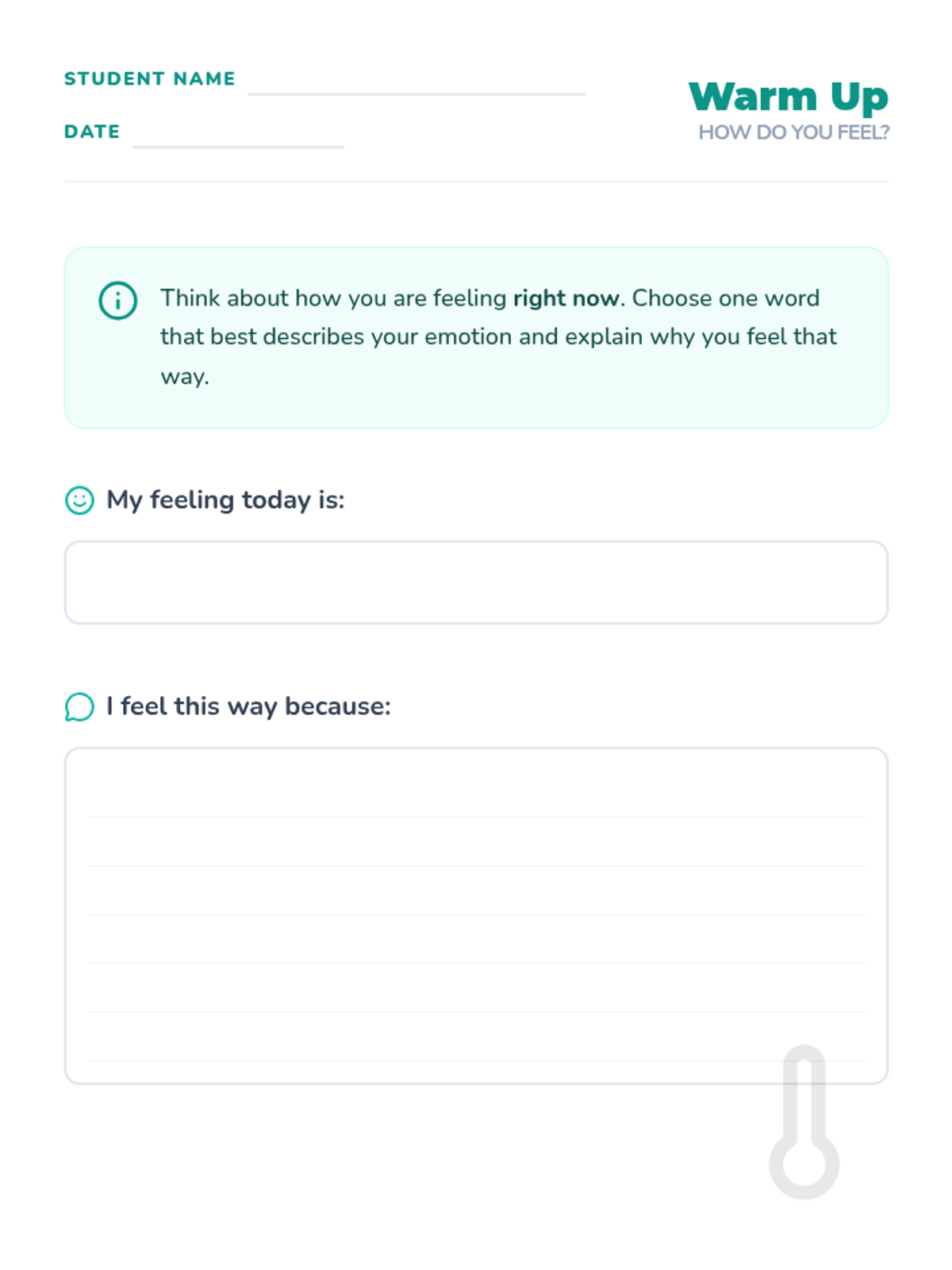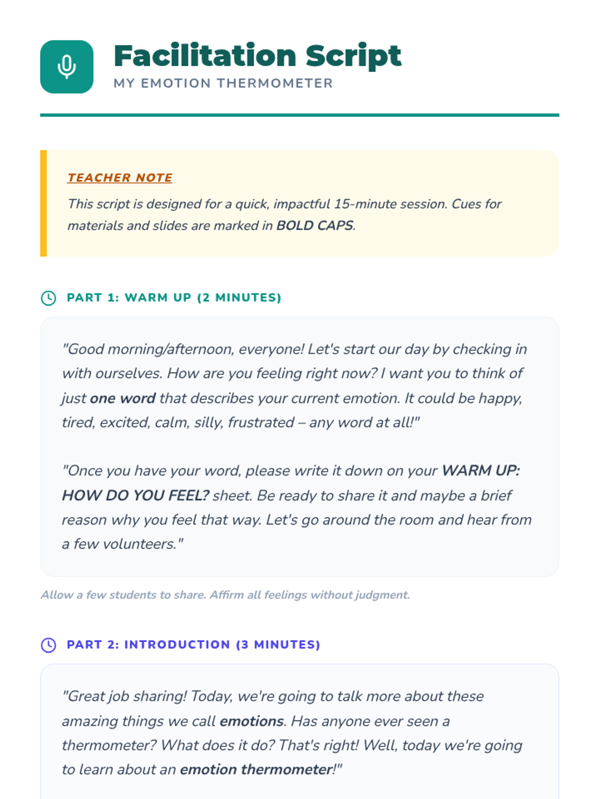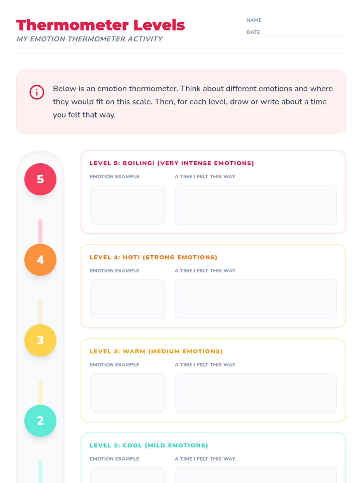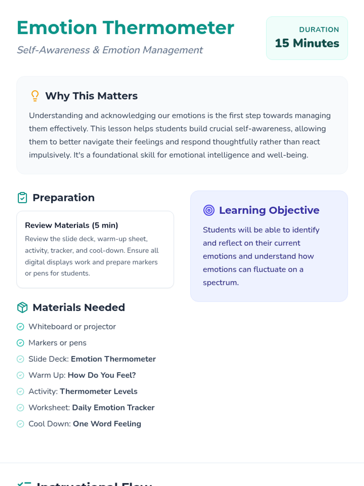 A 15-minute introductory lesson for 4th graders to identify and measure the intensity of their emotions using an 'emotion thermometer' tool. Students learn to recognize that feelings exist on a spectrum and practice tracking their moods throughout the day.
