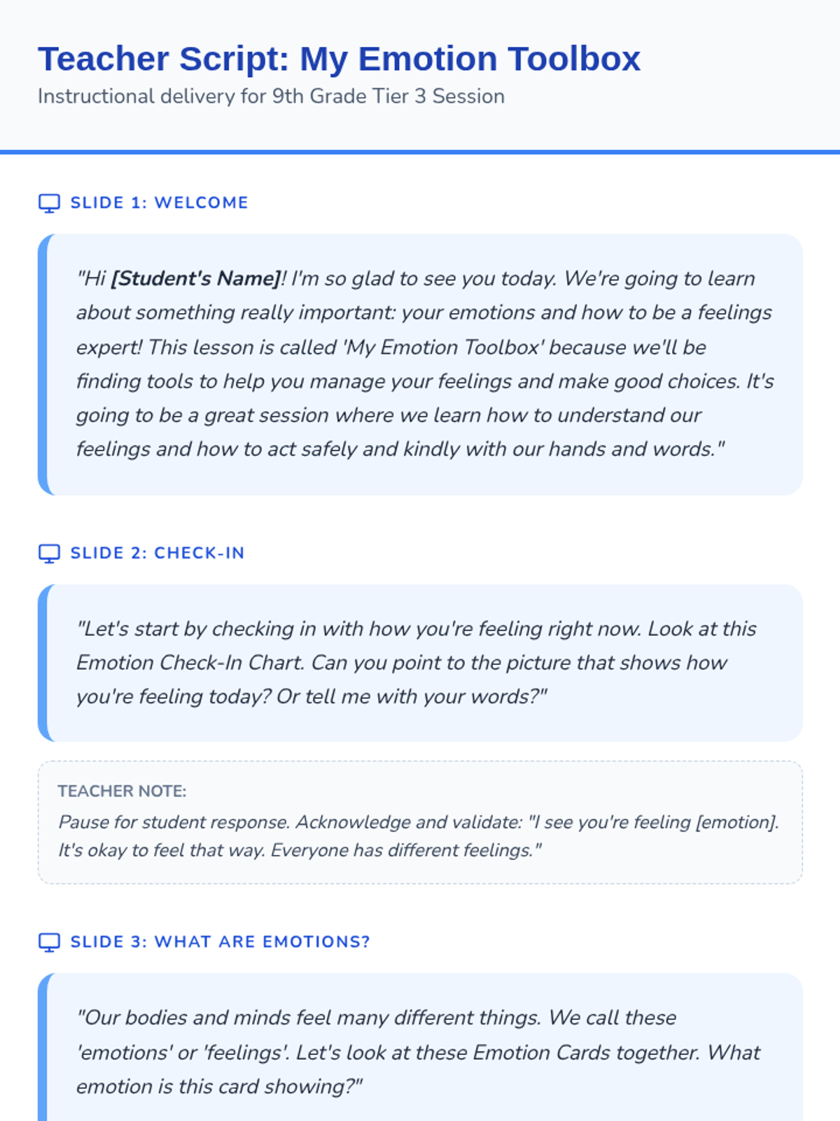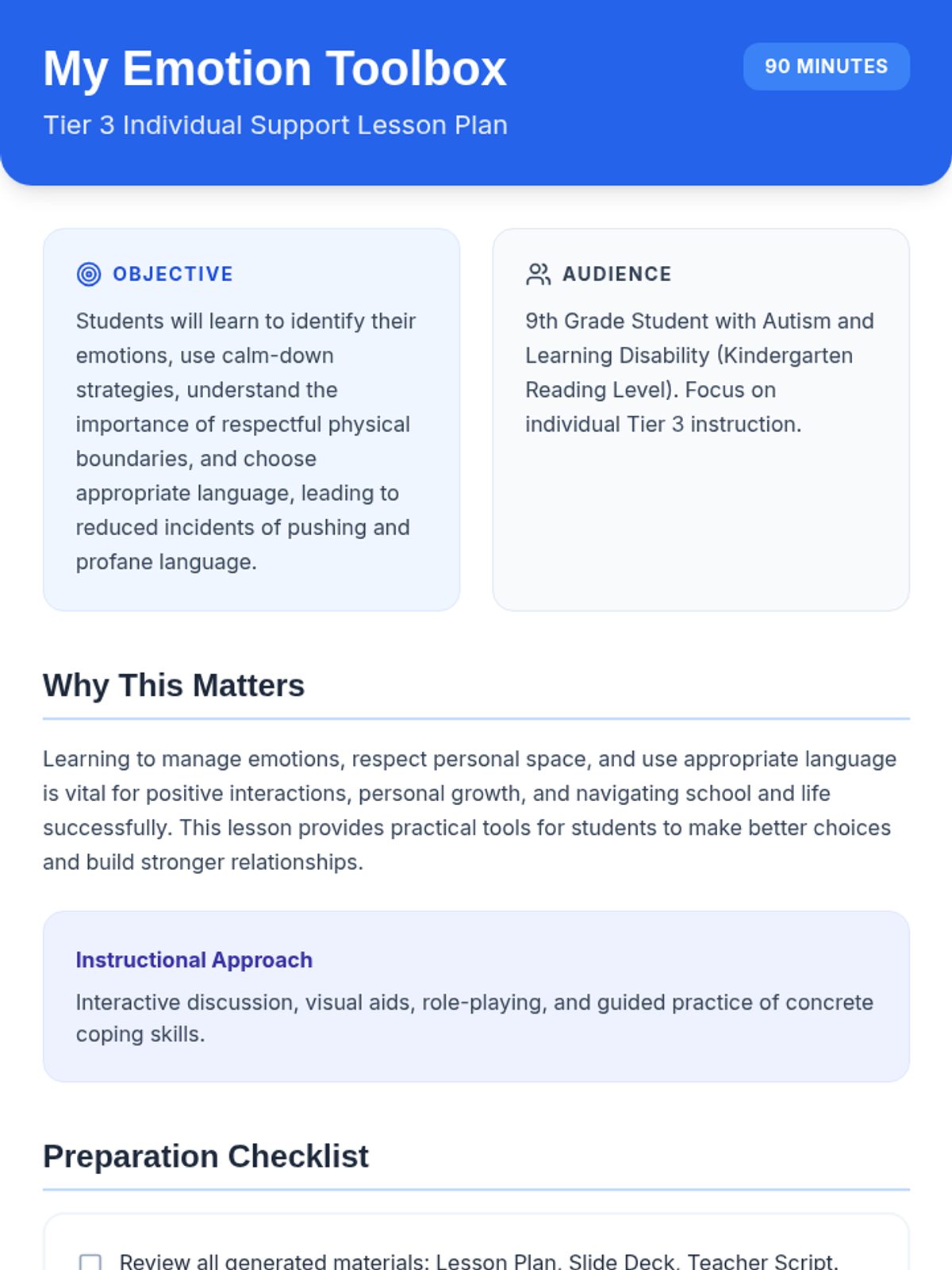 A 90-minute Tier 3 individual lesson for a 9th-grade student with autism and a kindergarten reading level, focusing on identifying emotions, using calm-down tools, keeping hands to self, and using kind words.