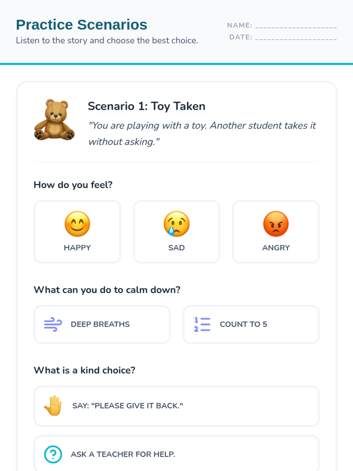 A lesson designed to empower students to understand their IEP goals and practice self-advocacy through scenario-based roleplay. Students will learn the 'Blueprinting' method for communicating their needs effectively to teachers and staff.