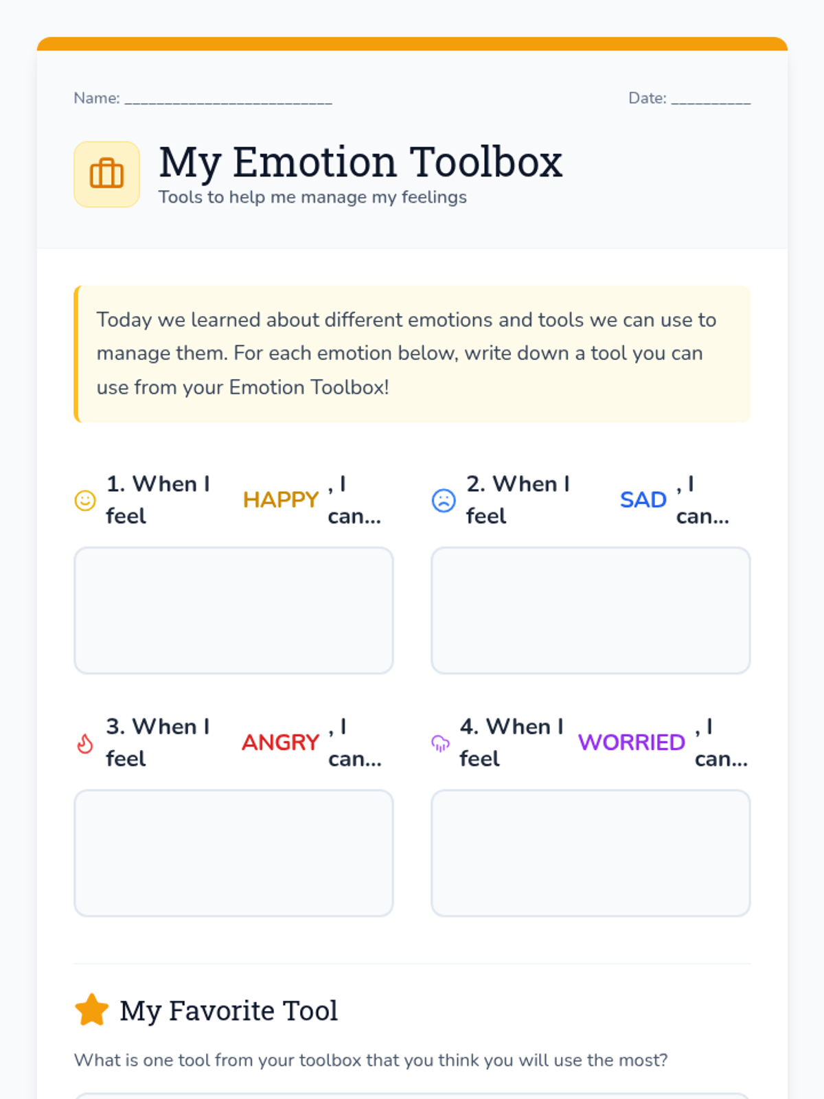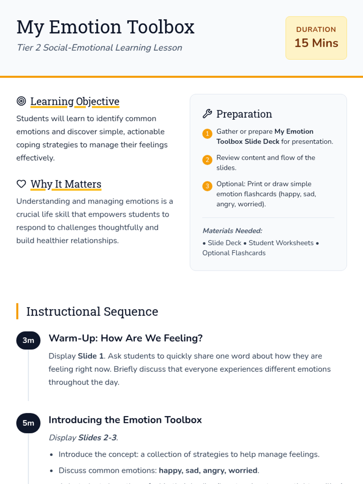 A 15-minute Tier 2 lesson for 3rd-grade students focused on identifying common emotions and developing a 'toolbox' of coping strategies to build resilience and emotional regulation.