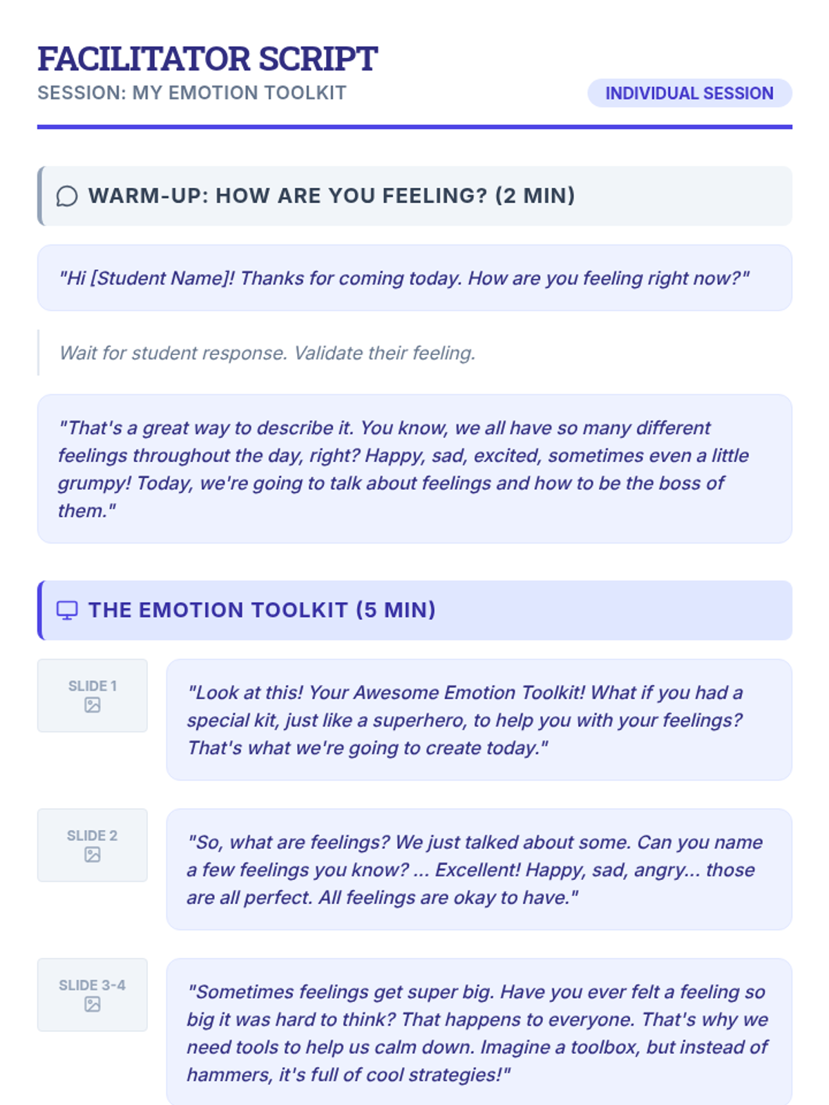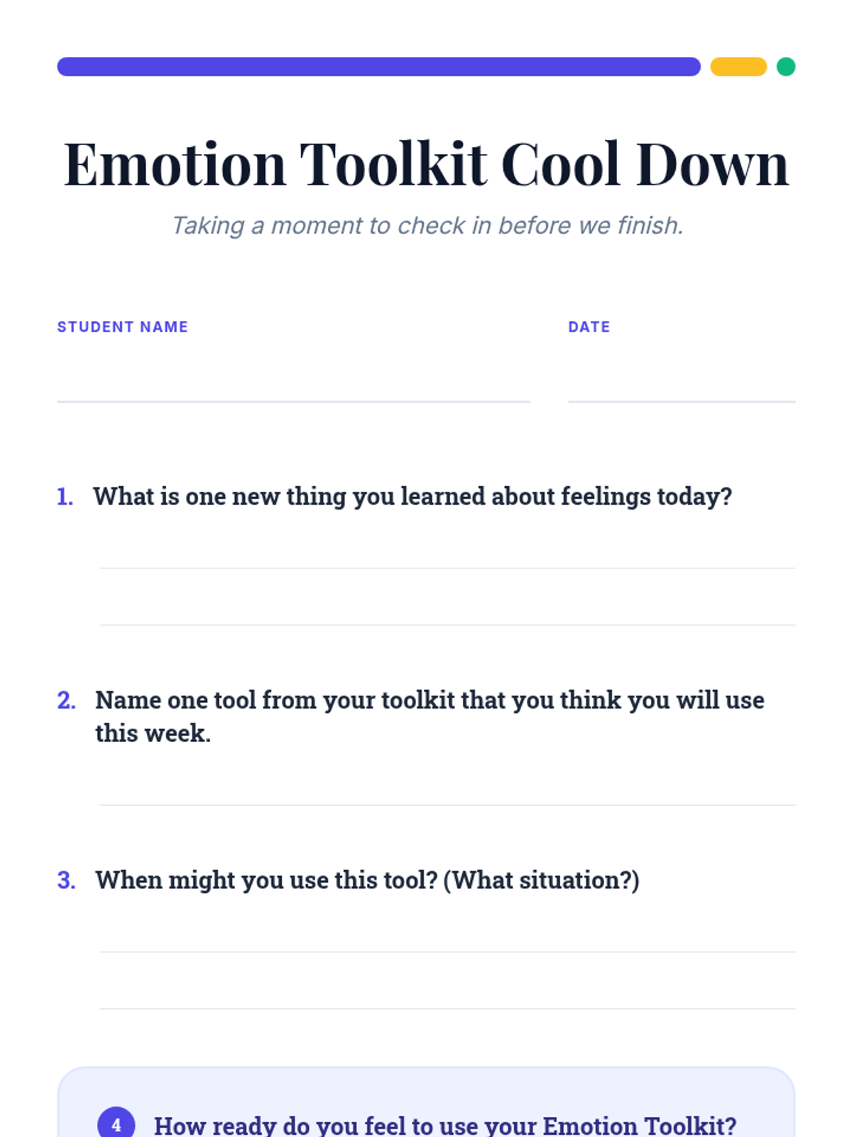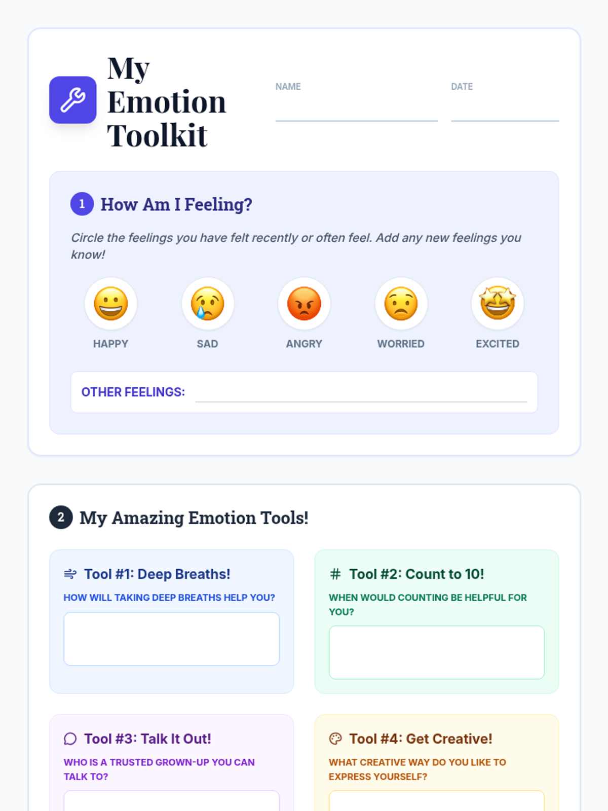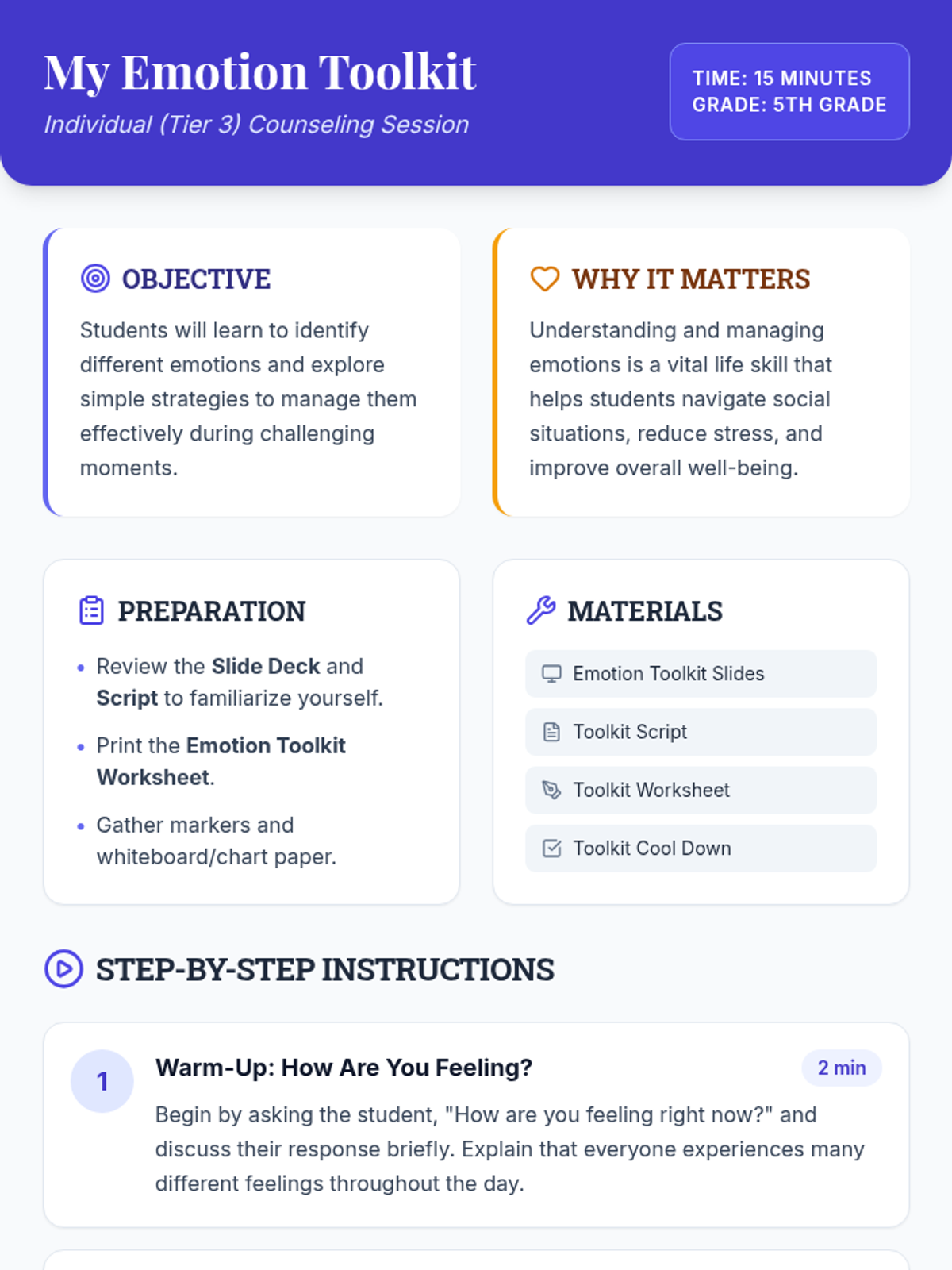 A 15-minute, one-on-one Tier 3 session for 5th-grade students to identify emotions and build a personalized 'toolkit' of coping strategies.