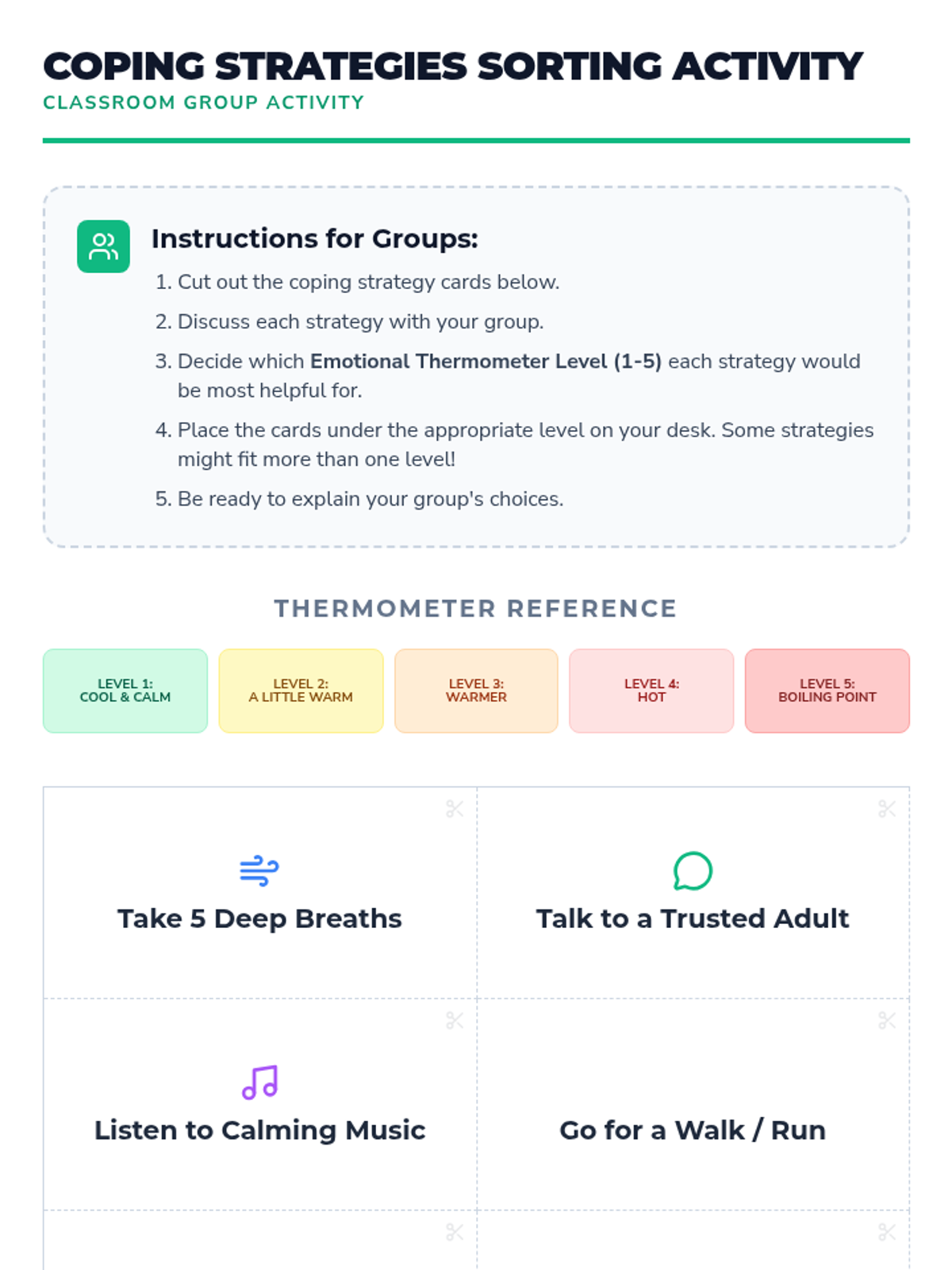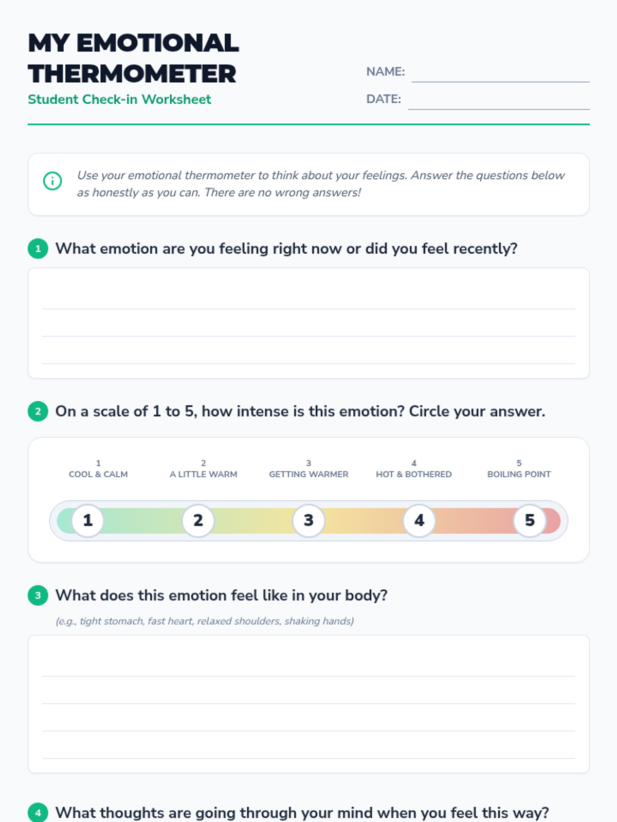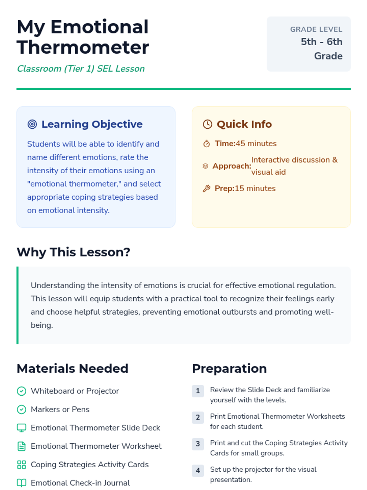 This lesson helps 5th and 6th graders identify and understand the intensity of their emotions using an 'emotional thermometer' scale. Students will learn to gauge their feelings and select appropriate coping strategies for different levels of intensity, fostering greater self-awareness and regulation.
