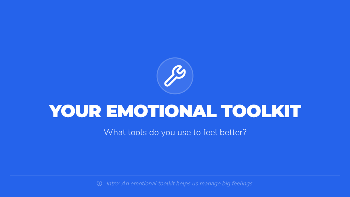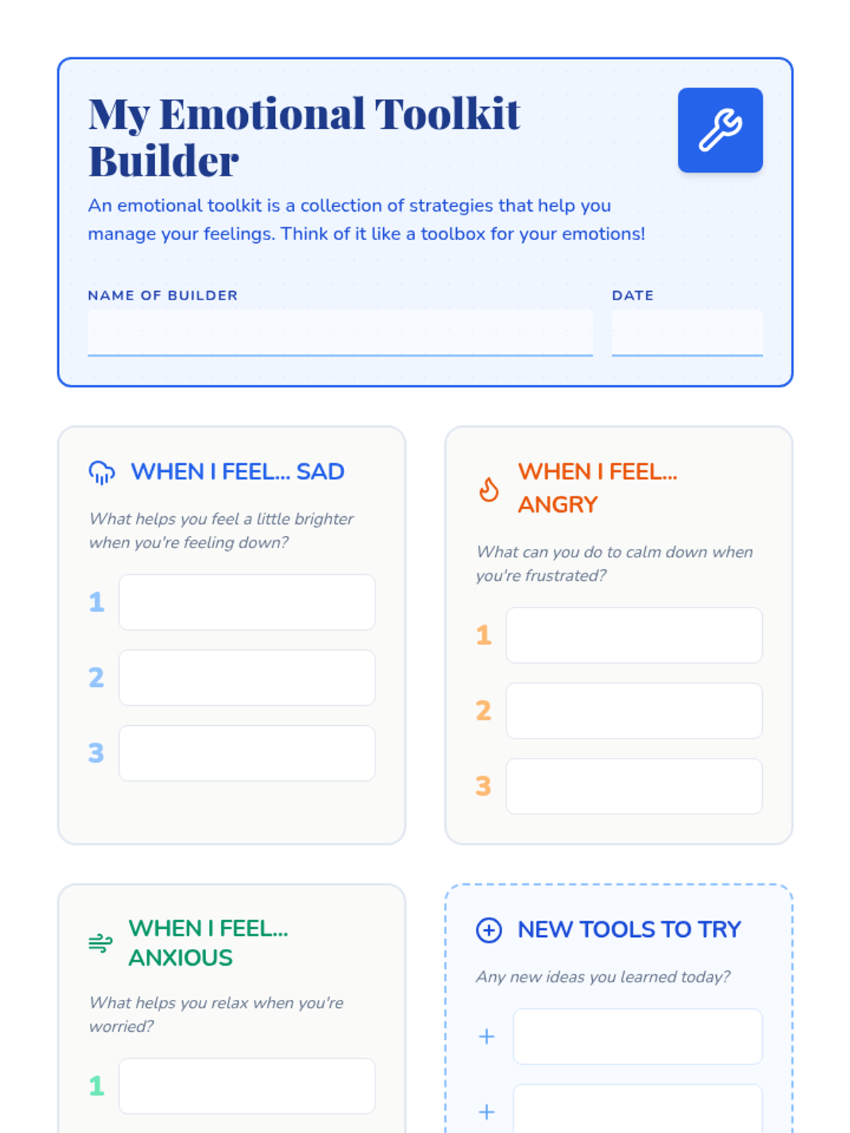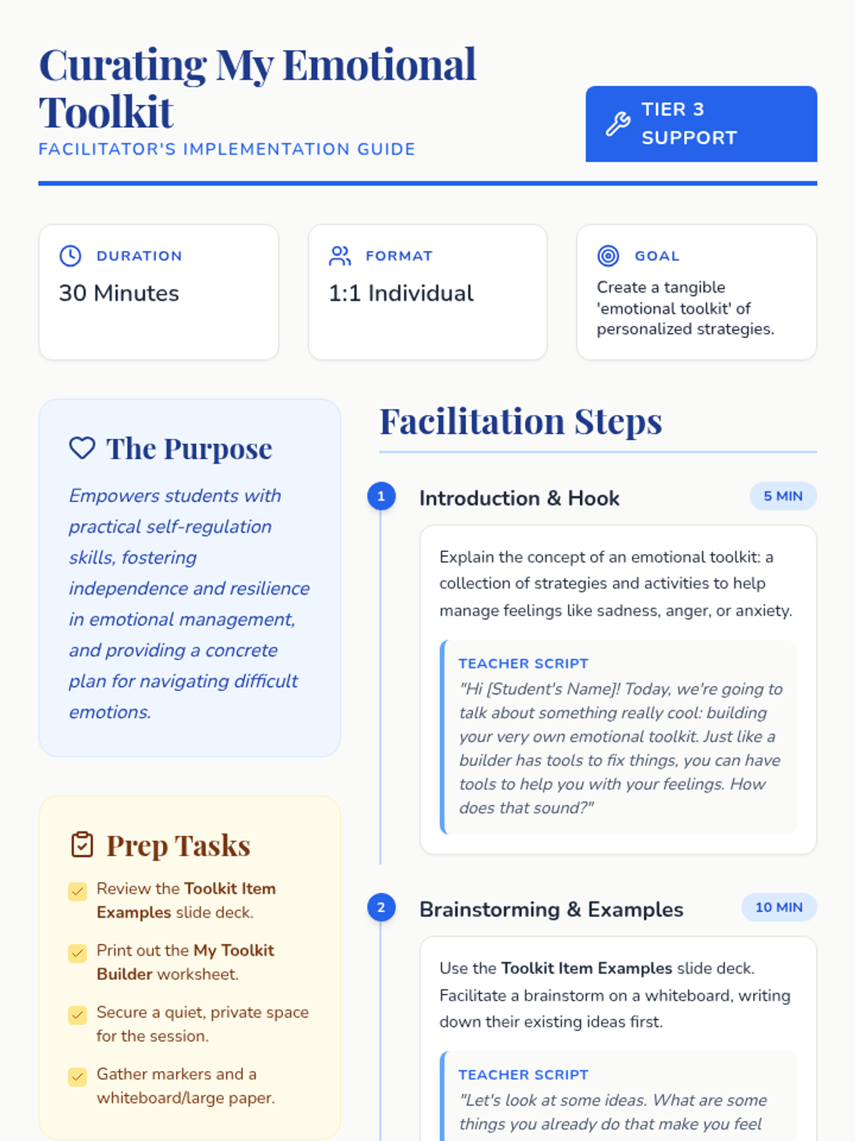 A one-on-one session for Tier 3 support where a student builds a personalized emotional regulation toolkit, identifying specific strategies for sadness, anger, and anxiety.