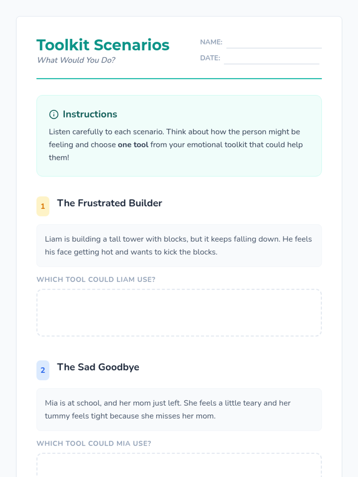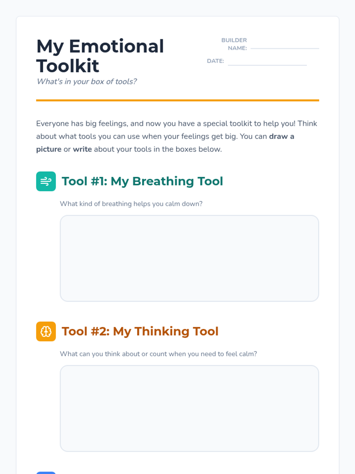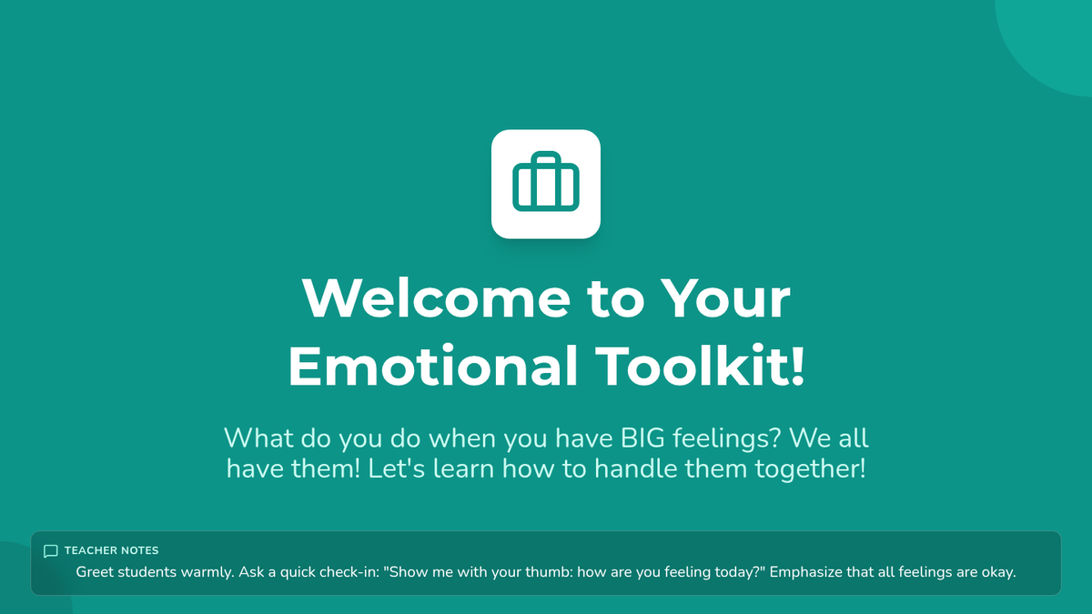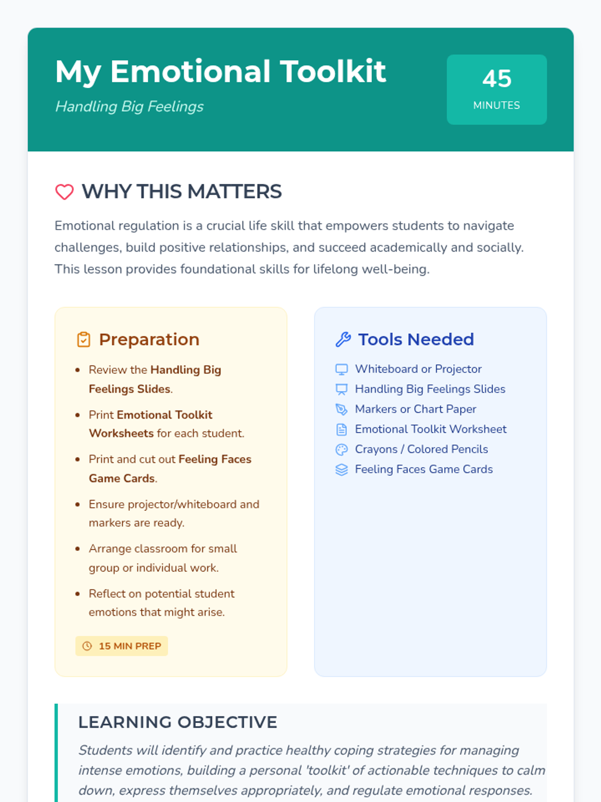 A 45-minute social-emotional learning lesson for 1st-3rd graders focused on identifying intense emotions and building a 'toolkit' of healthy coping strategies like deep breathing, counting, and creative expression.
