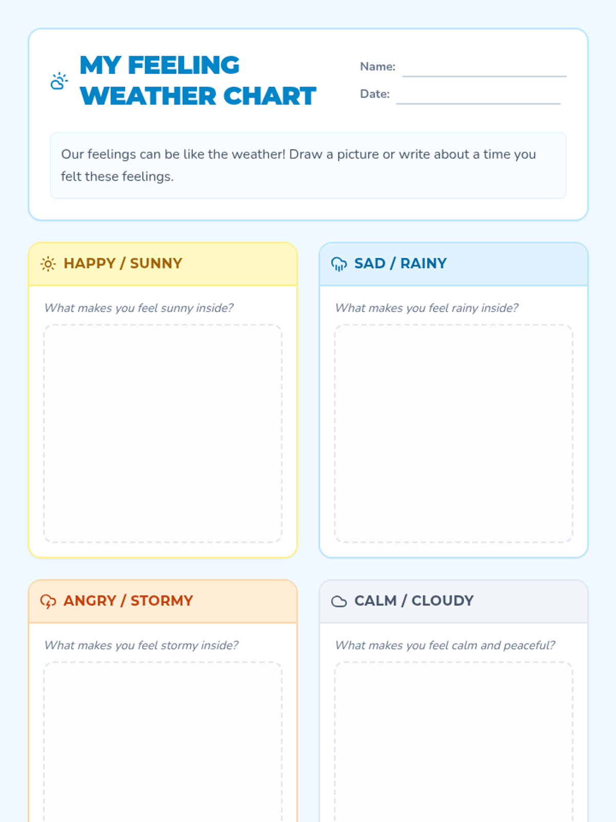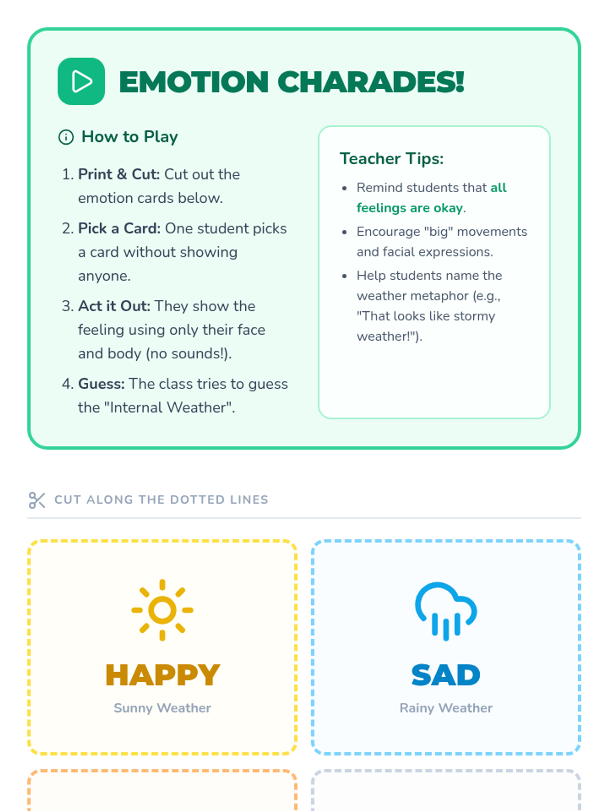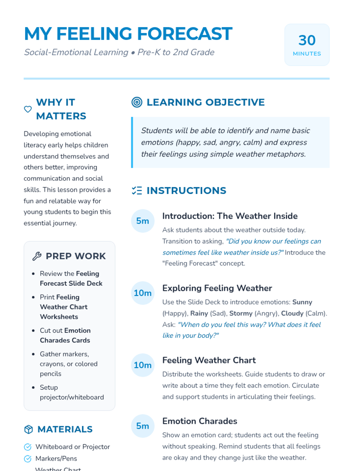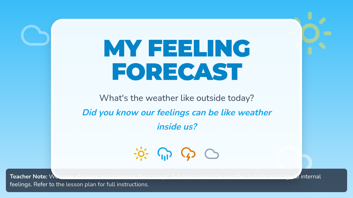 An engaging lesson for Pre-K to 2nd grade students to identify and express emotions using weather metaphors, featuring a slide deck, worksheet, and activity cards.