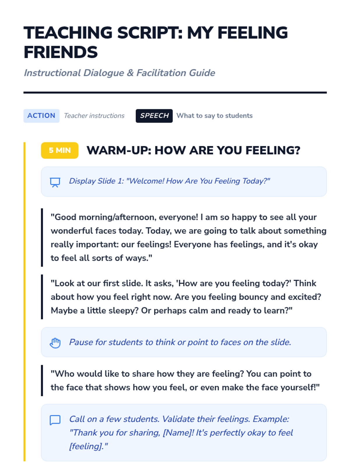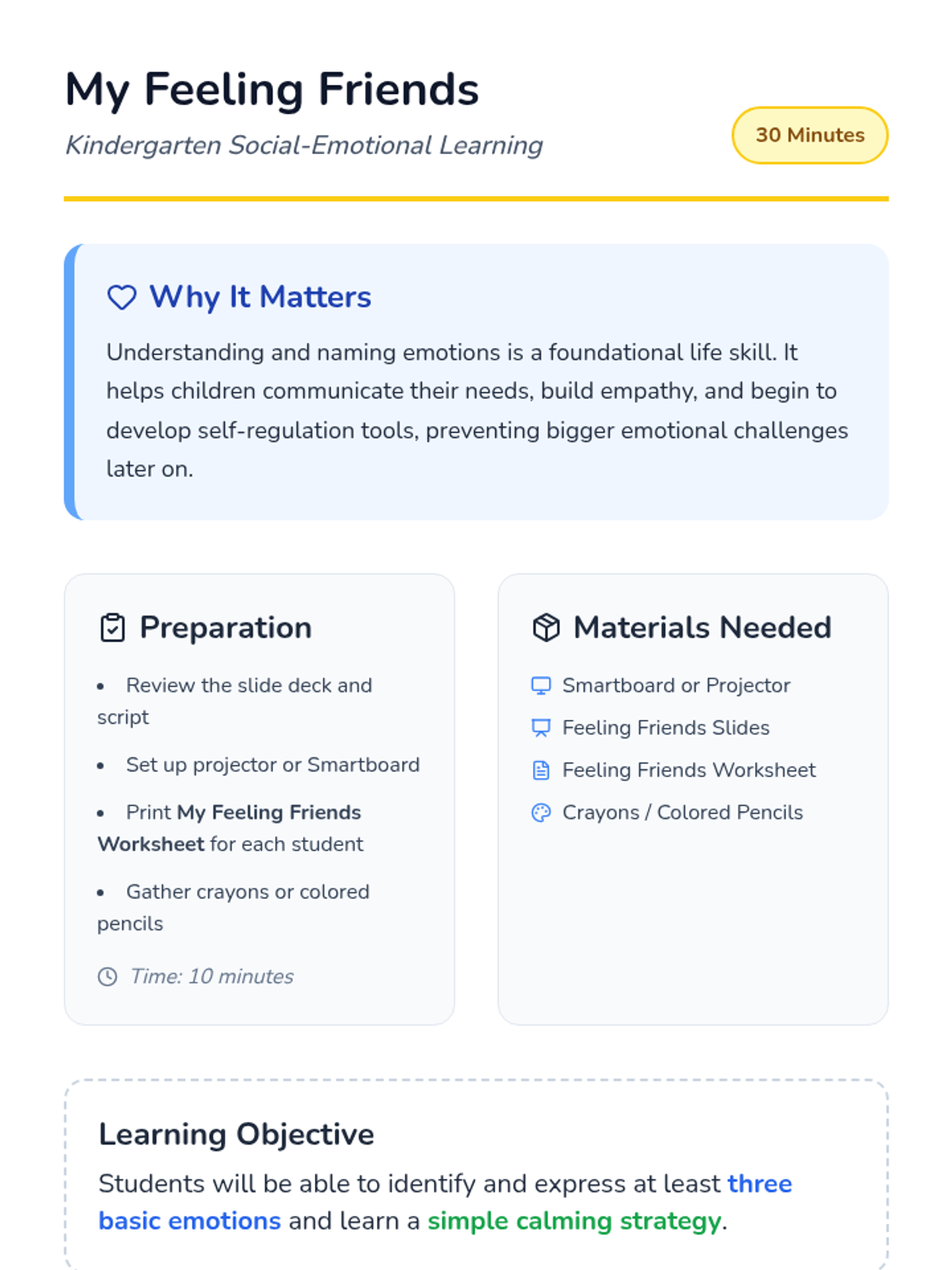 A 30-minute introductory lesson for Kindergarten students to identify, express, and manage basic emotions using 'Feeling Friends' characters and a simple breathing strategy.