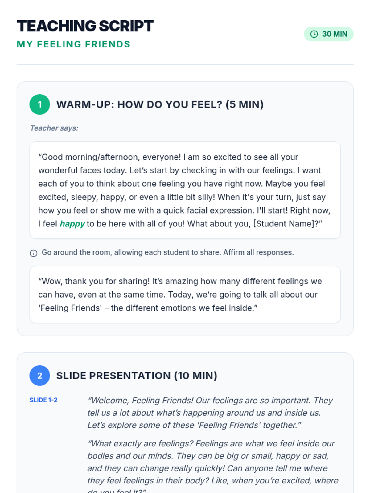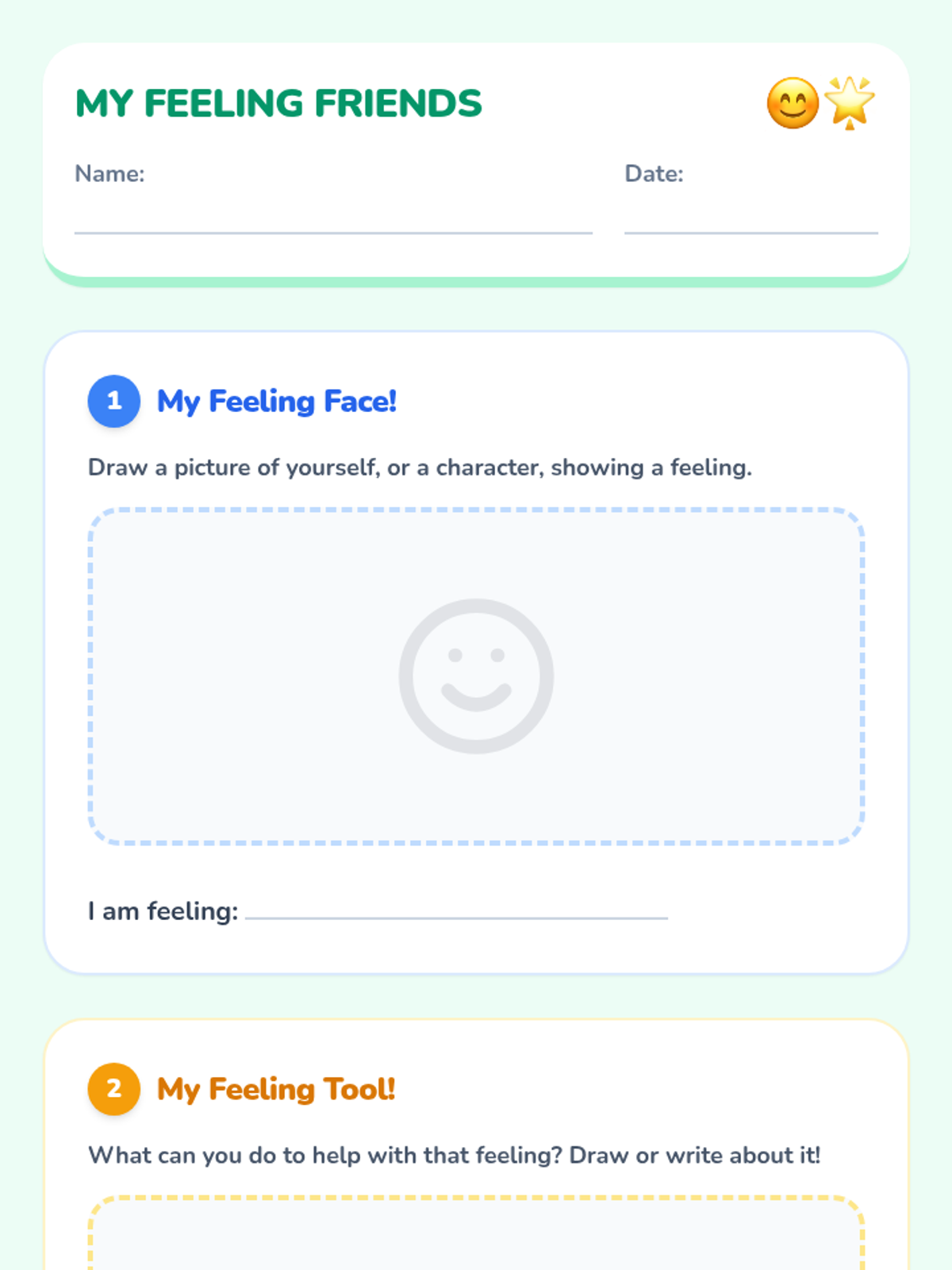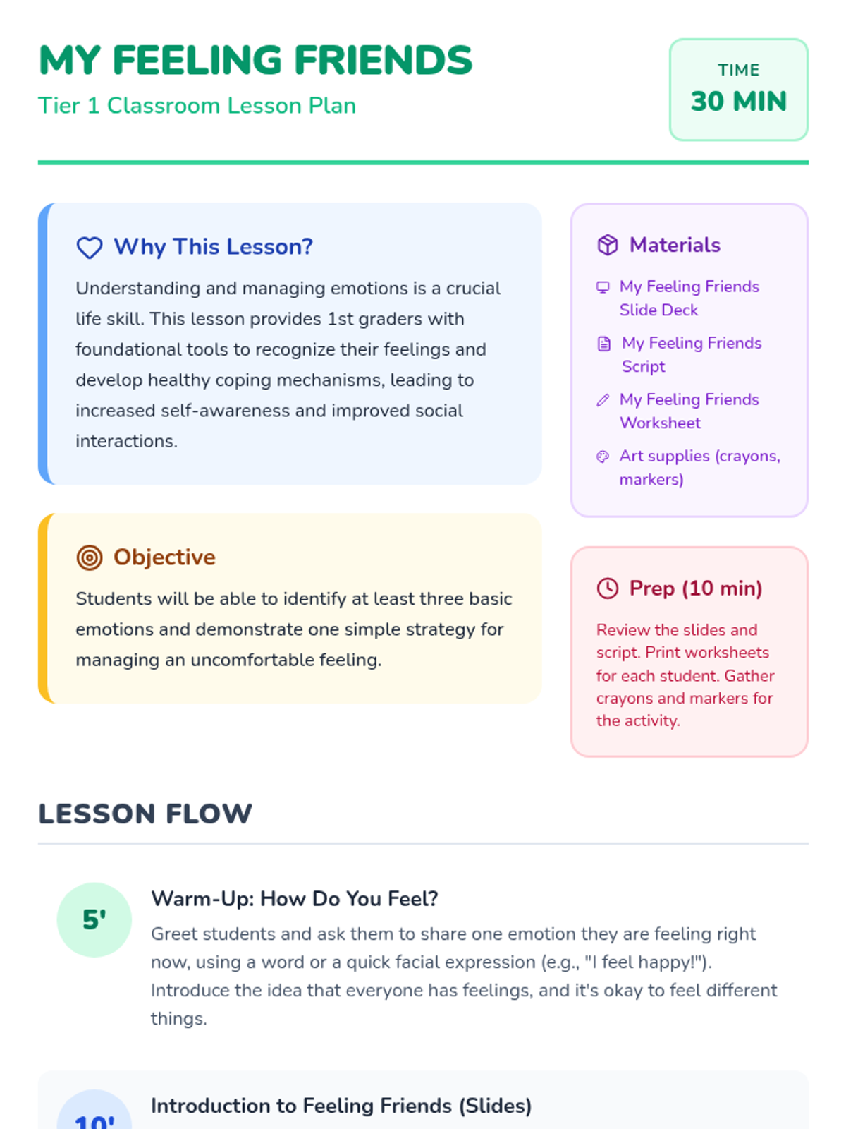 A foundational social-emotional learning lesson for 1st graders to identify basic emotions and practice simple self-regulation strategies.