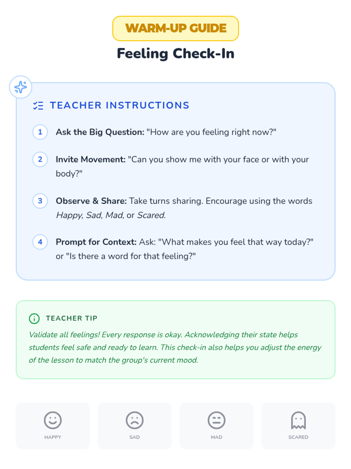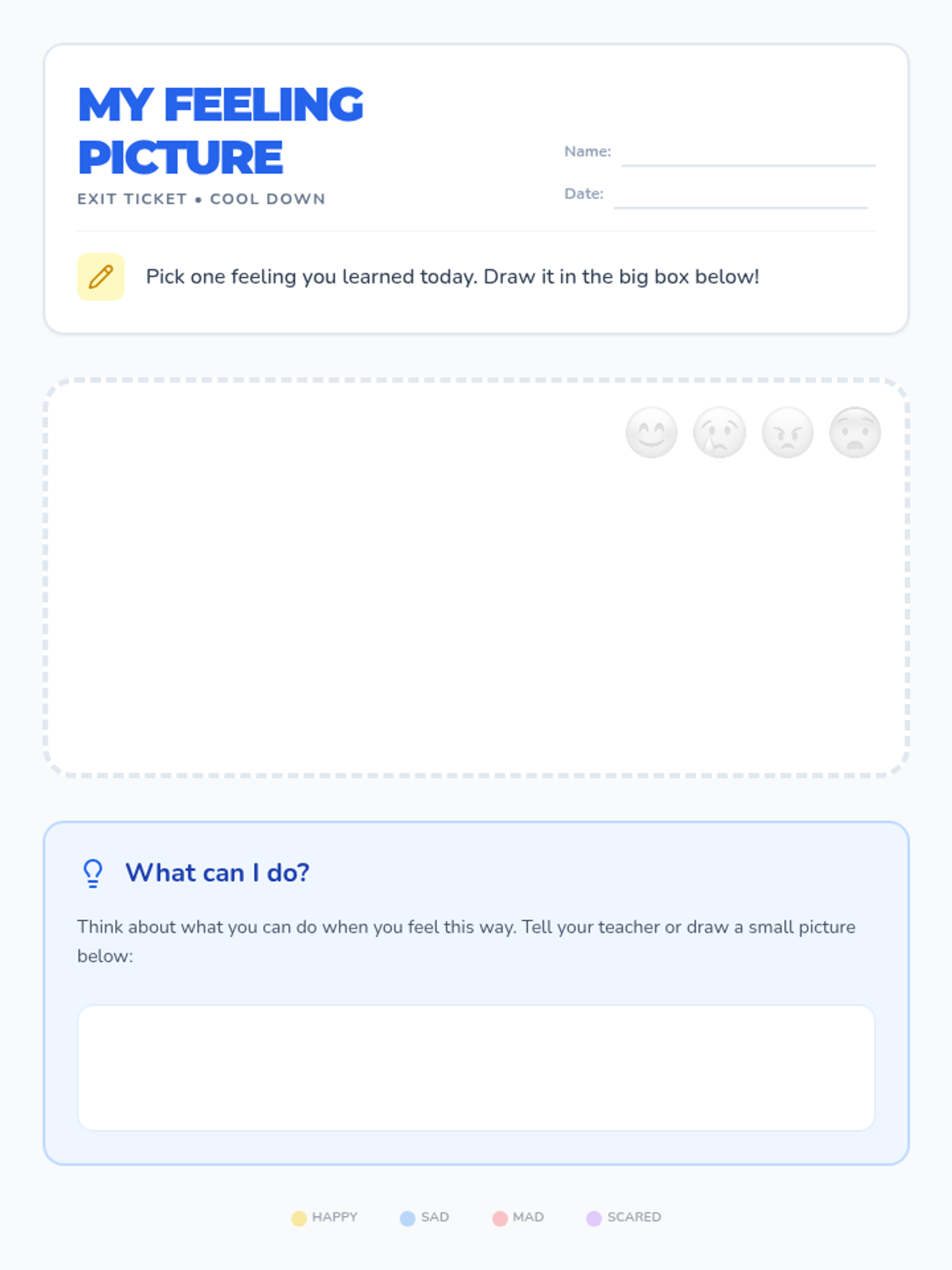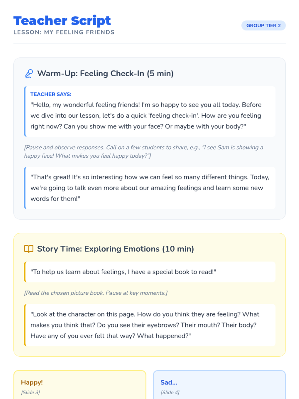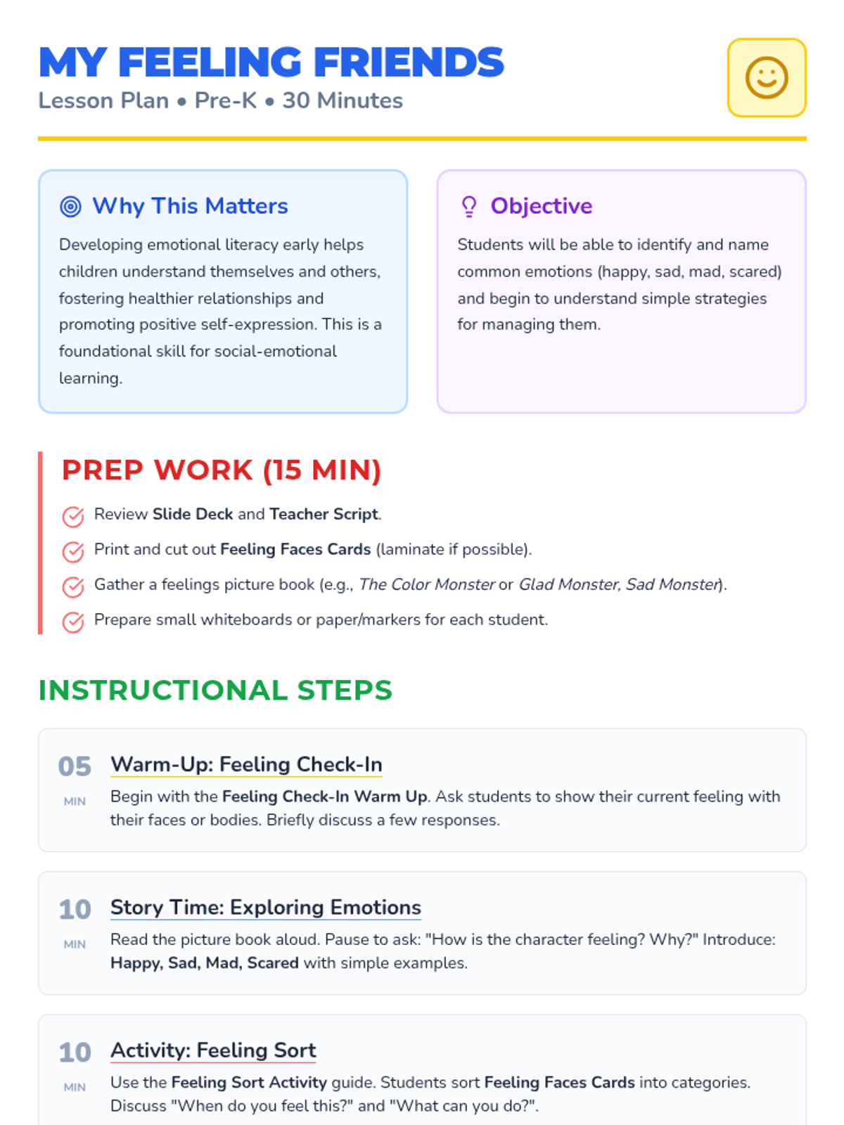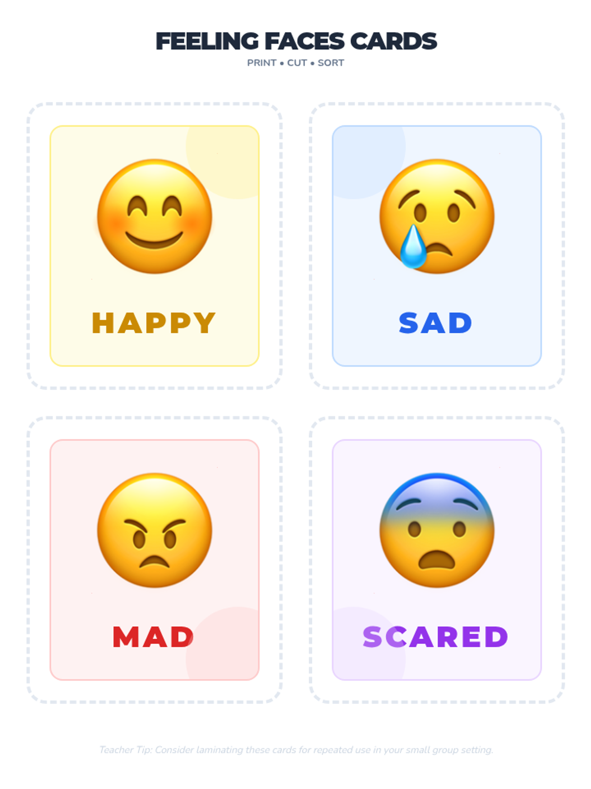 A 30-minute Tier 2 small group lesson for Pre-K students to identify and manage core emotions (happy, sad, mad, scared) through story, sorting, and drawing.