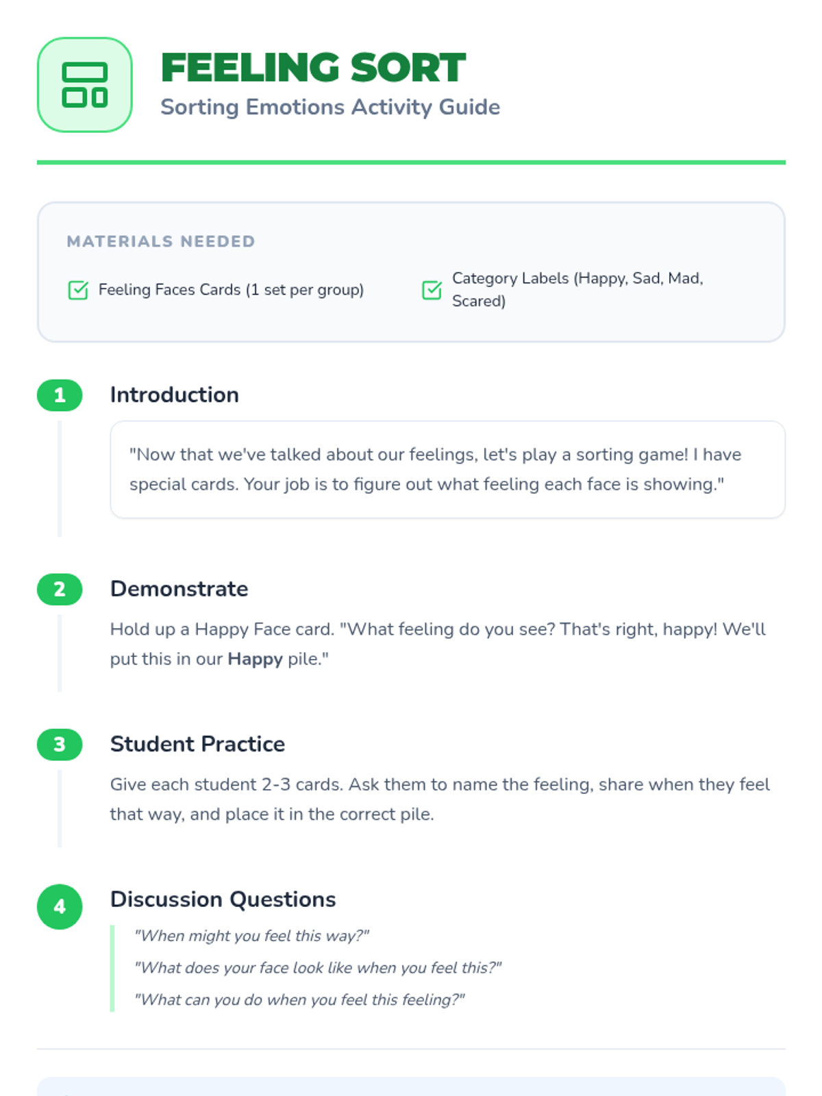 Students will explore 'emotion families' to expand their vocabulary beyond basic feeling words. They will analyze picture scenes to identify nuanced emotions and sort various feeling words into appropriate categories.