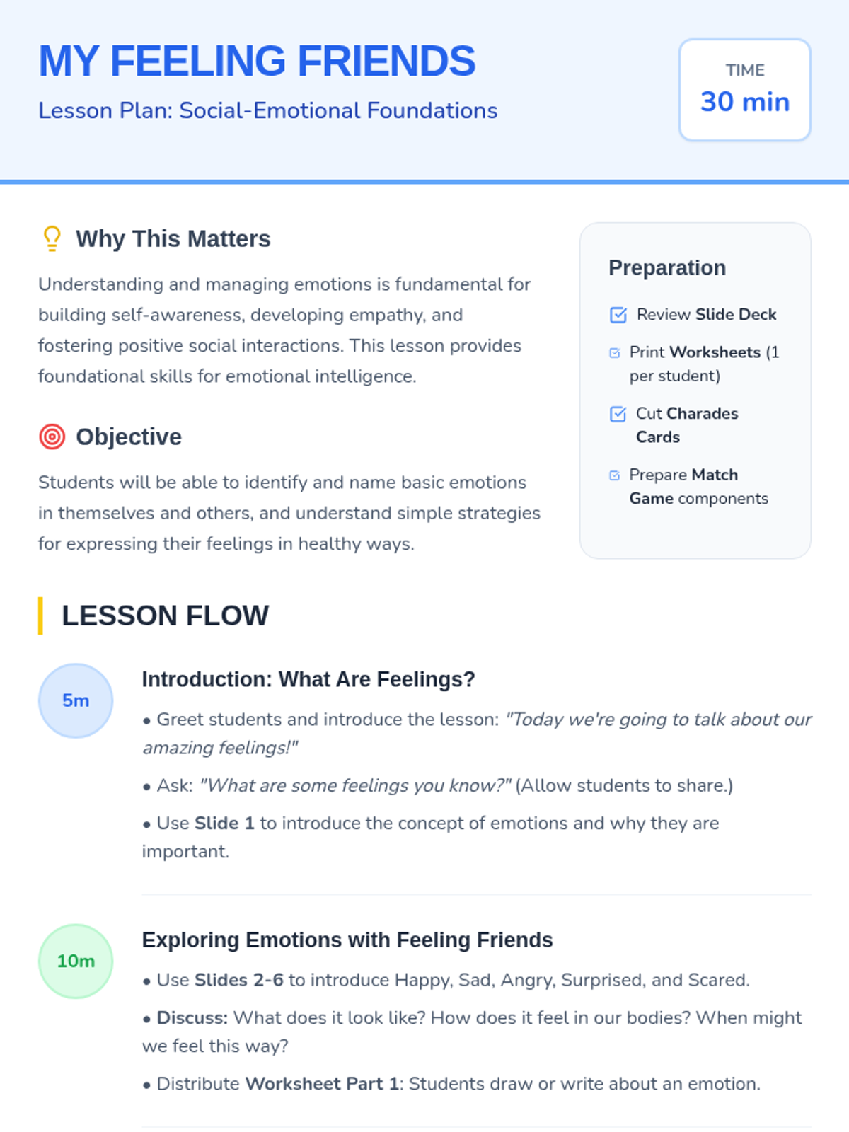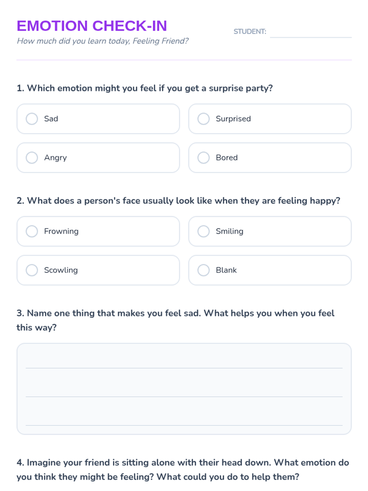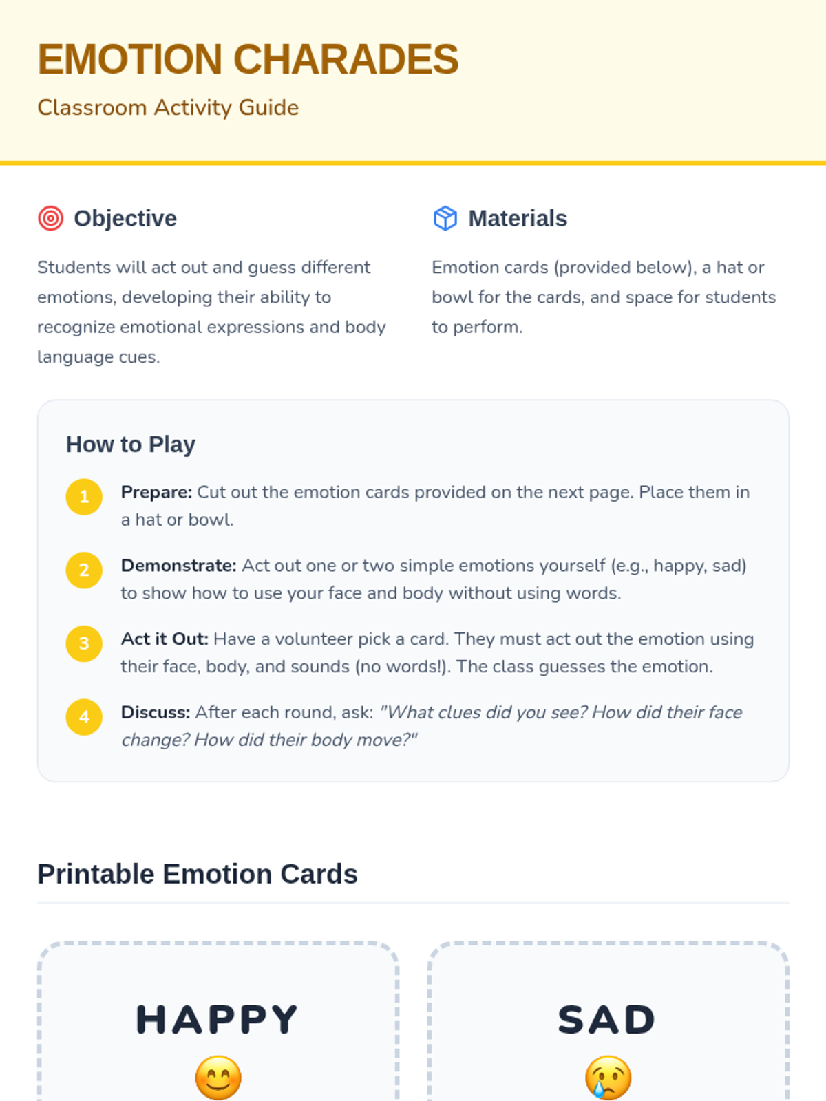 A 30-minute Social-Emotional Learning lesson for 3rd and 4th graders to help them identify, name, and understand basic emotions in themselves and others.