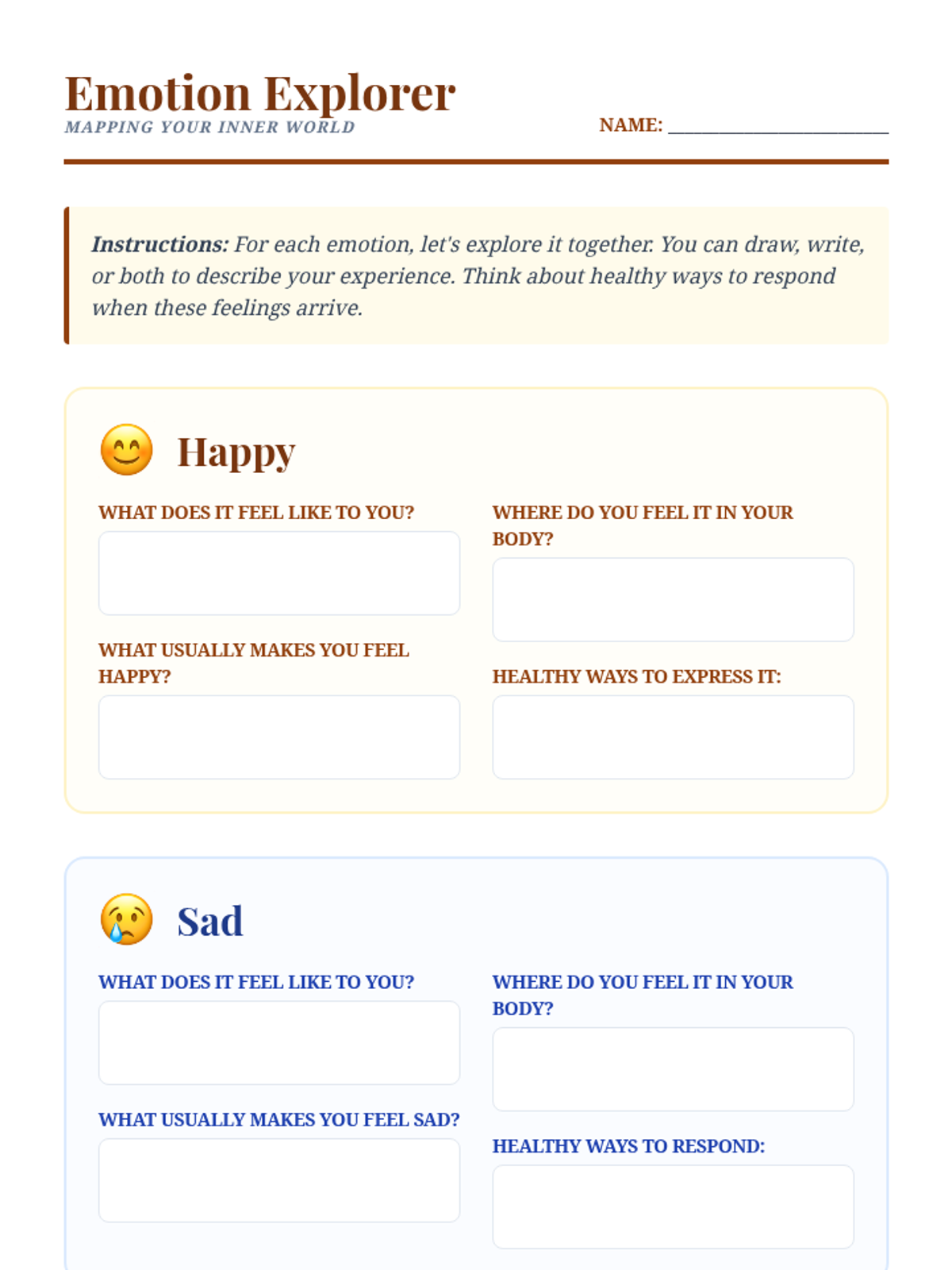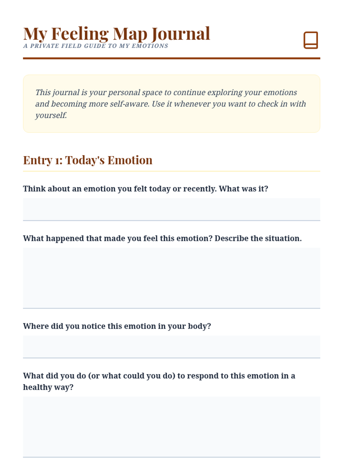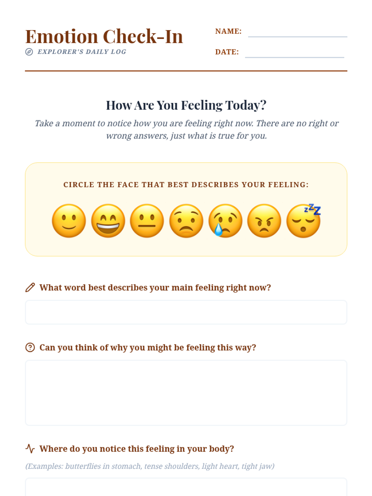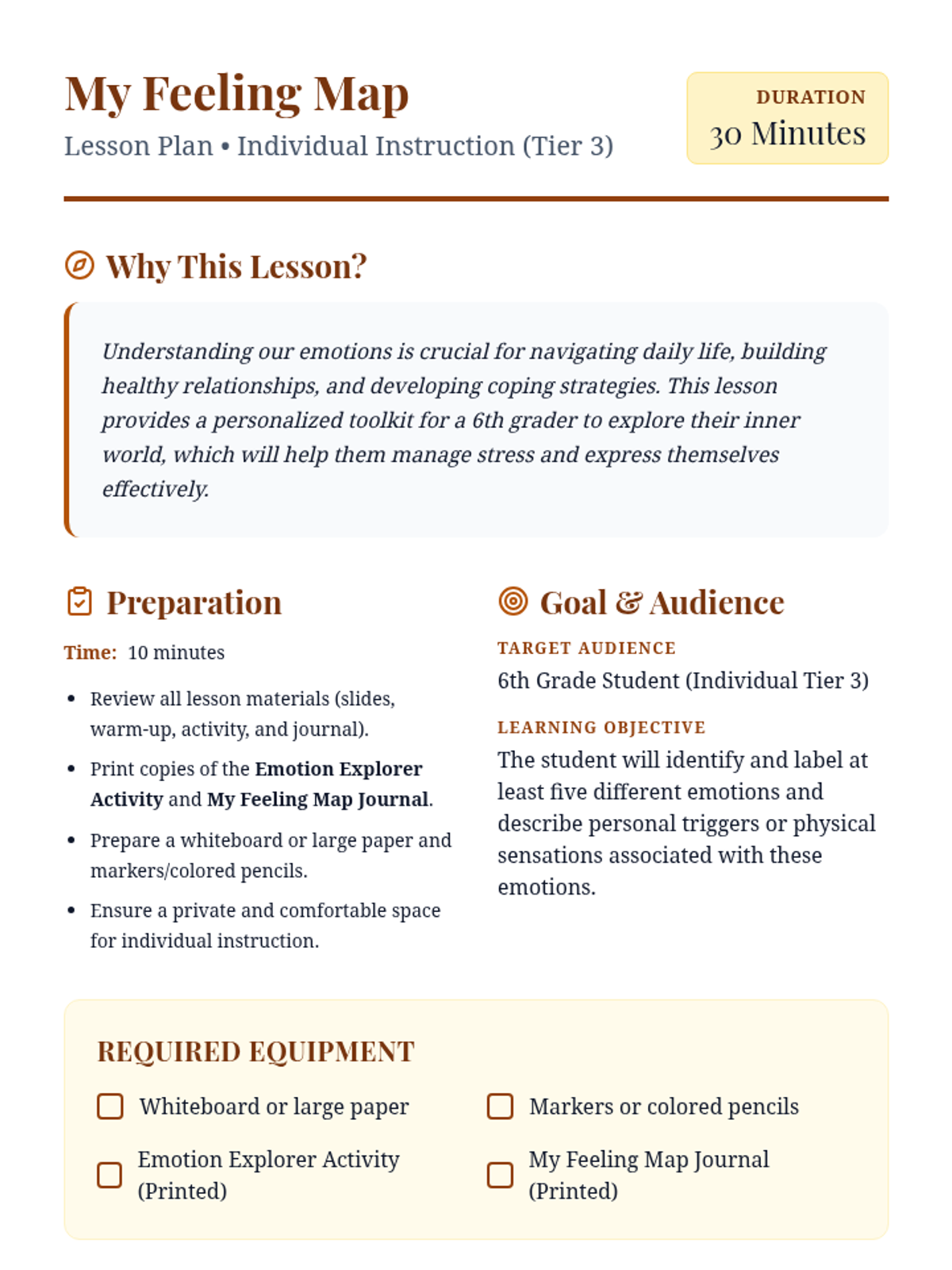 An interactive individual lesson for a 6th grader to explore and identify their emotions and develop self-awareness through a "feeling map" metaphor.