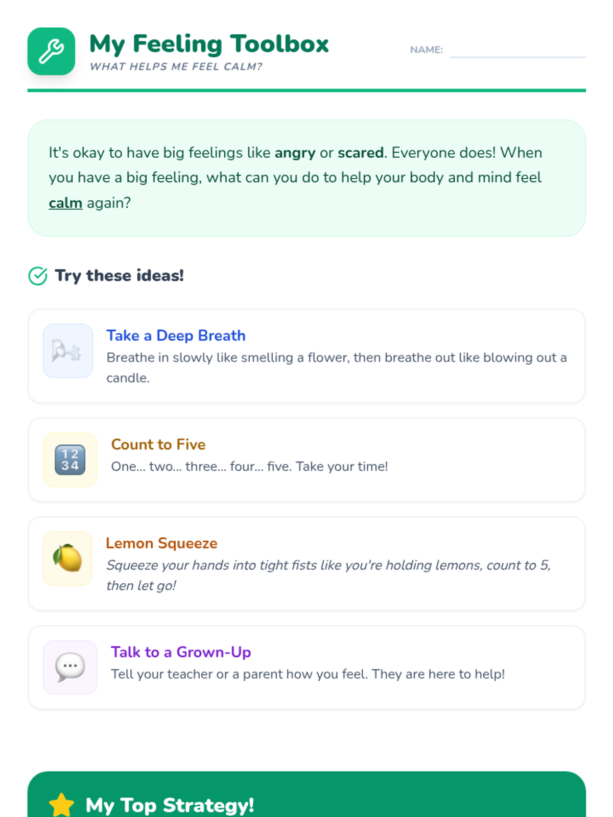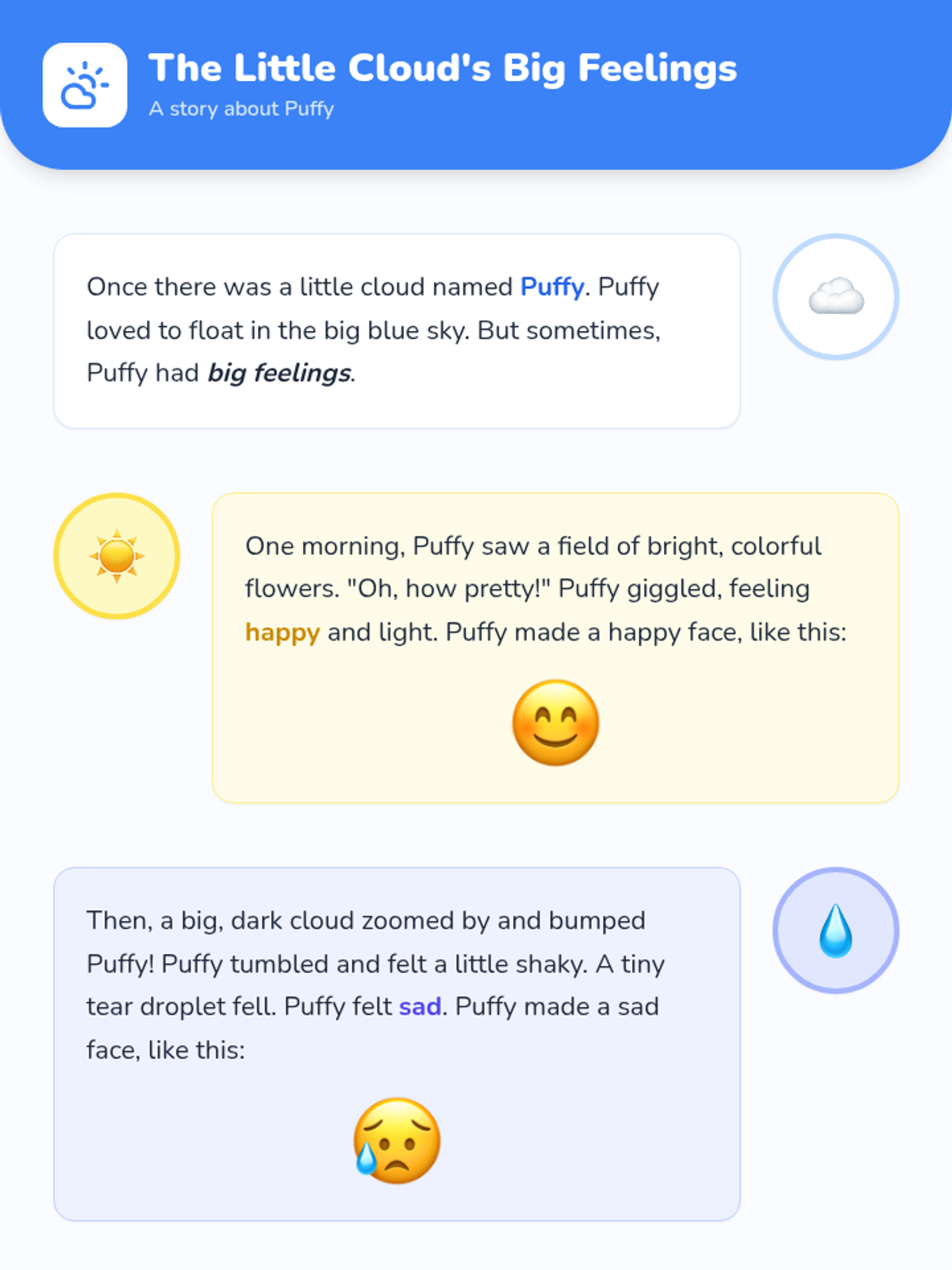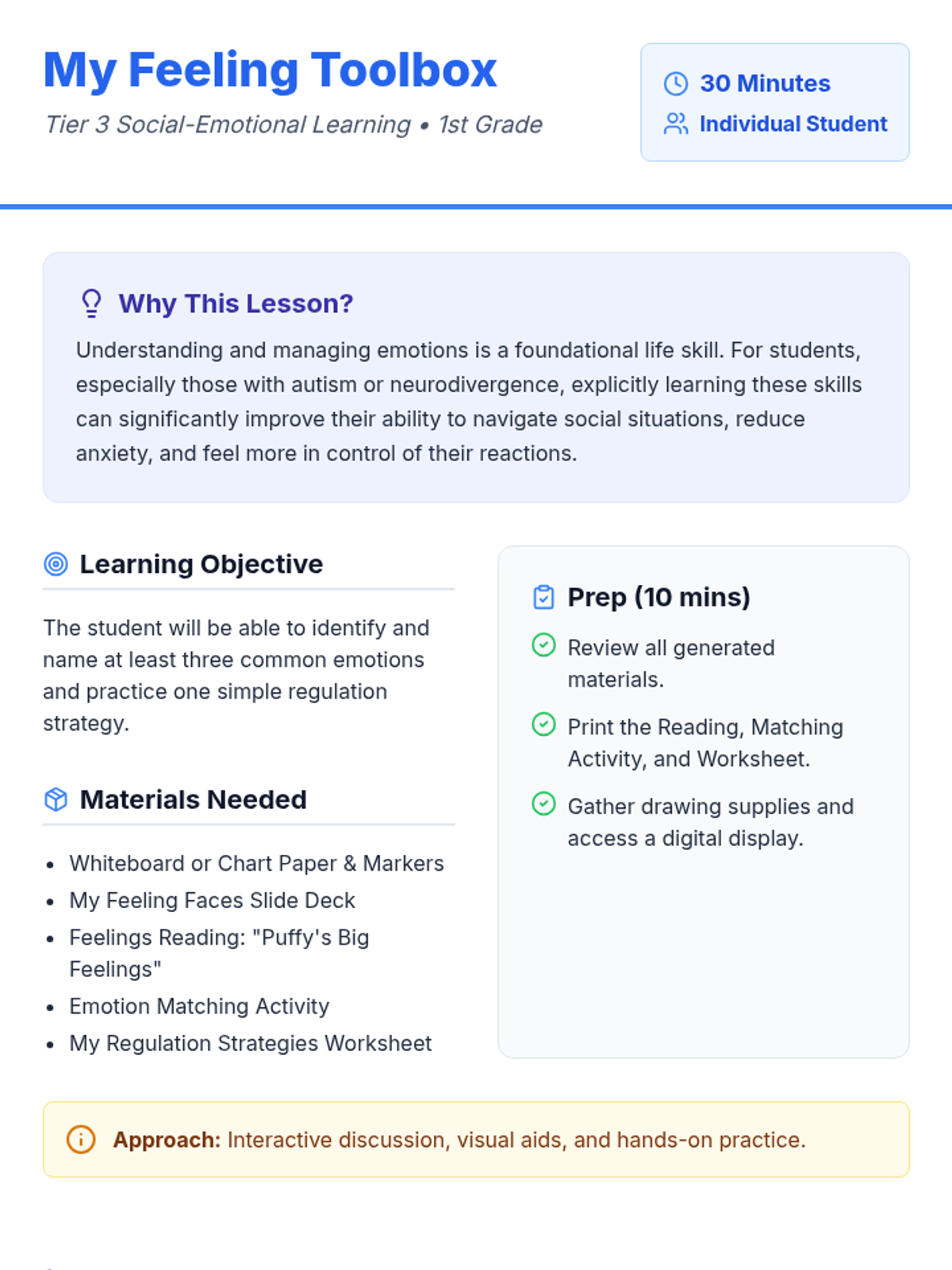 A 30-minute Tier 3 intervention for 1st-grade students focused on identifying basic emotions and learning simple self-regulation strategies through a whimsical cloud-themed story and hands-on activities.