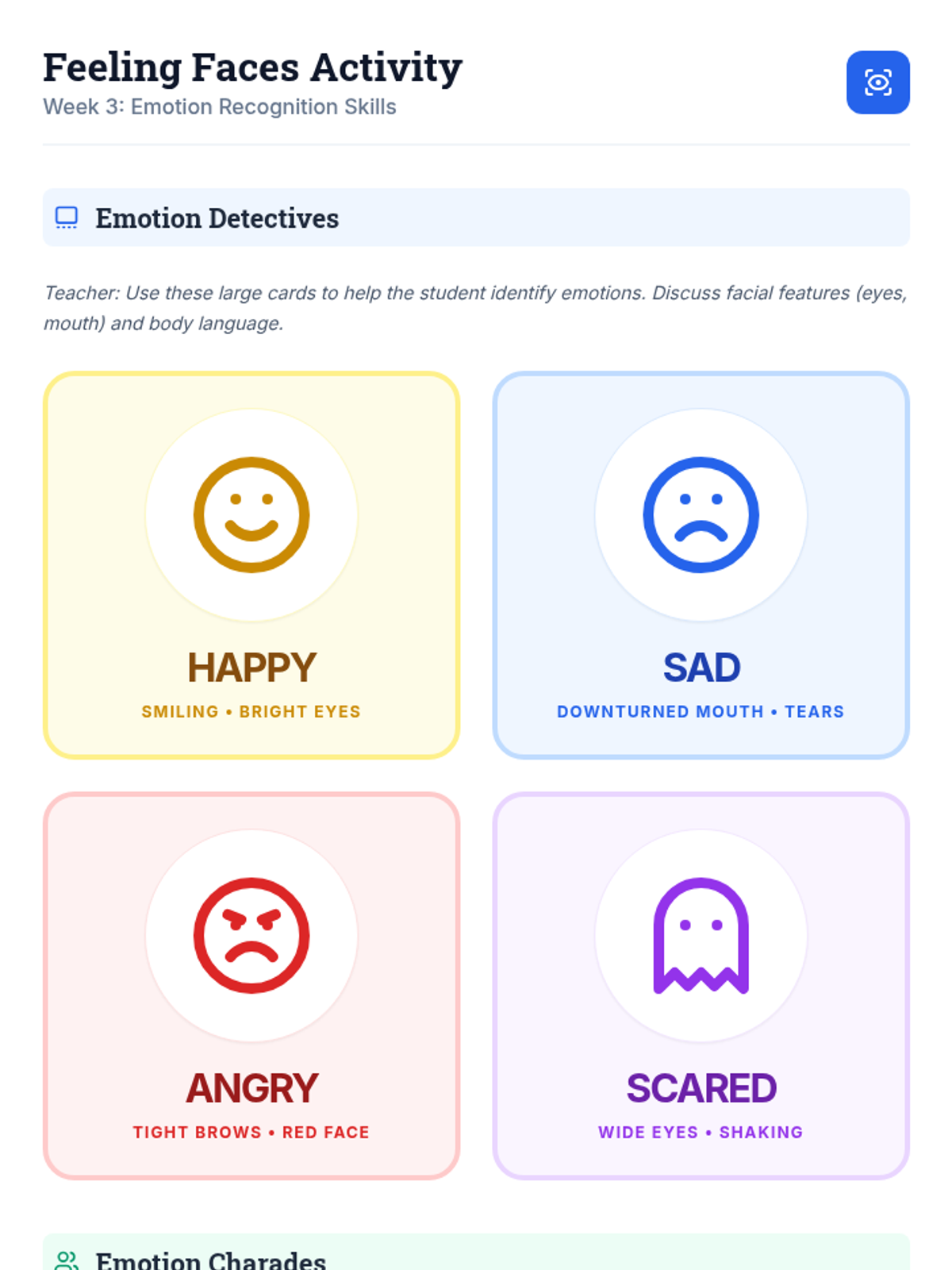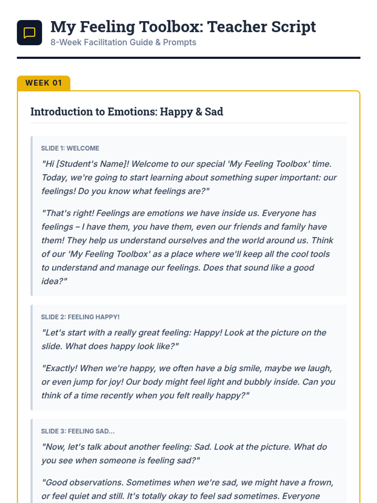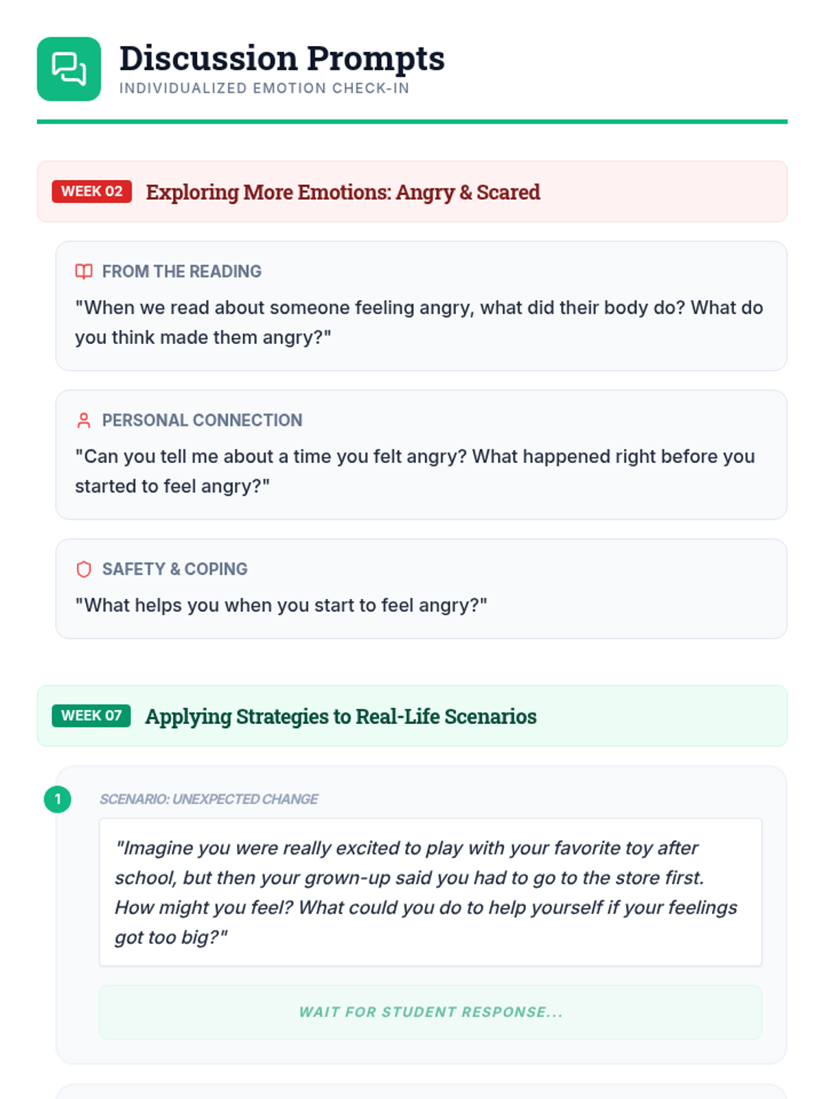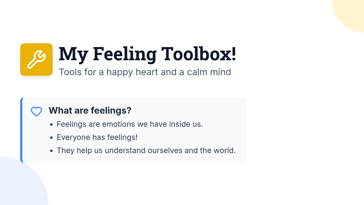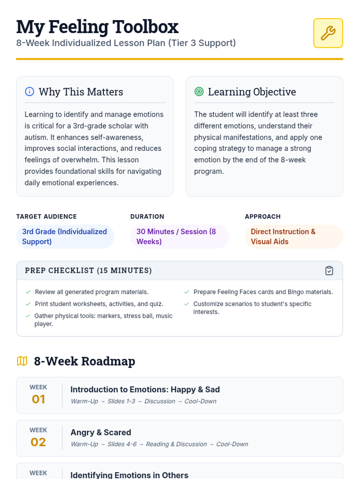 An 8-week individualized program for a 3rd-grade student with autism to identify and manage emotions using a 'toolbox' of coping strategies. Each 30-minute session focuses on self-awareness, trigger identification, and practical regulation skills.