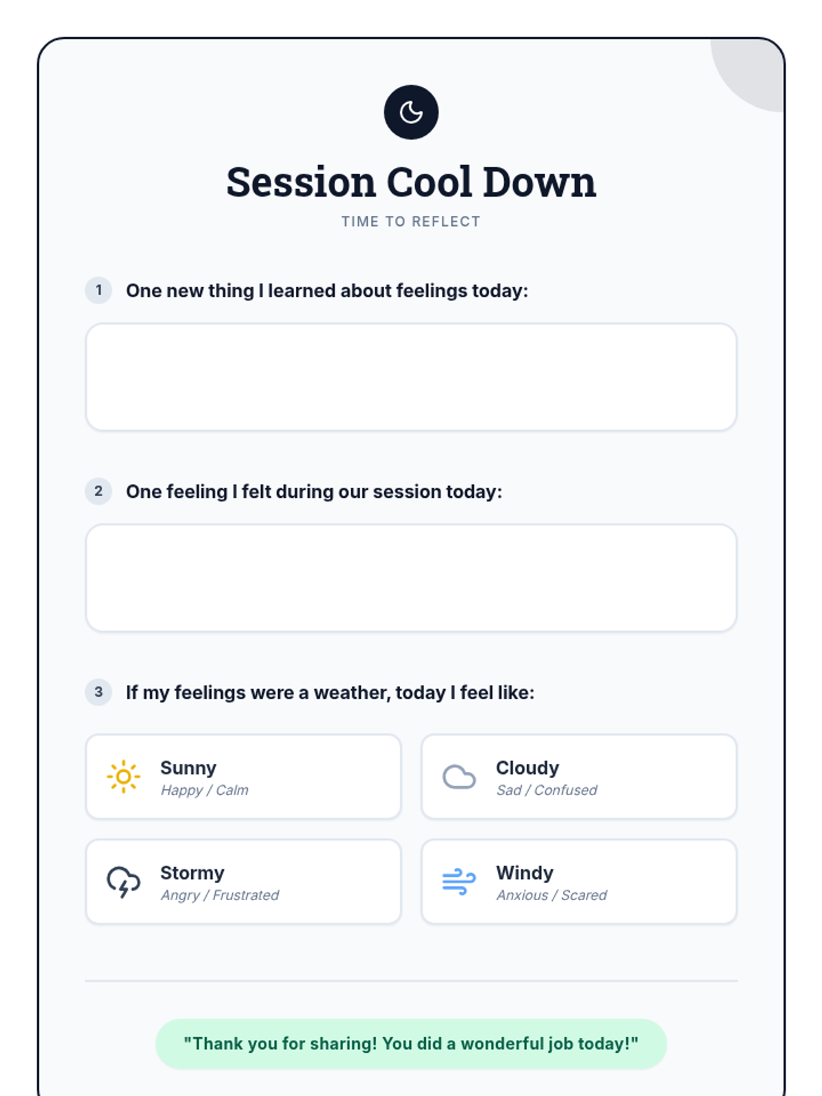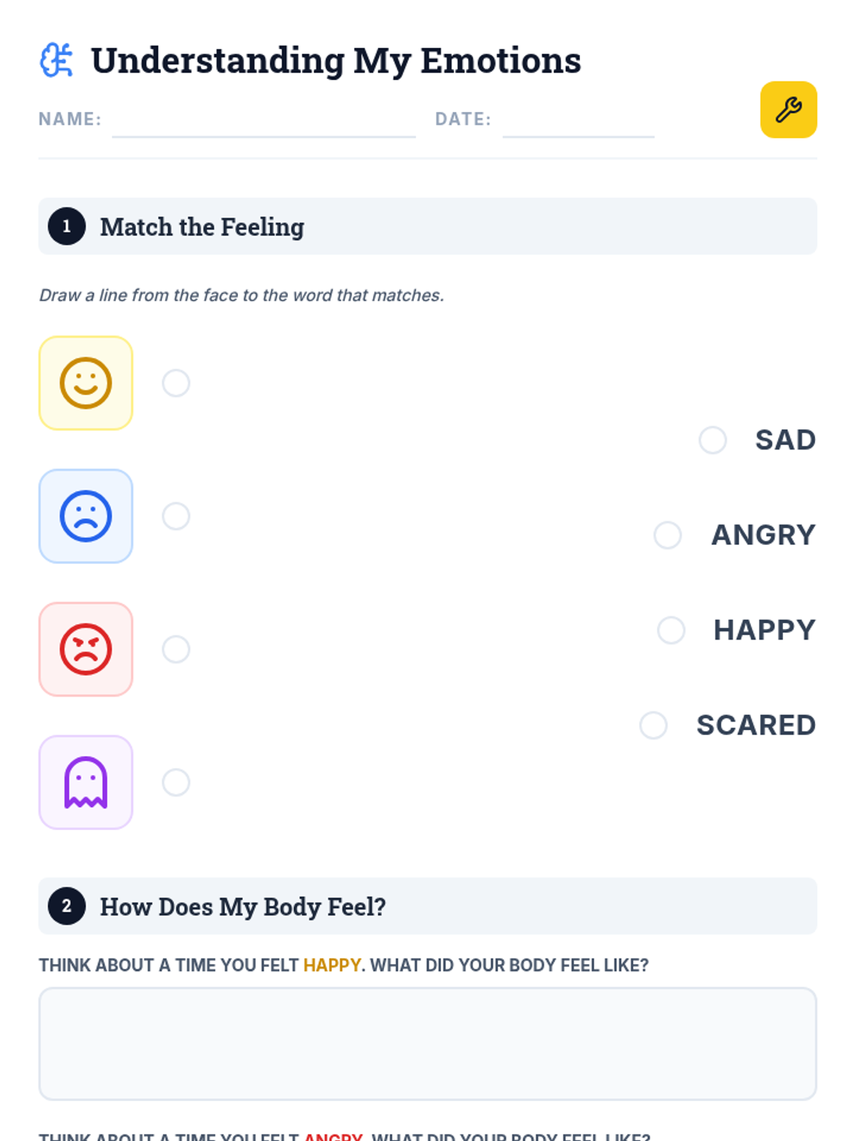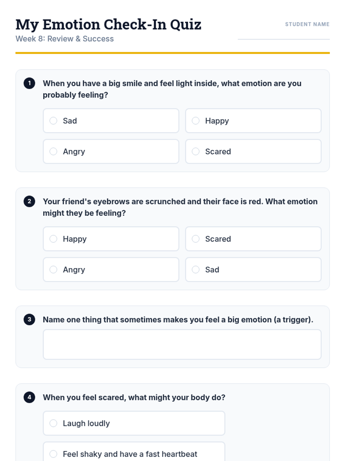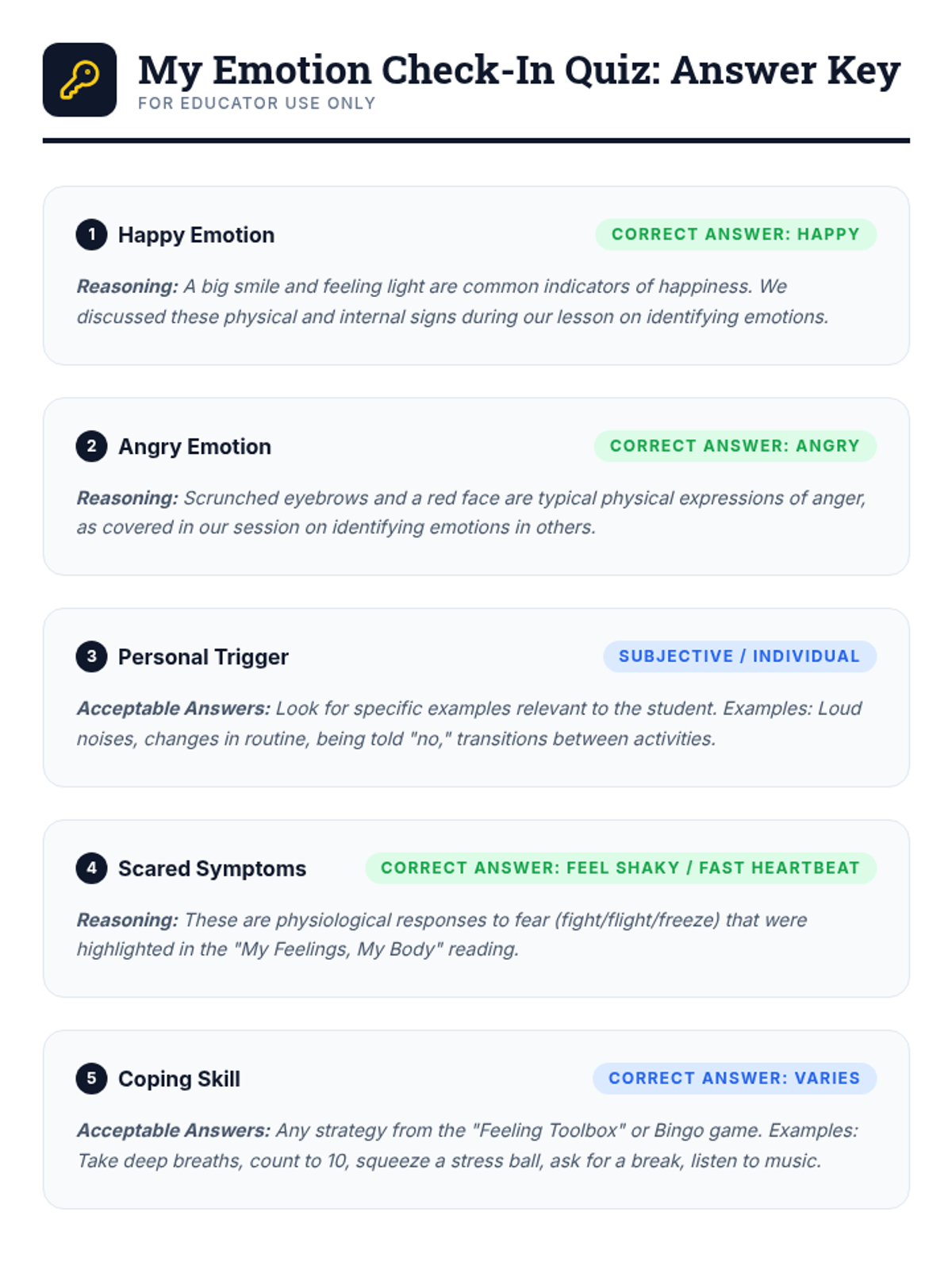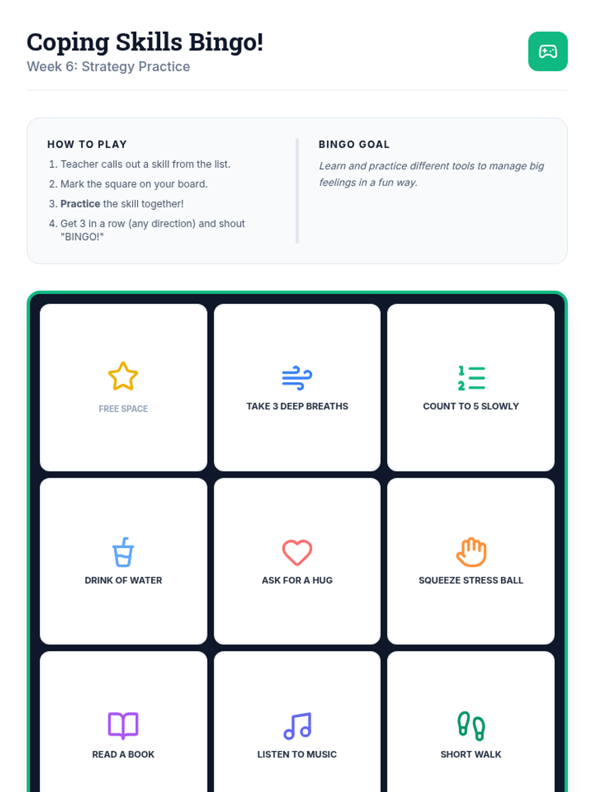 An 8-week individualized program for a 3rd-grade student with autism to identify and manage emotions using a 'toolbox' of coping strategies. Each 30-minute session focuses on self-awareness, trigger identification, and practical regulation skills.