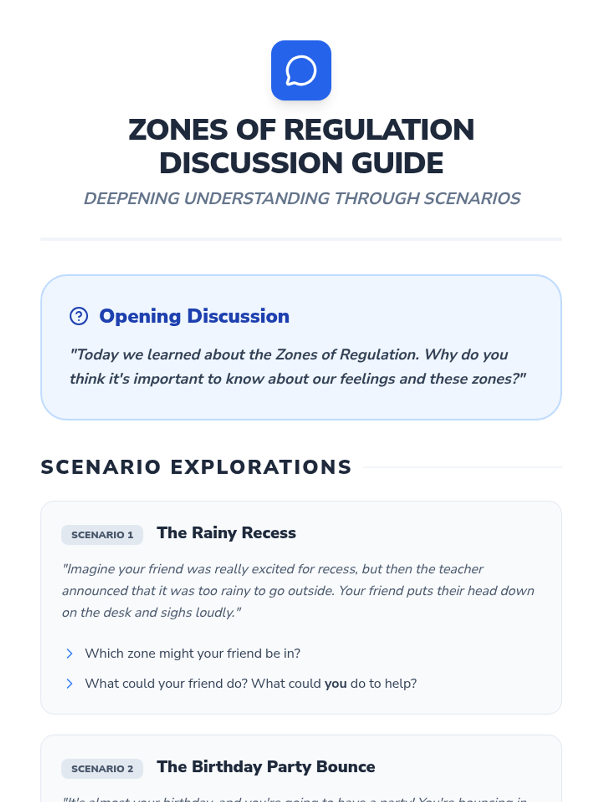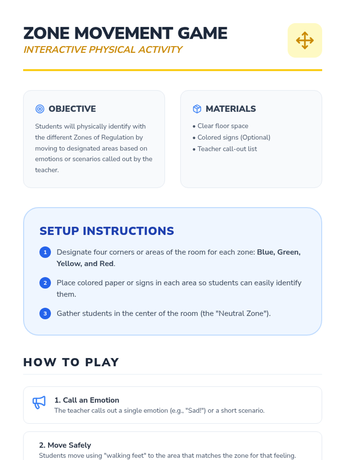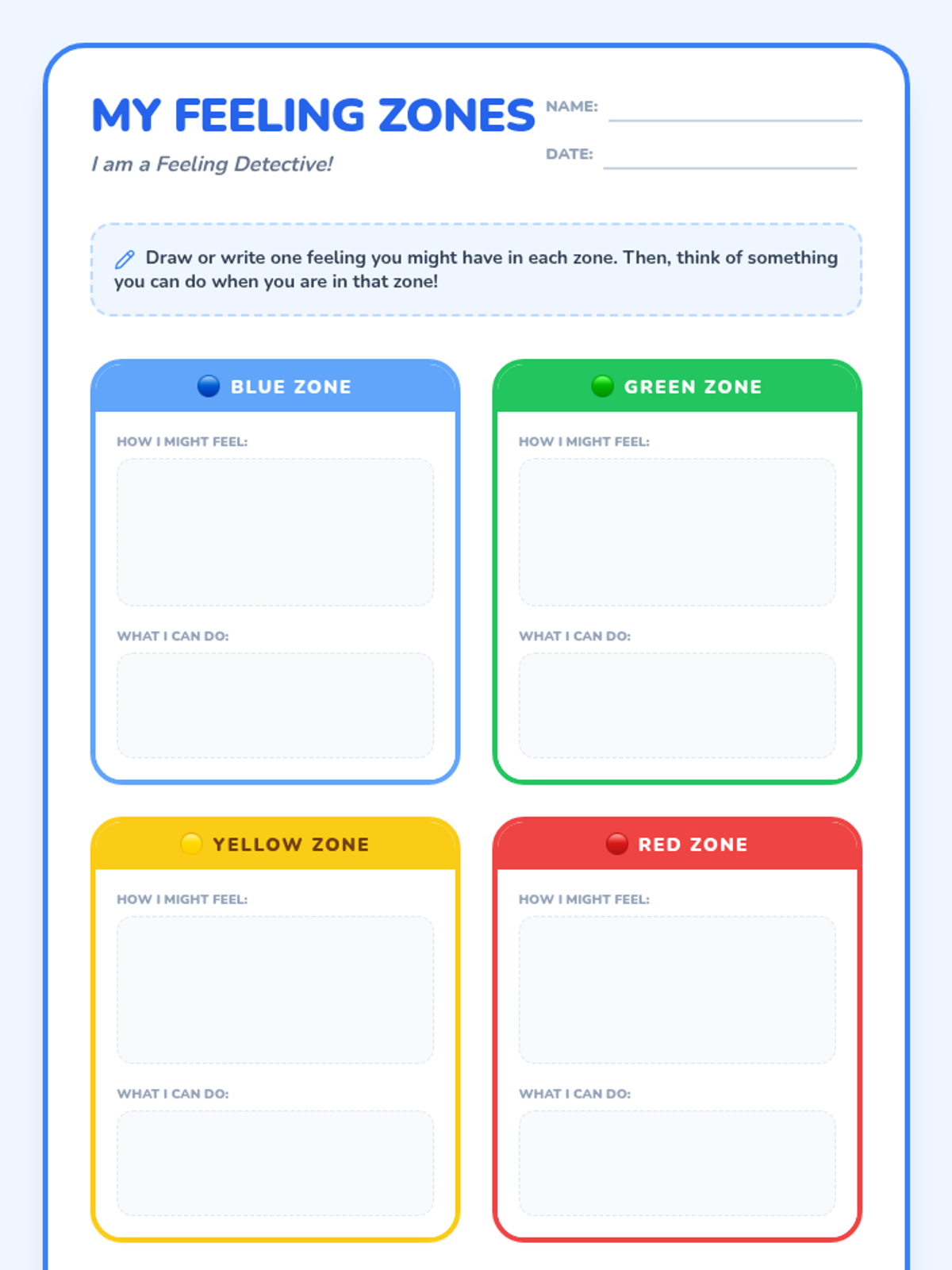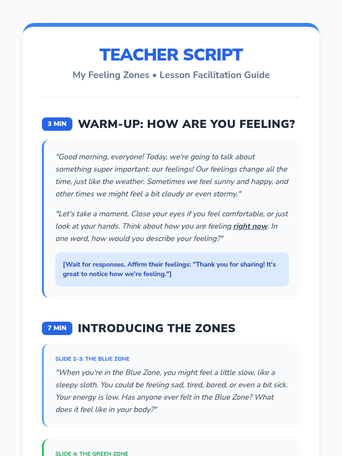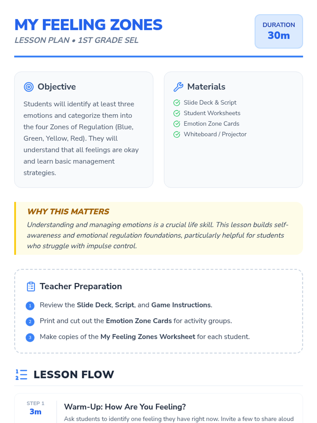 A foundational social-emotional learning lesson that introduces 1st-grade students to the Zones of Regulation. Students learn to identify and categorize their feelings into four color-coded zones to better manage their behavior and reactions.