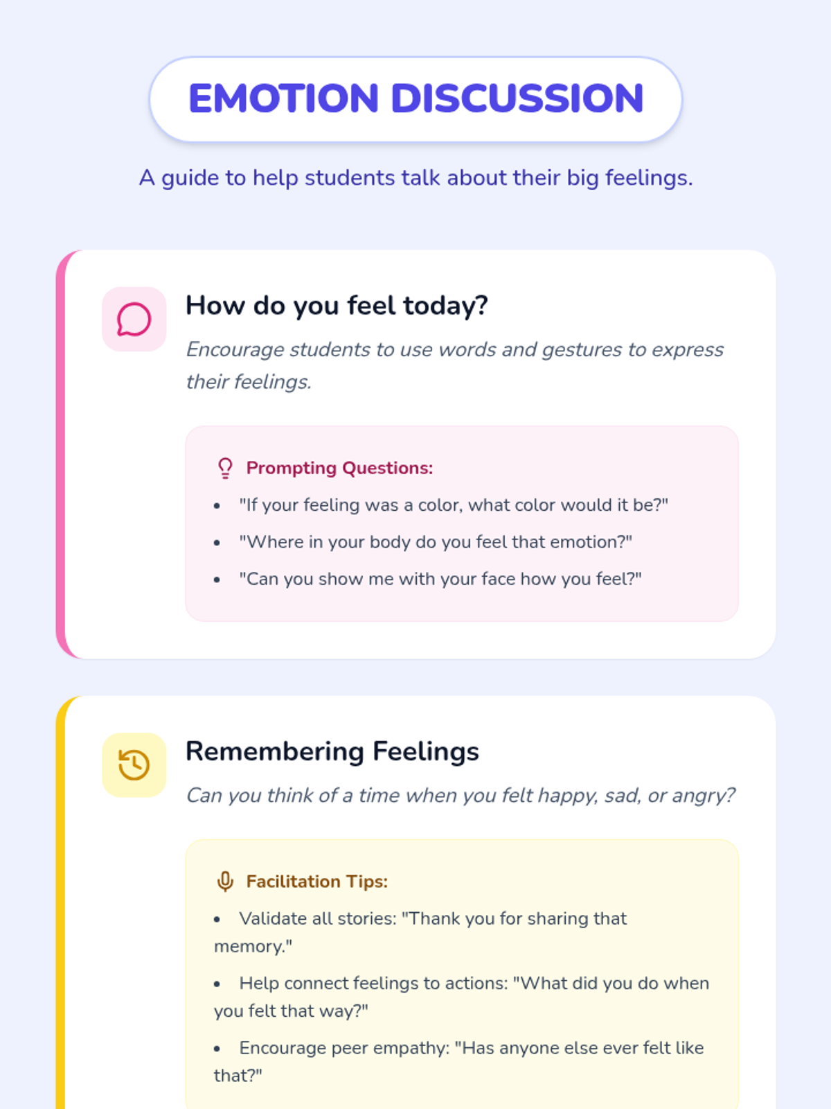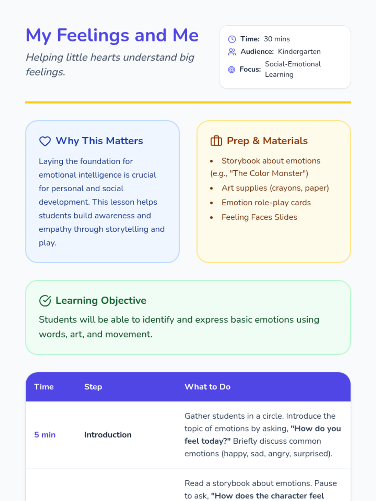 This lesson introduces kindergarten students to emotions, helping them identify and express their feelings through art and play. Using storytelling and role-playing, students will build emotional awareness and empathy.