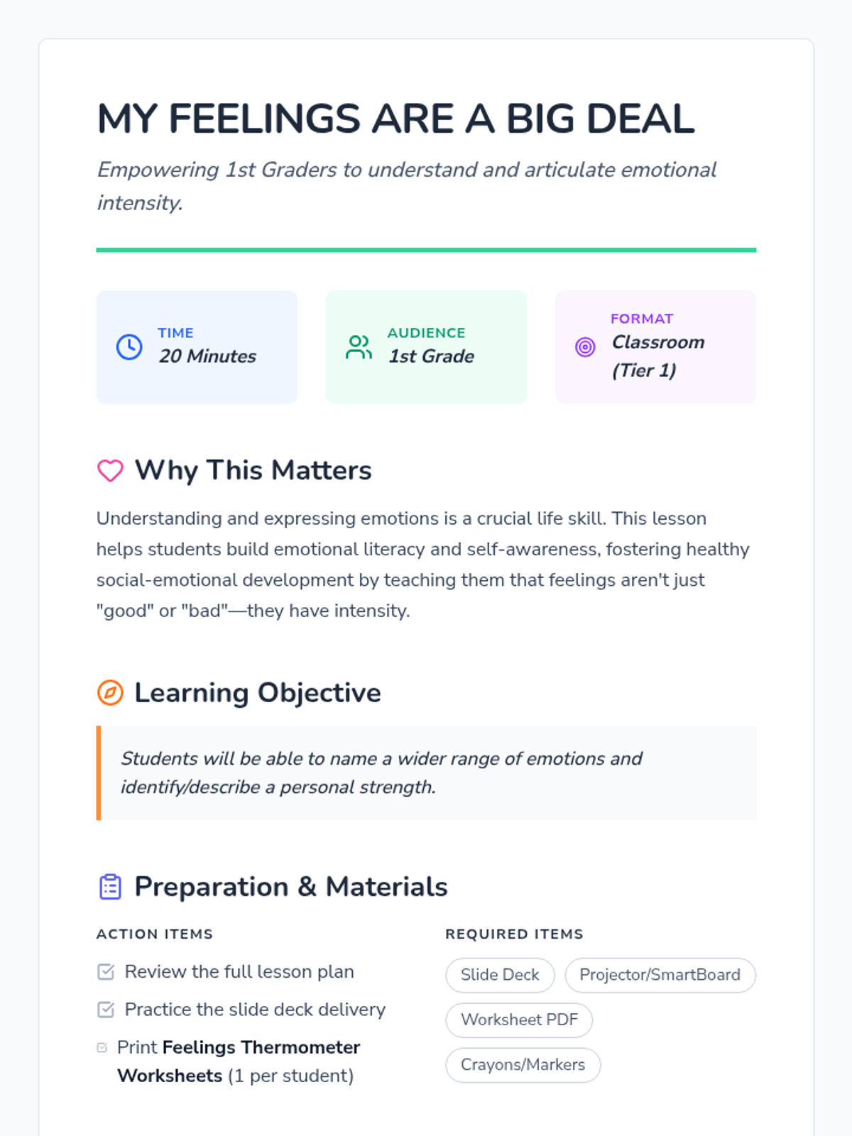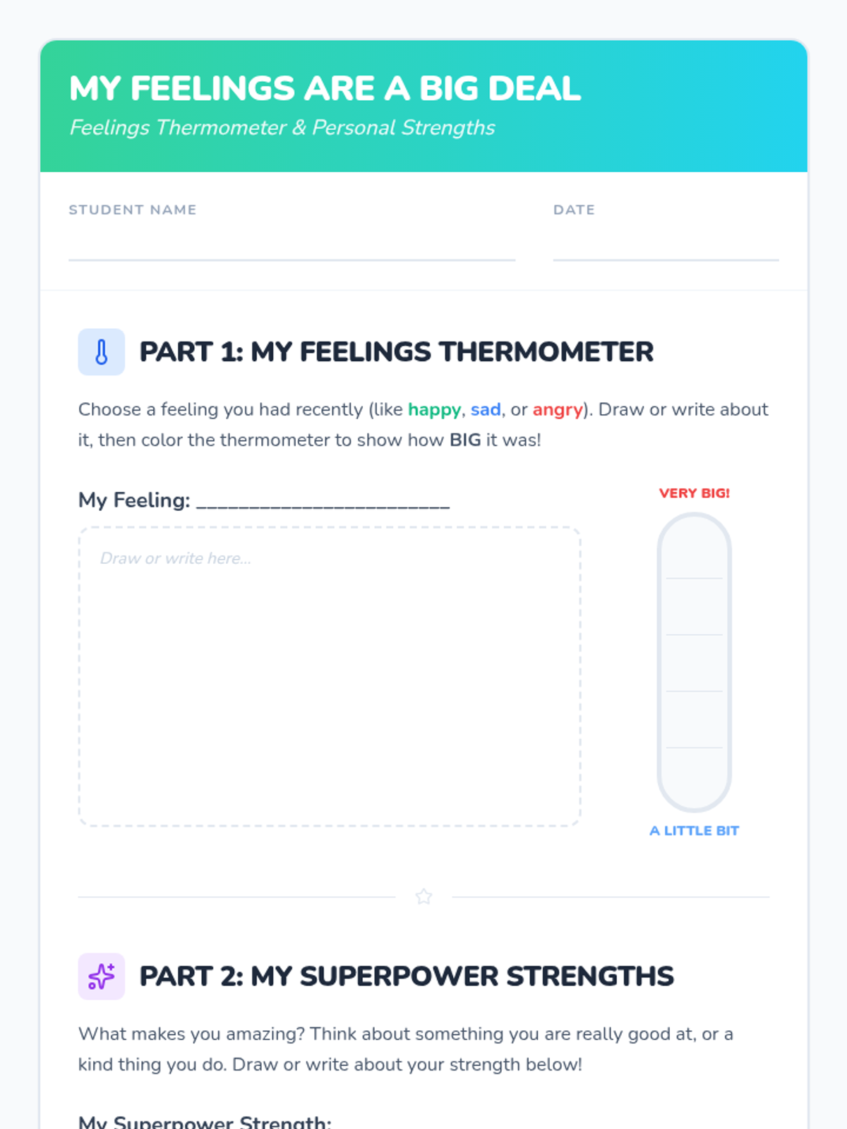 A 20-minute SEL lesson for 1st graders to explore emotional intensity and identify personal strengths using a 'feelings thermometer' concept.