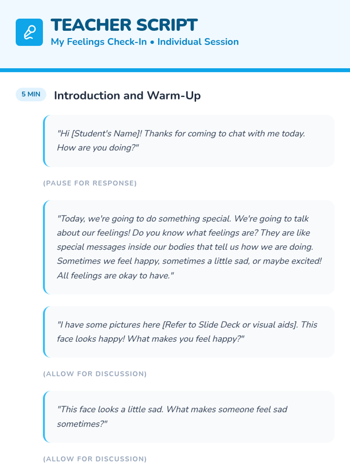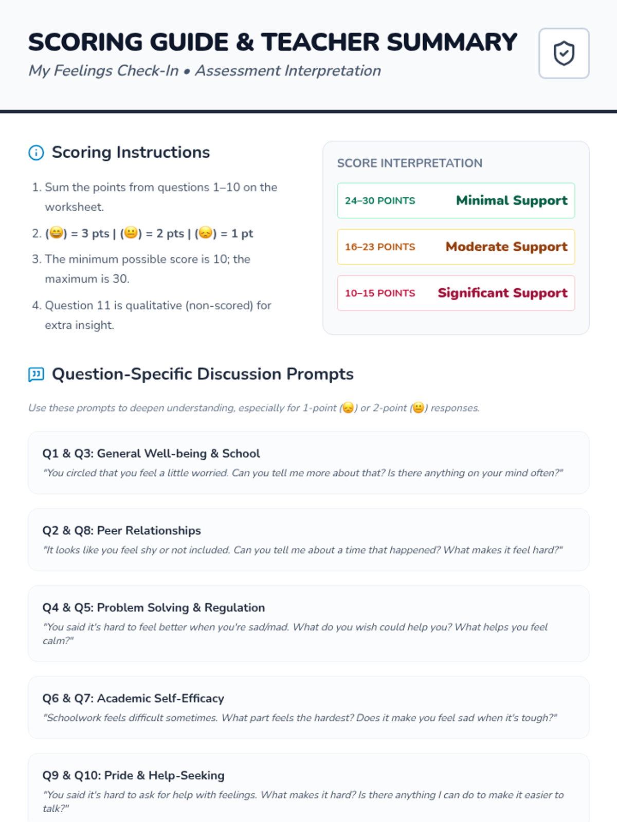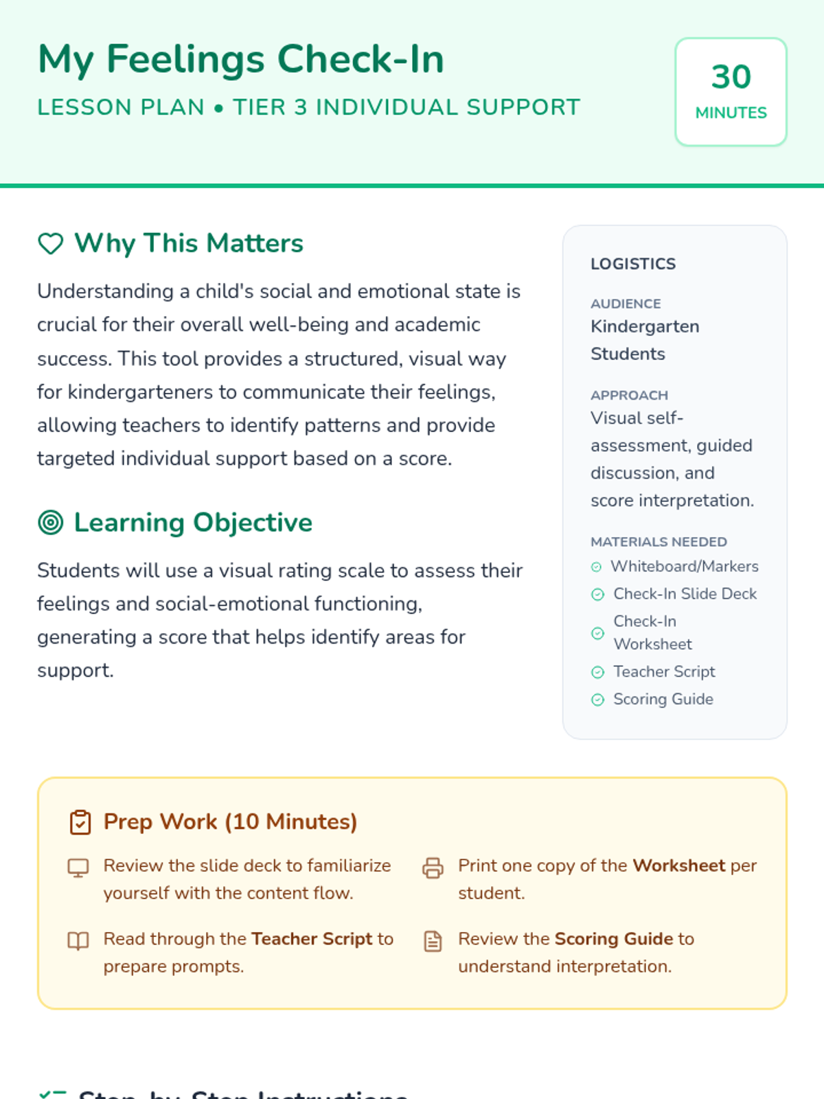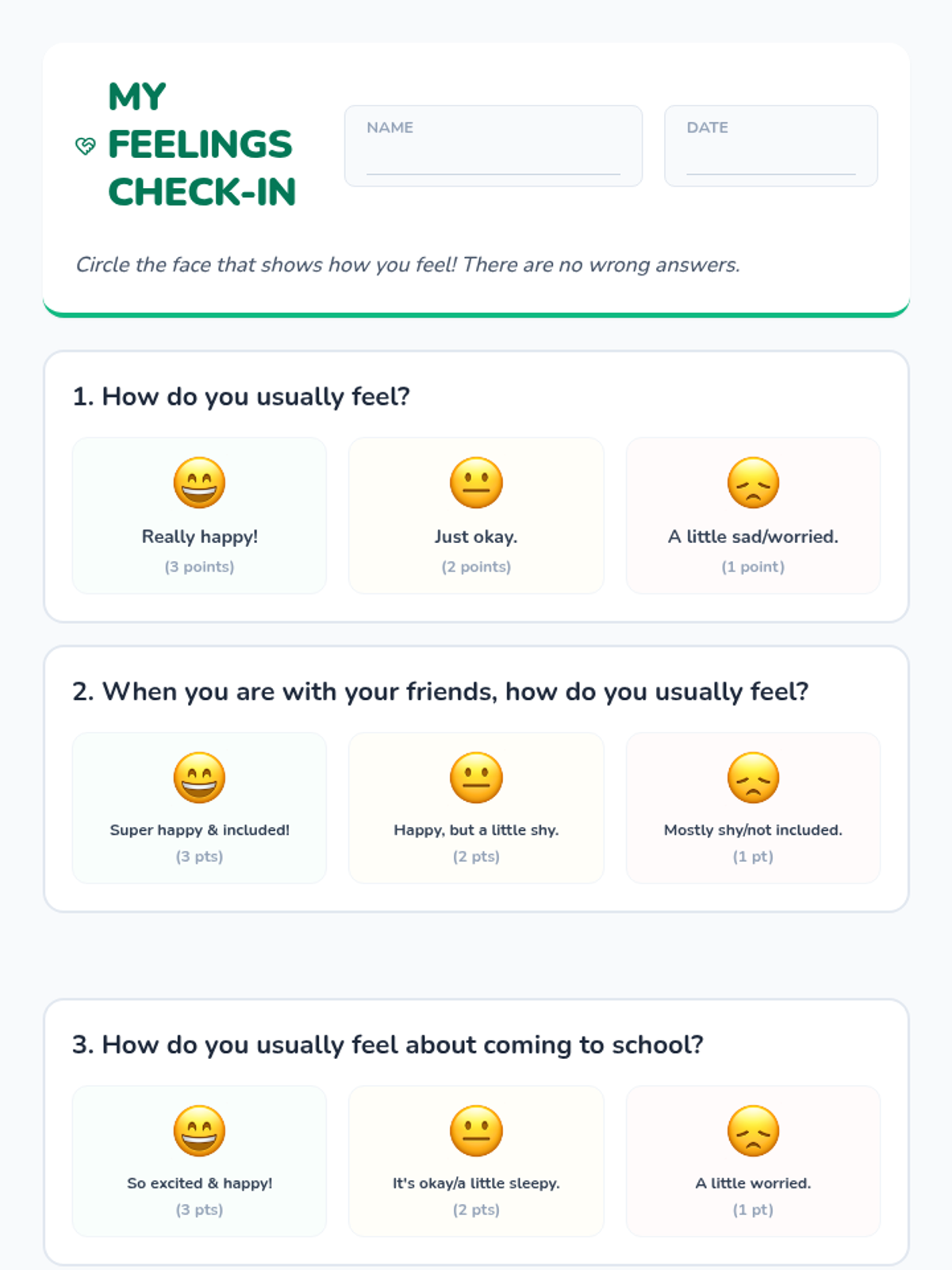 A visual self-assessment tool and guided activity for Kindergarten students to communicate their social and emotional well-being through a structured rating scale.