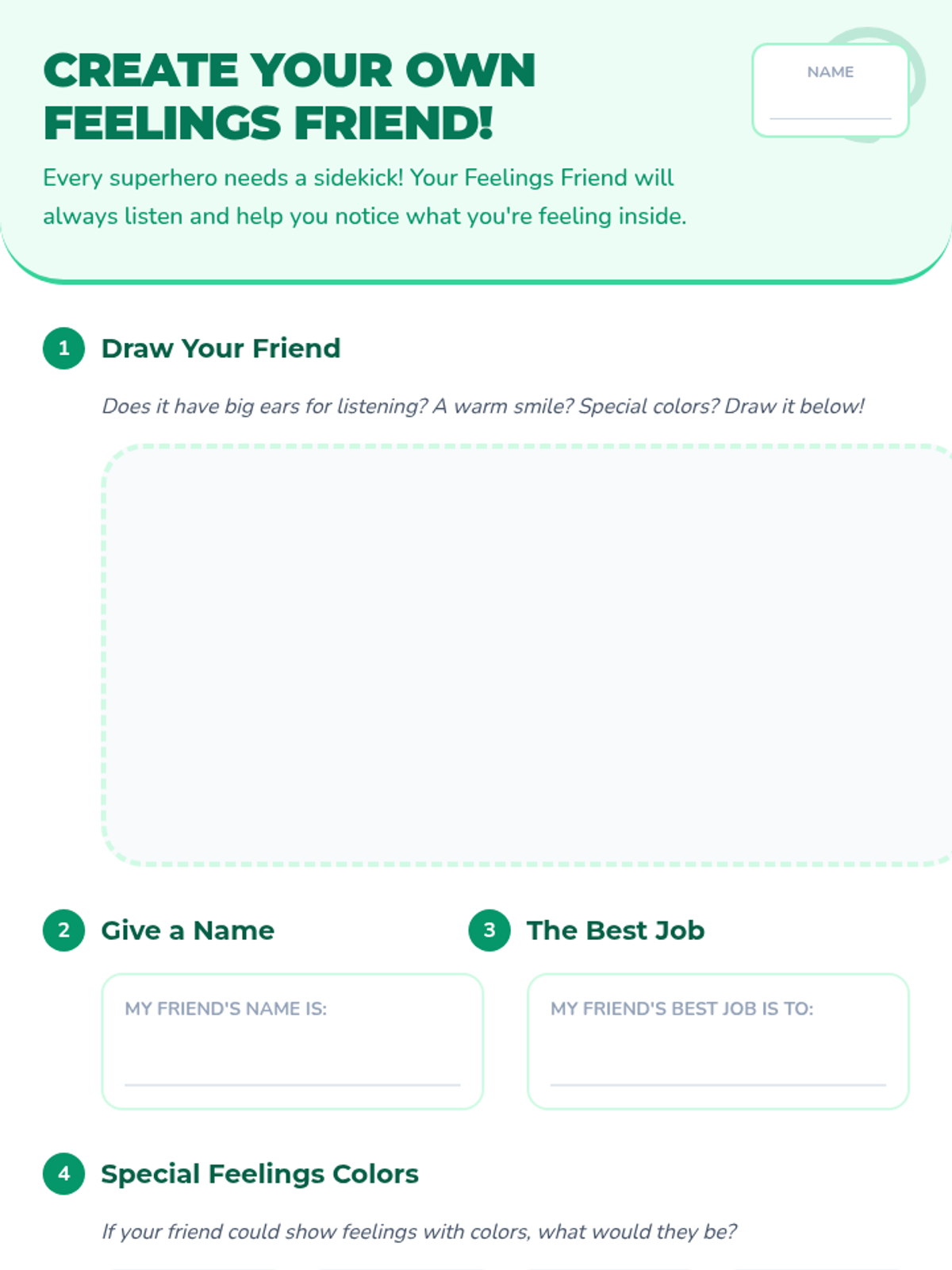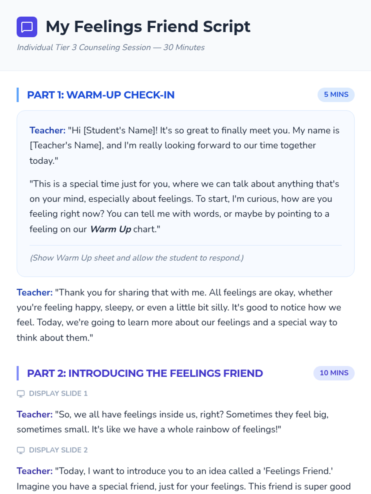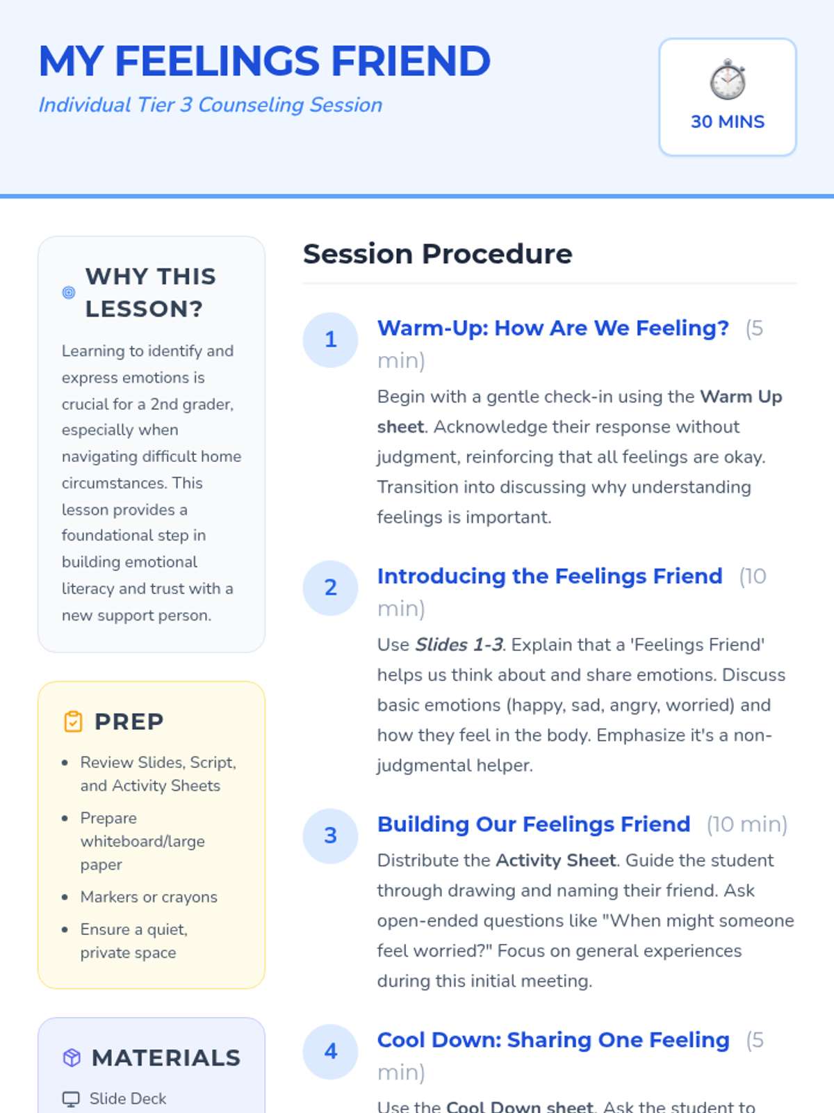 A 30-minute individual Tier 3 counseling session for a 2nd-grade student to build rapport and emotional literacy using the concept of a 'Feelings Friend.' Designed for students facing challenging home situations.