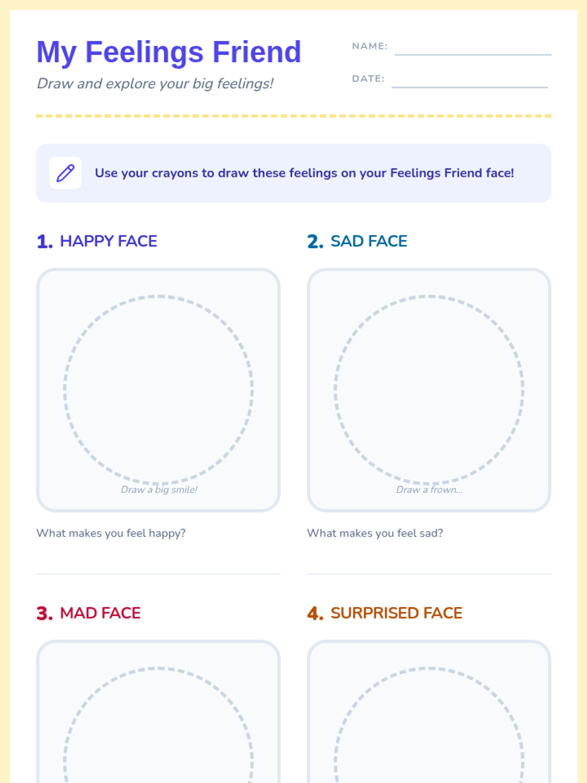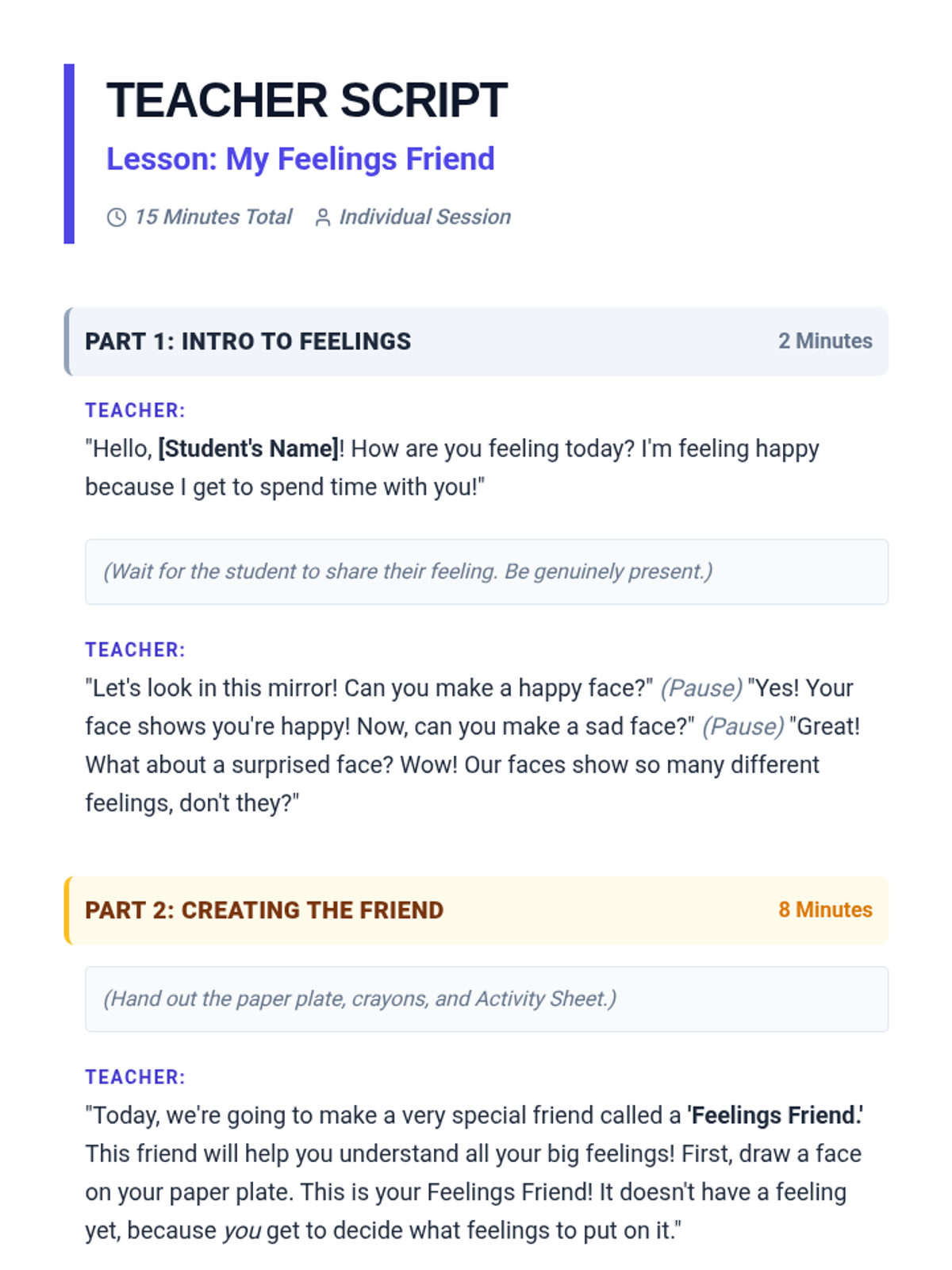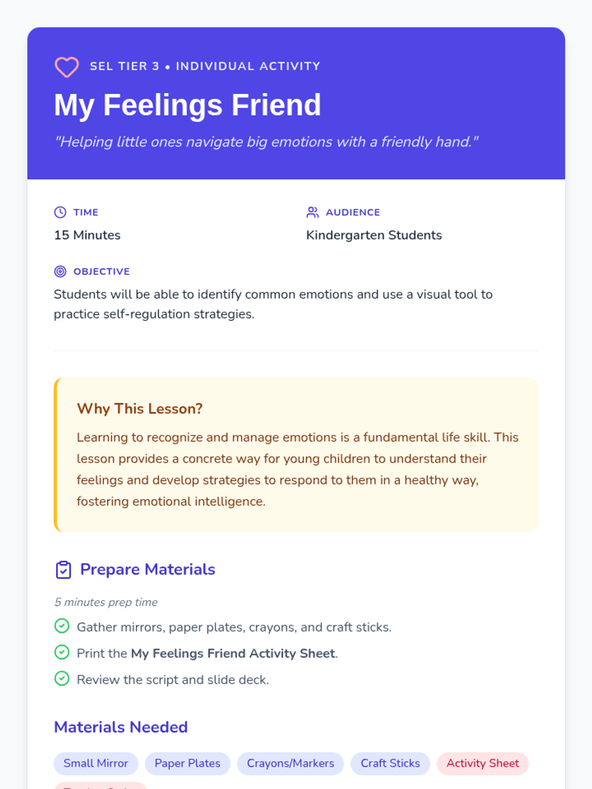 A 15-minute Tier 3 individual activity for kindergartners to identify and self-regulate emotions using a 'Feelings Friend' tool. students create a tangible visual aid and practice coping strategies through role-play.