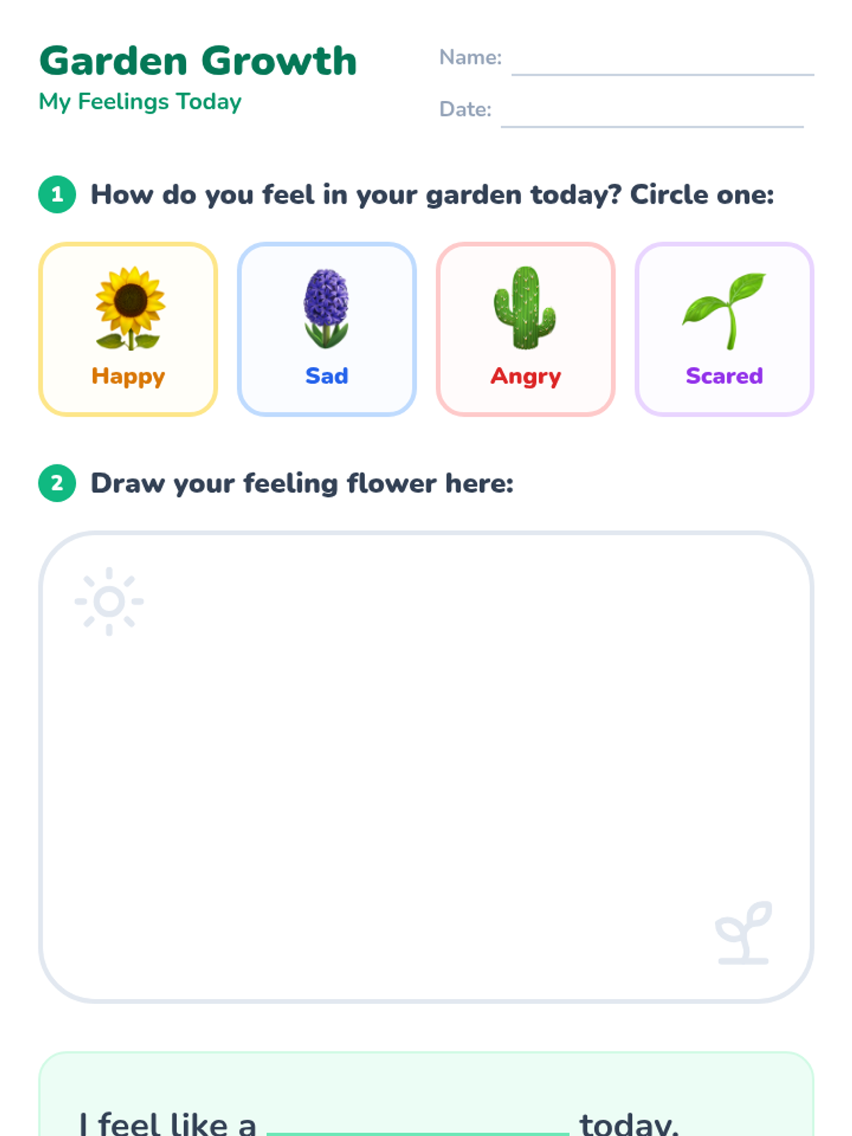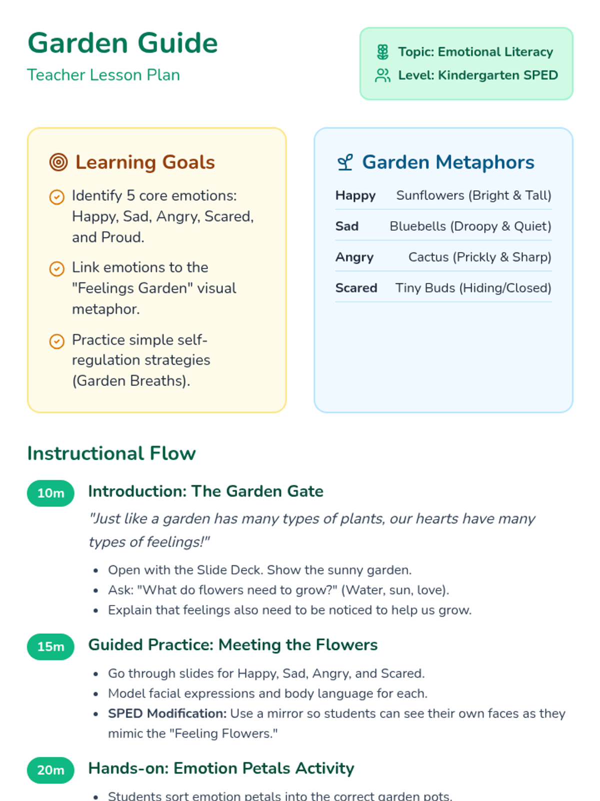 A social-emotional learning lesson for kindergarten special education students using a garden metaphor to identify and express basic emotions. Students explore 'feeling flowers' to build emotional literacy and self-regulation skills.