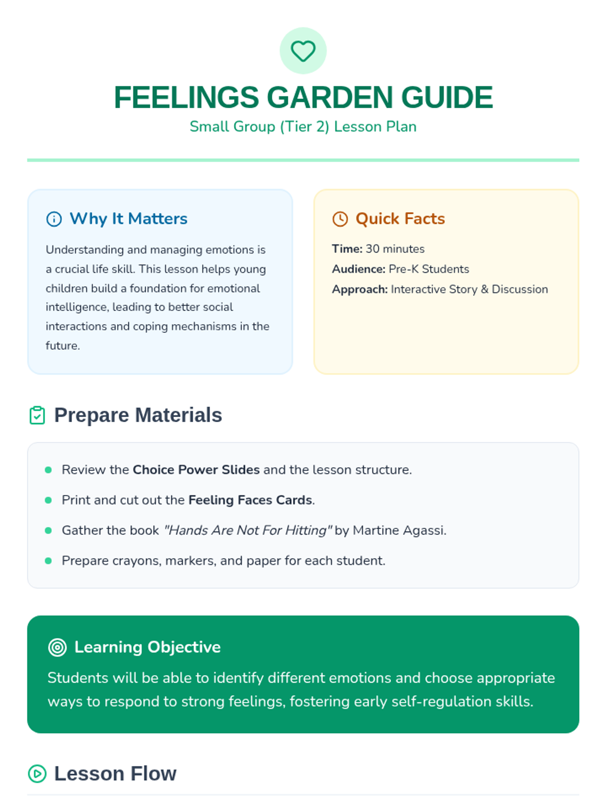 A 30-minute social-emotional learning lesson for PreK students focusing on patience and self-soothing through the metaphor of a garden. Students listen to a story, plant bean seeds, and learn strategies to handle the "waiting time" required for seeds to grow.