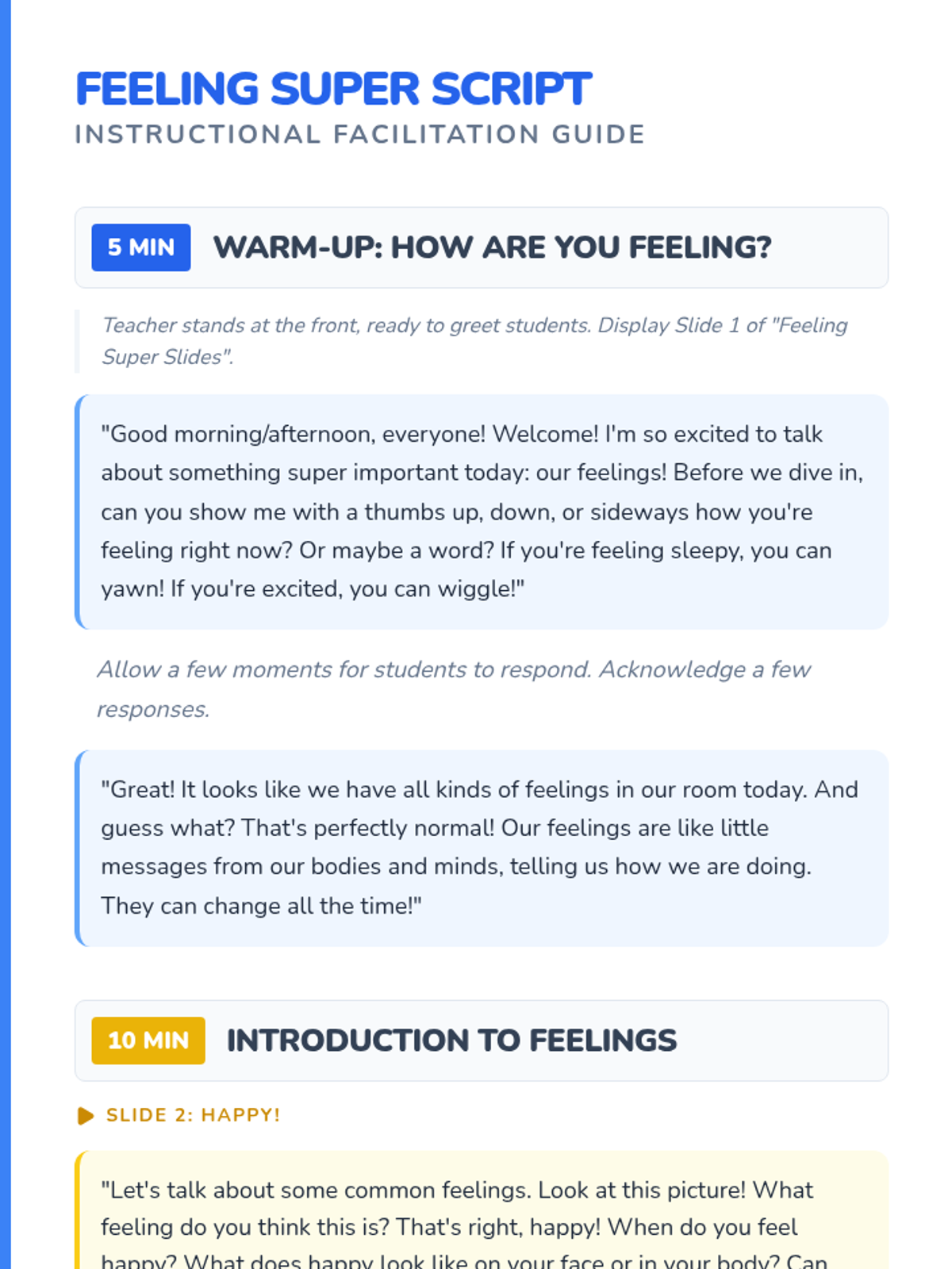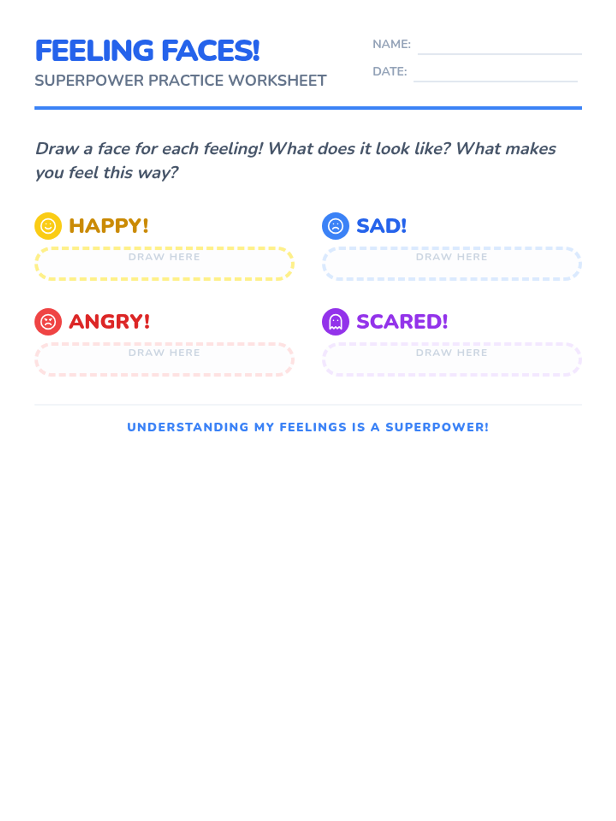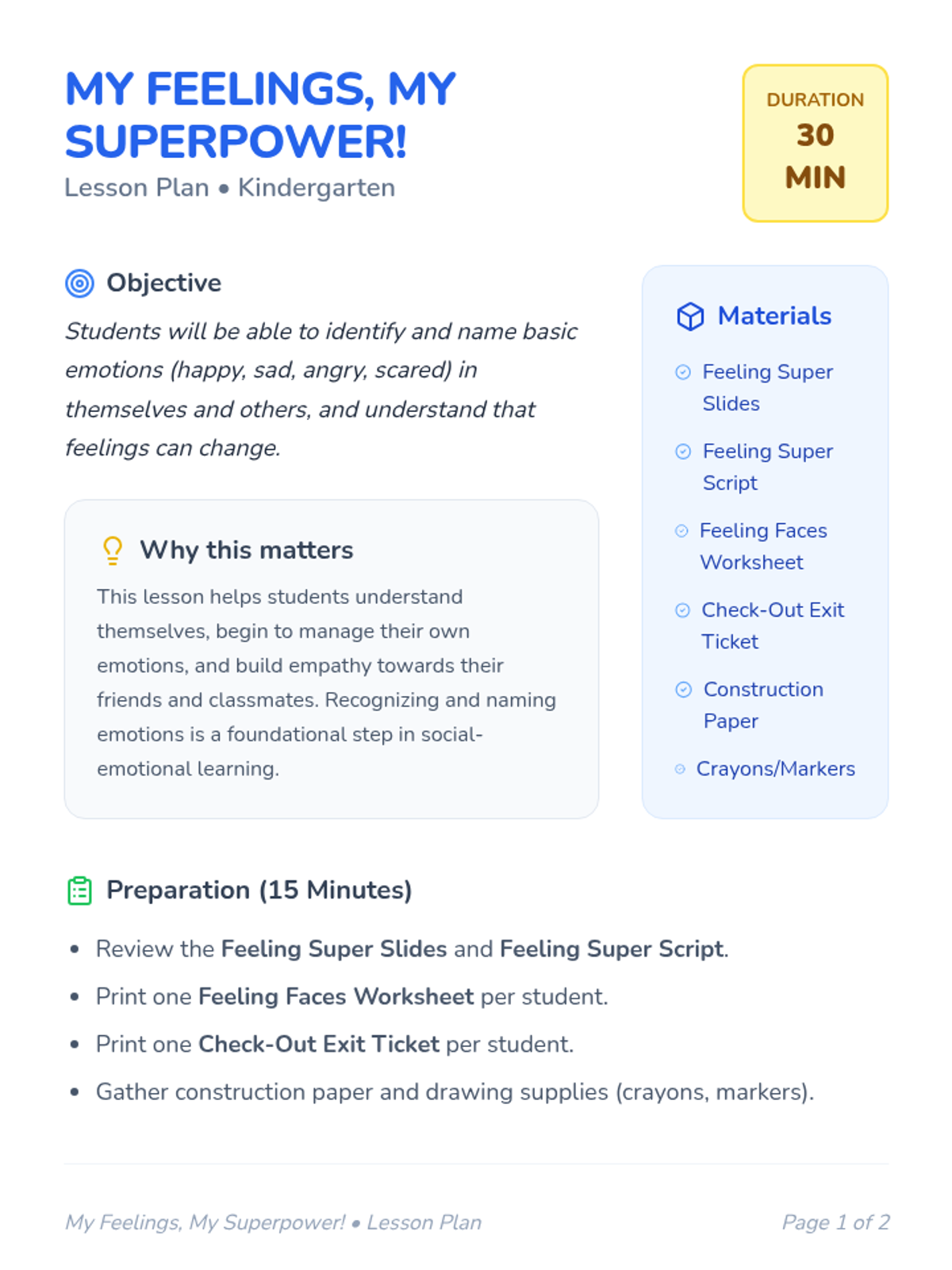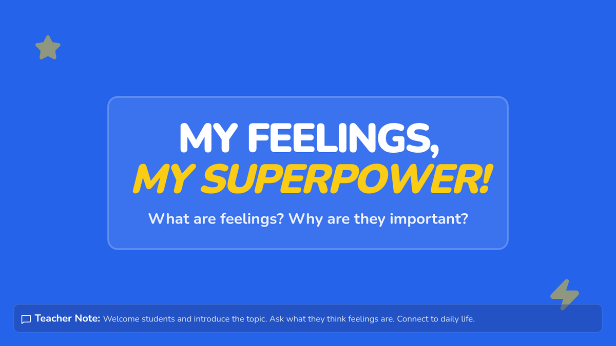 A 30-minute lesson for Kindergarten students to identify and name four basic emotions (happy, sad, angry, scared) using a superpower theme. Students explore feelings through discussion, a slide presentation, and creative drawing activities.