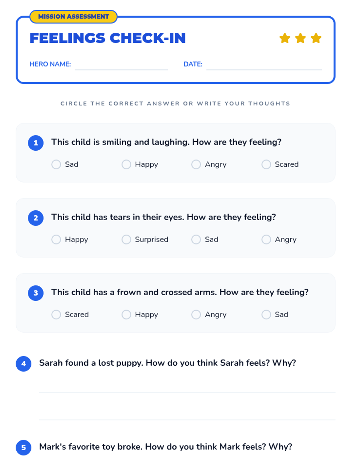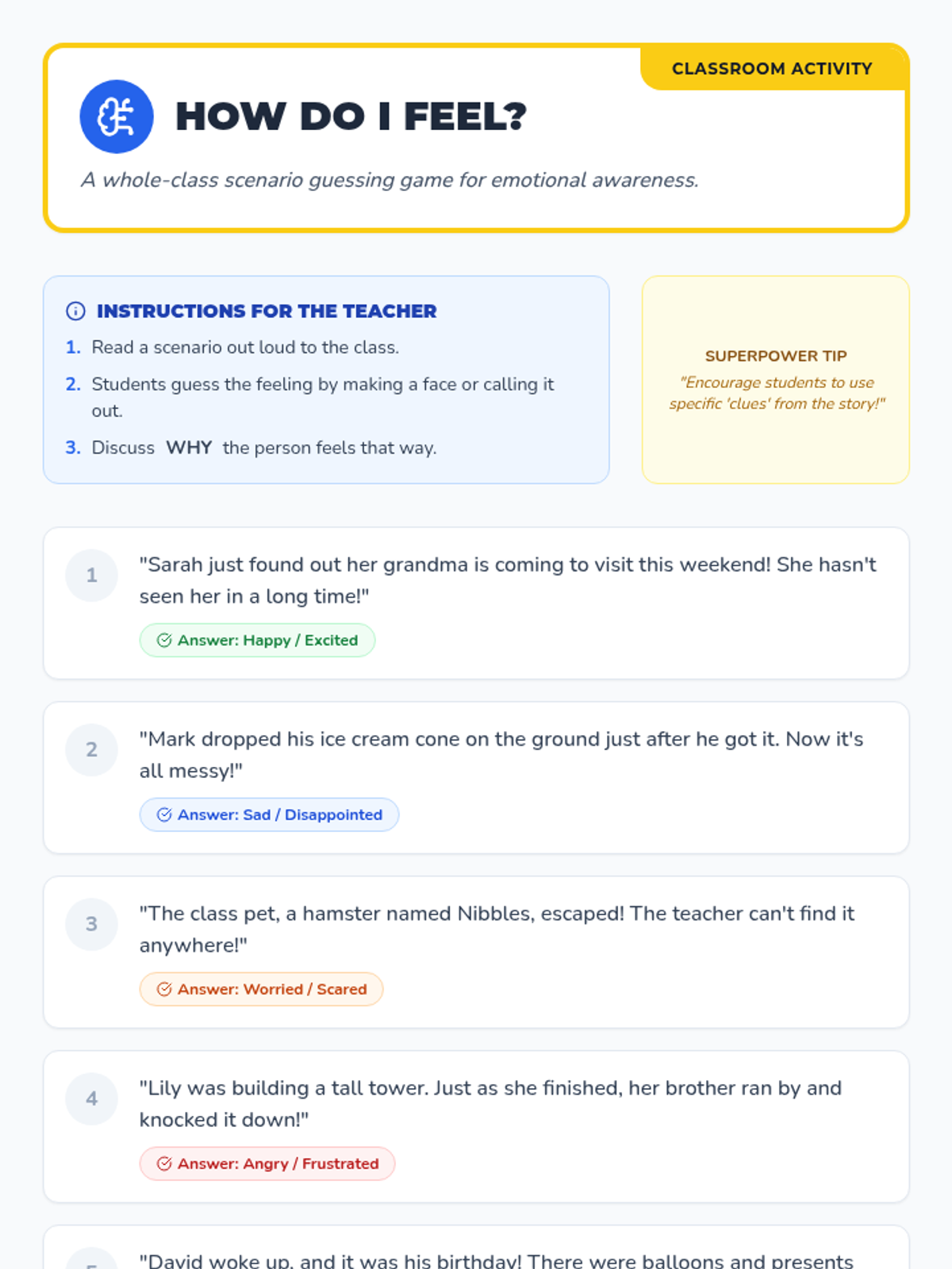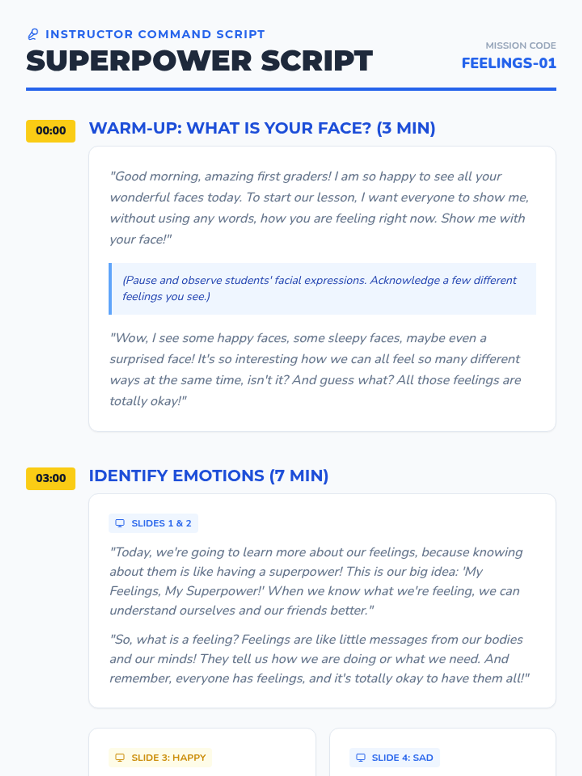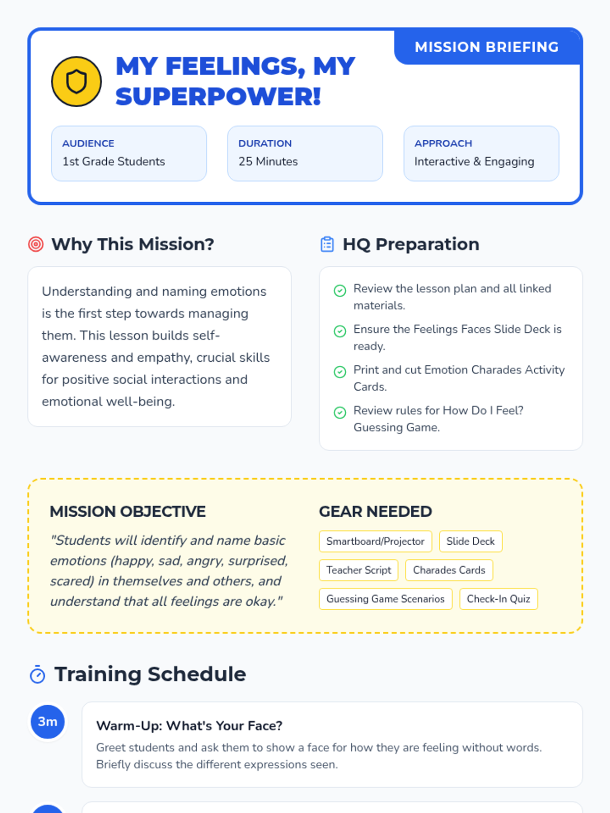This lesson introduces 1st-grade students to basic emotions and how to identify them in themselves and others, framing emotional intelligence as a 'superpower'.