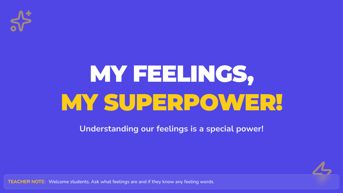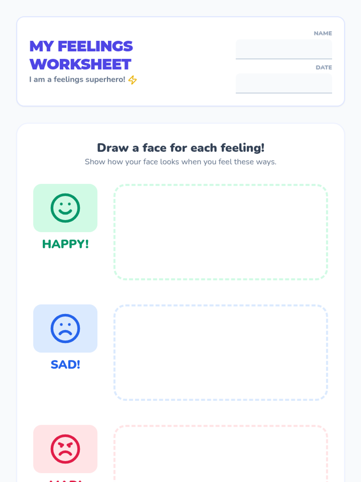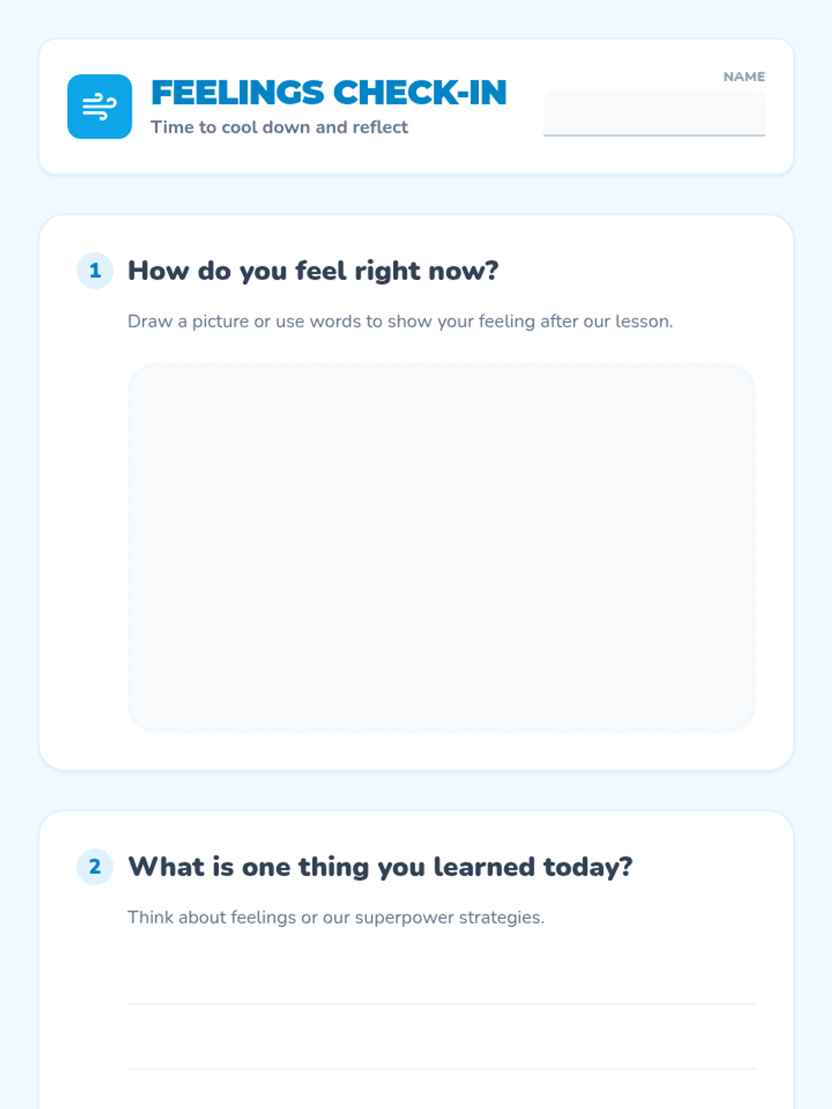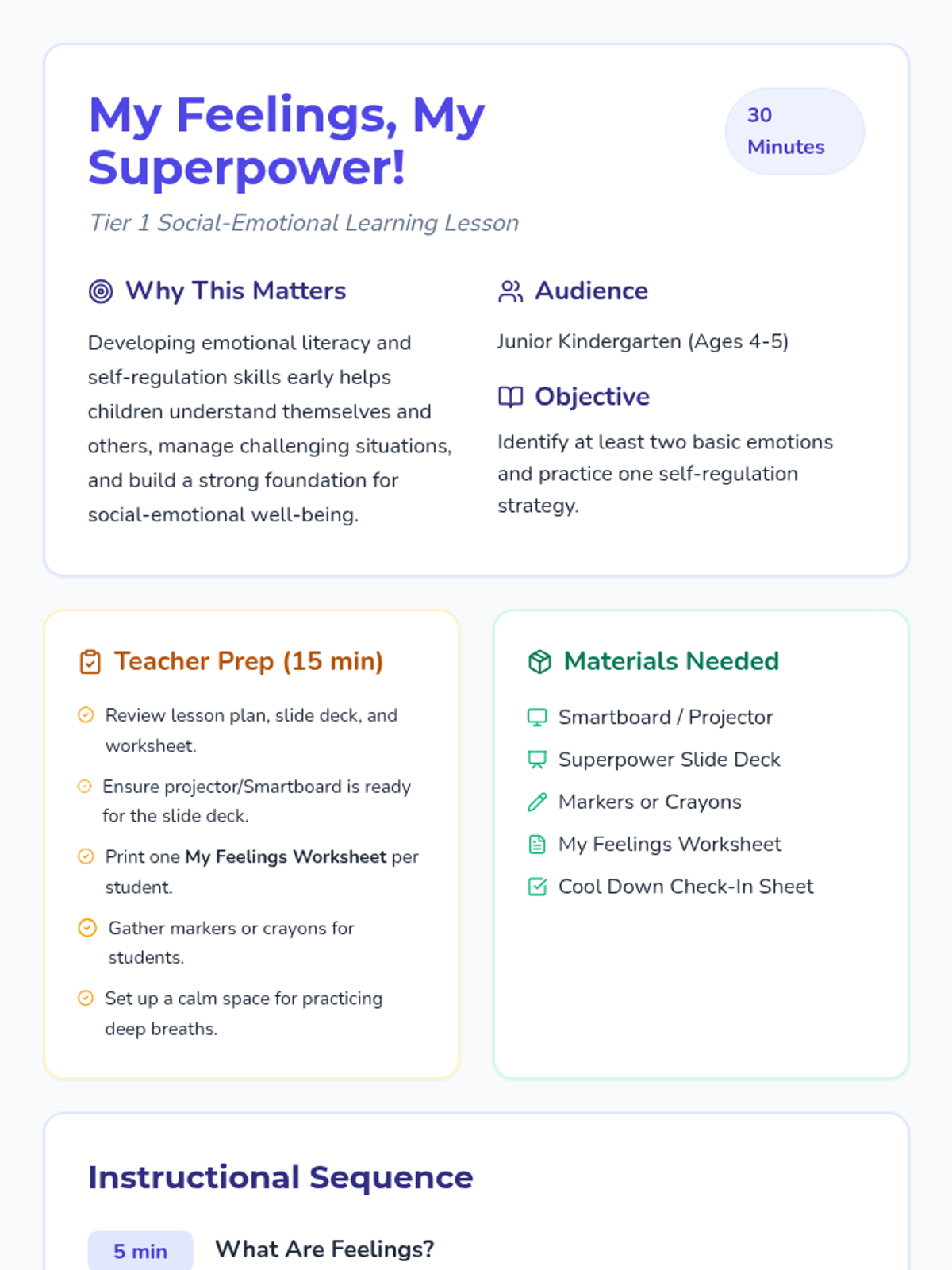 A 30-minute introductory lesson for Junior Kindergarten students to identify basic emotions (happy, sad, mad) and practice deep breathing as a self-regulation 'superpower' strategy.
