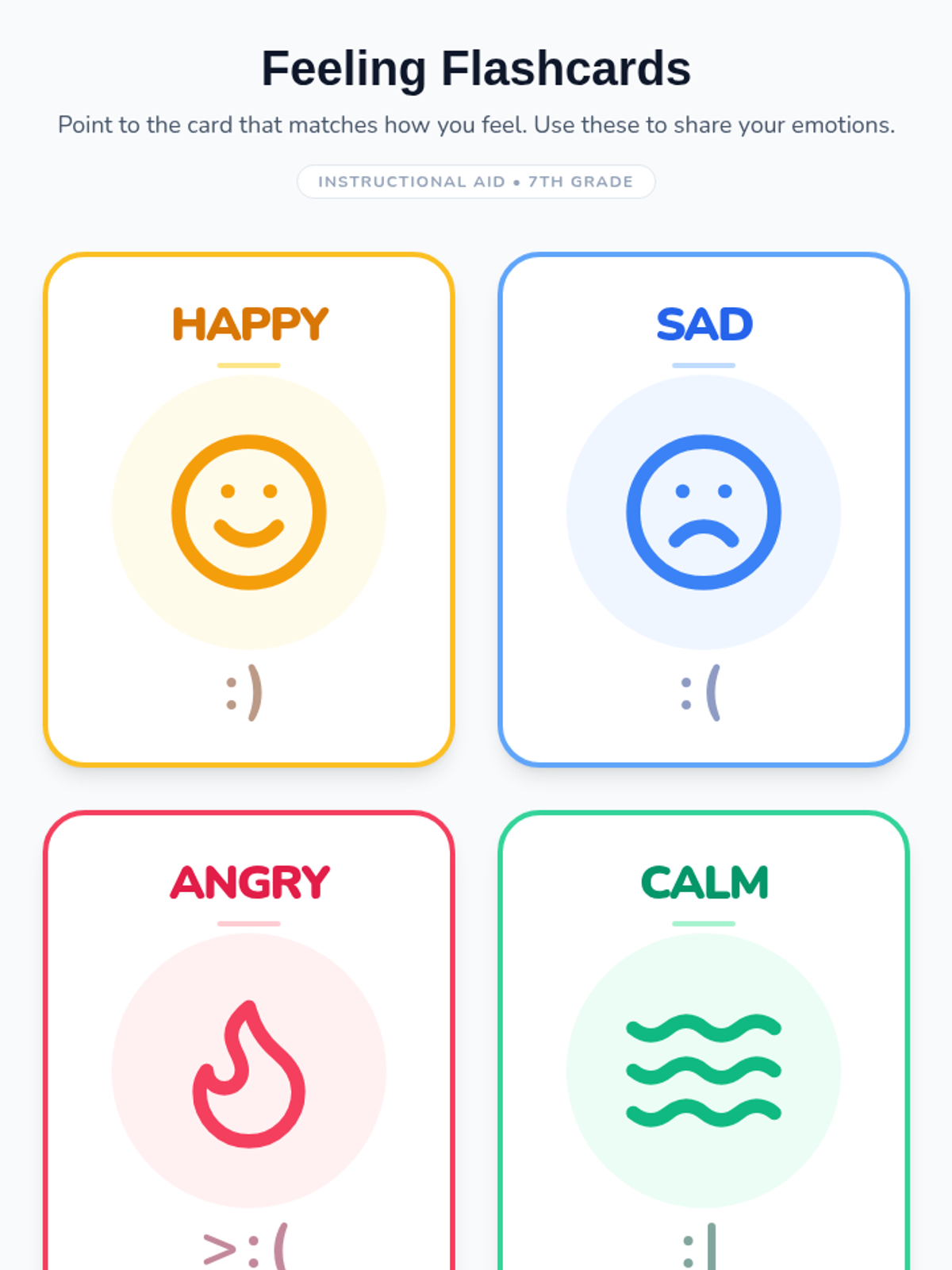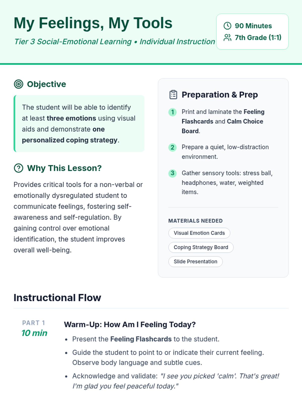 A 90-minute Tier 3 lesson for an individual 7th-grade student focusing on emotion identification and personalized coping strategies through visual aids and non-verbal communication tools.