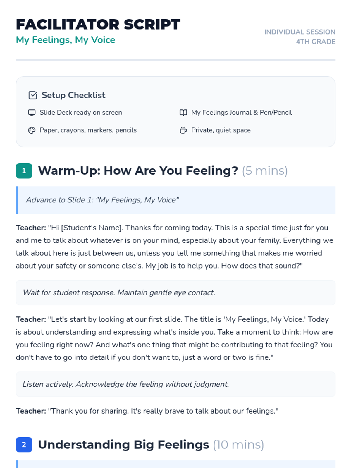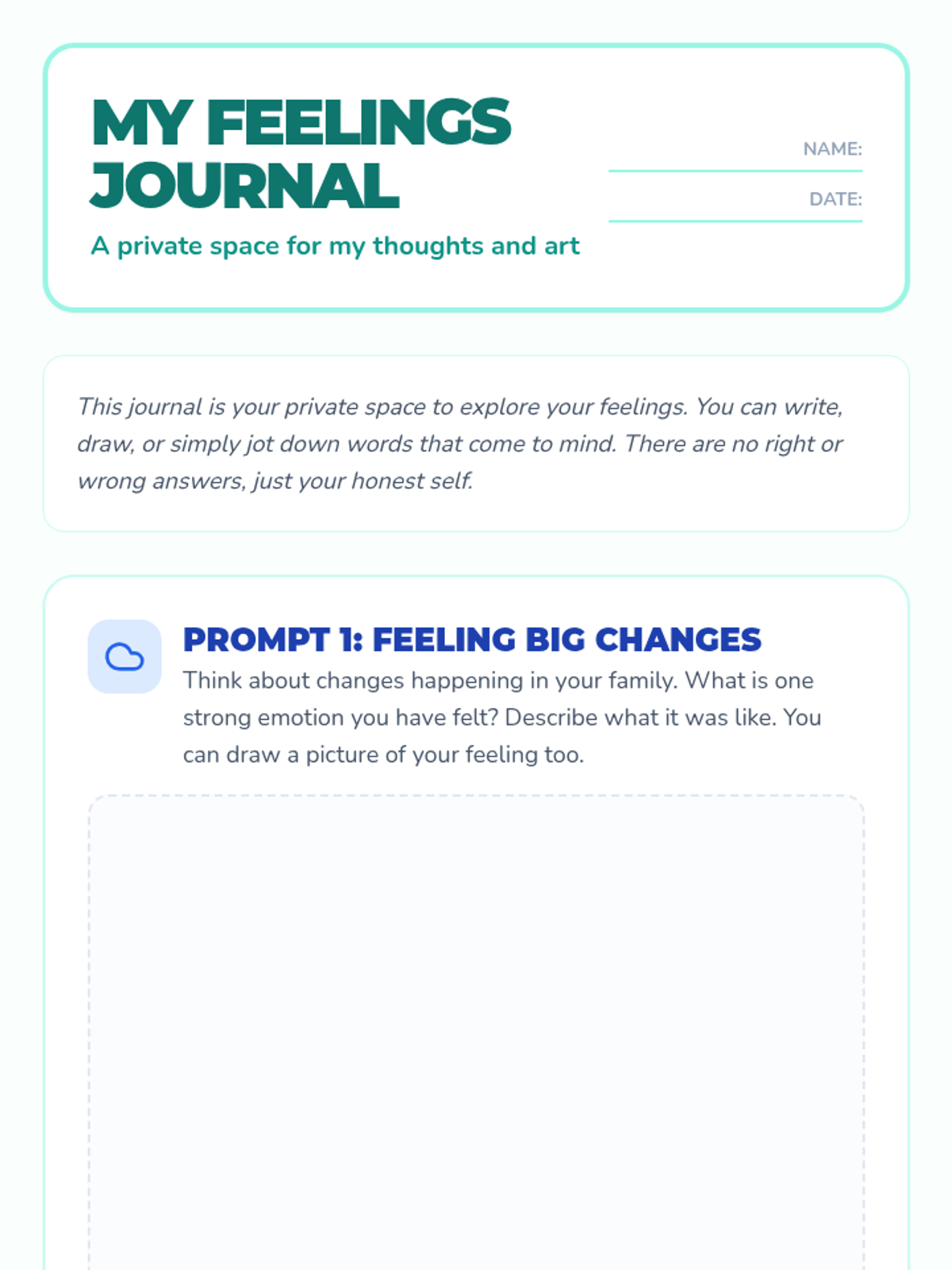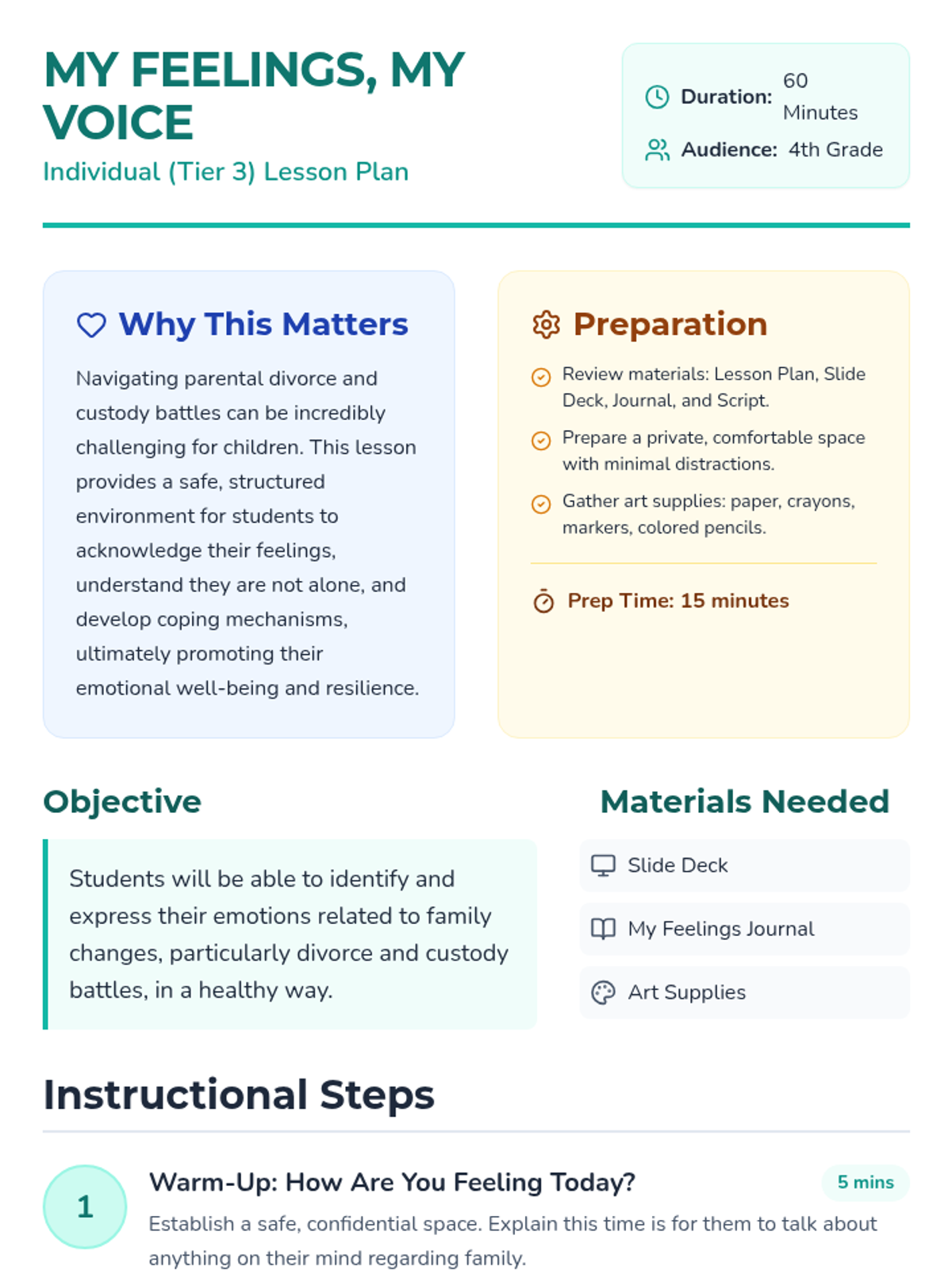 A supportive 60-minute individual lesson for 4th-grade students to process emotions related to family changes, divorce, and custody. The lesson uses journaling, creative art, and guided discussion to build coping strategies and identify support networks.