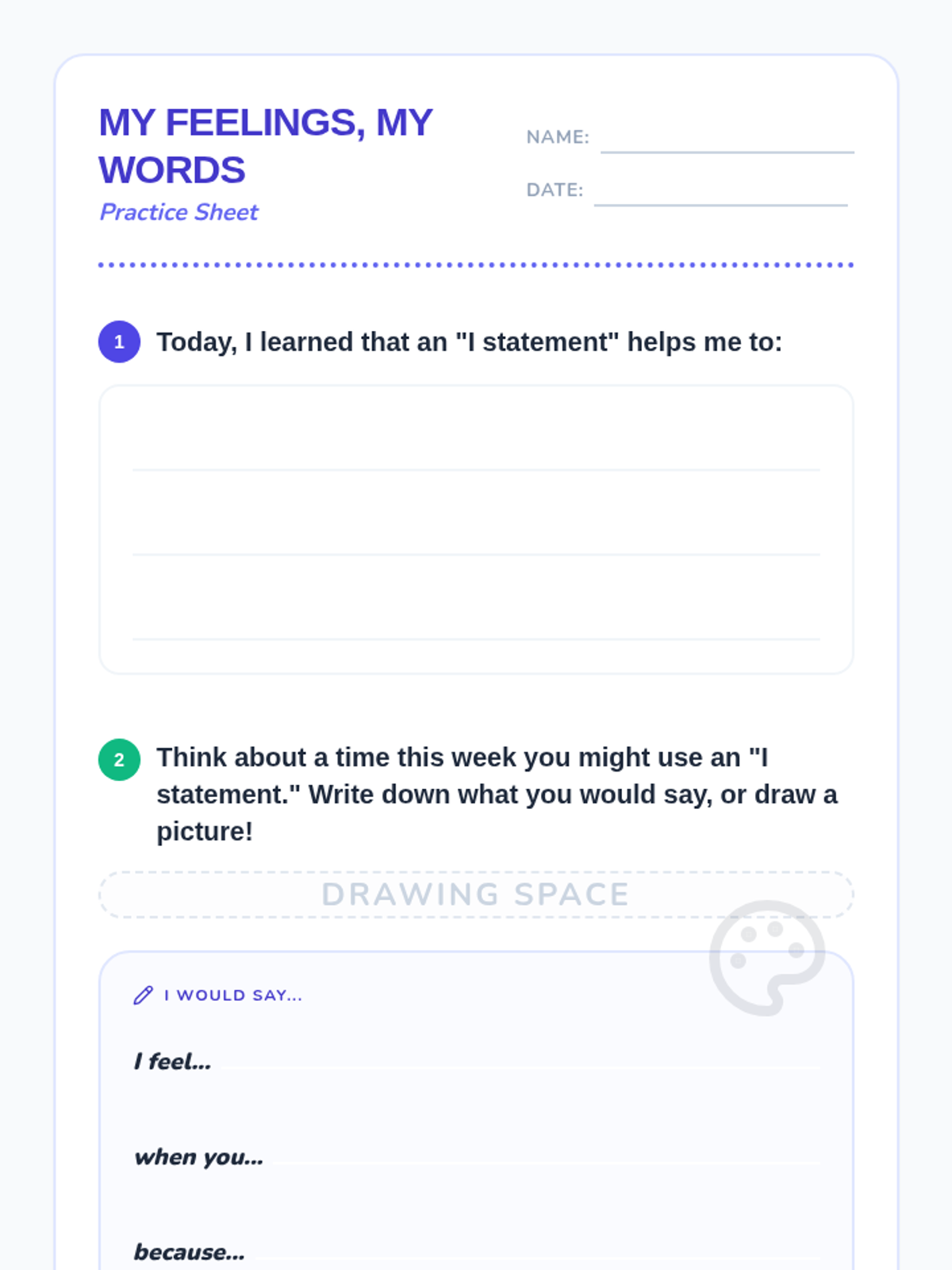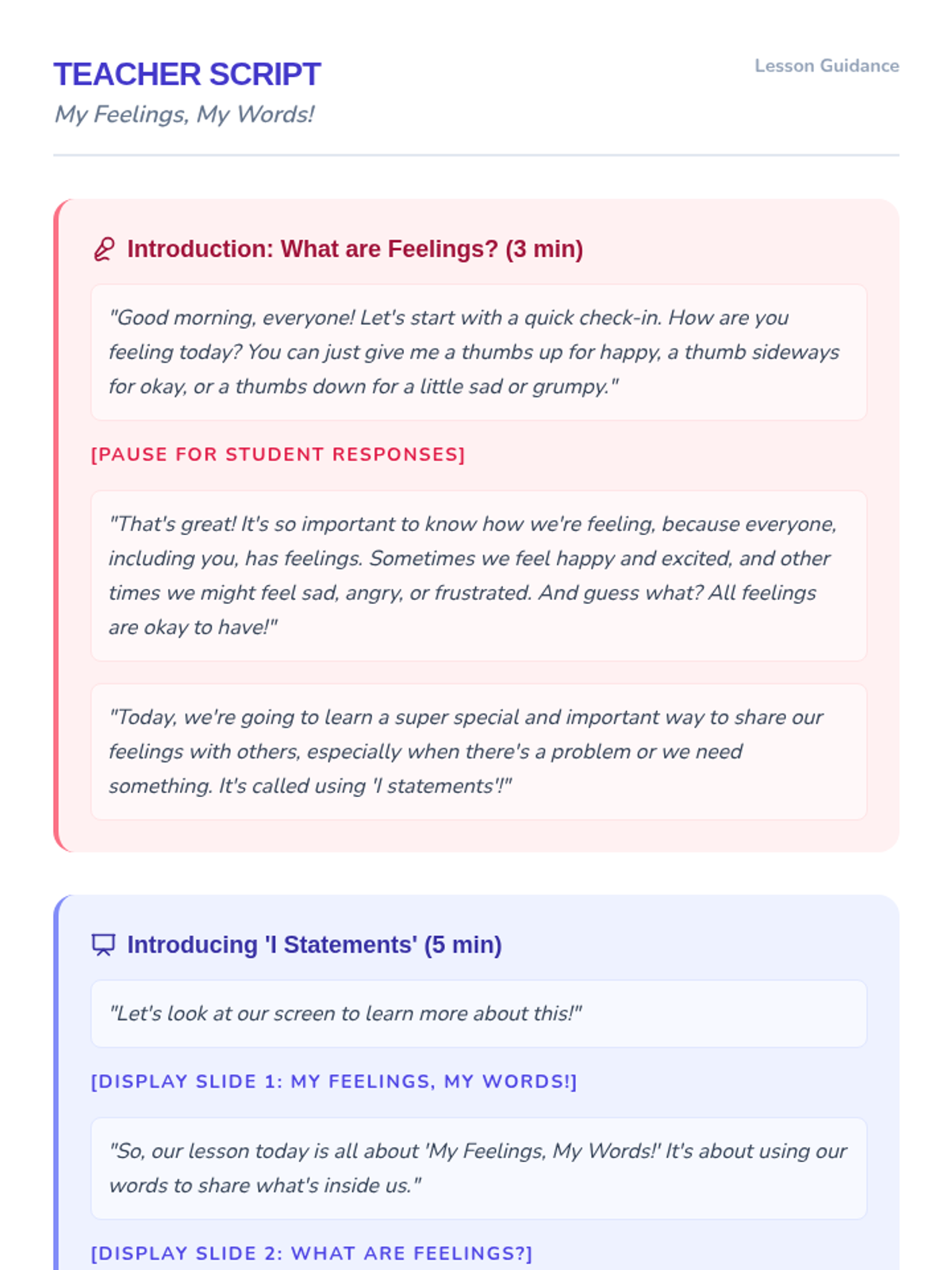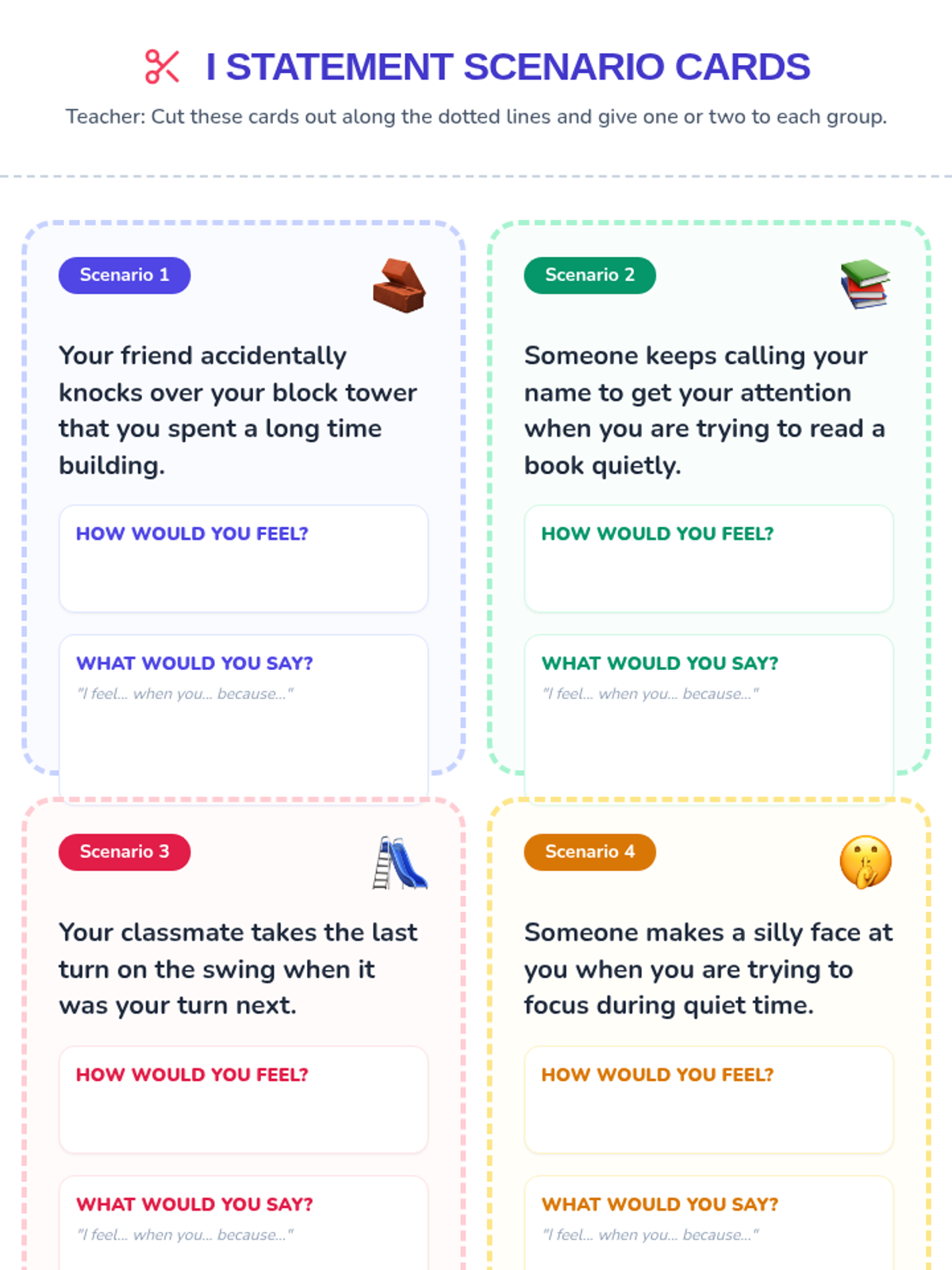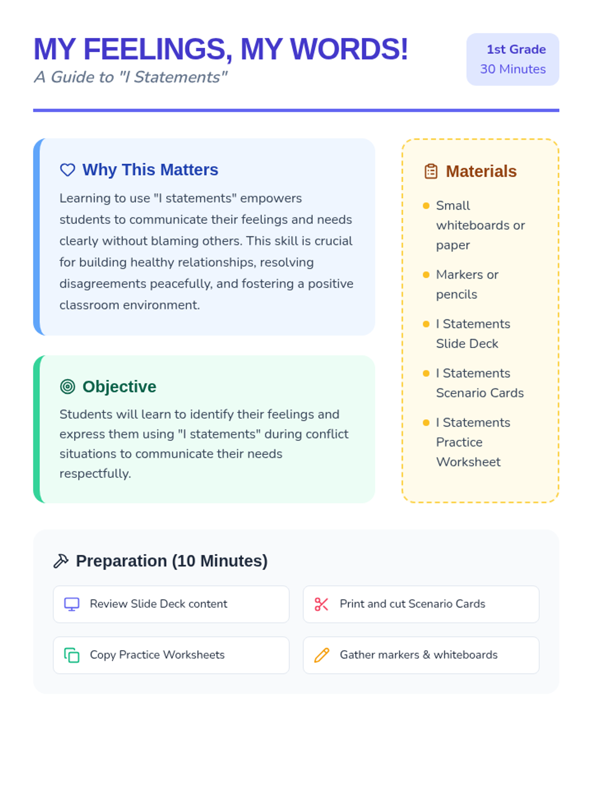 This lesson introduces 1st-grade students to 'I statements' as a powerful tool for expressing their feelings and needs during conflicts. By learning to communicate assertively and respectfully, students will build stronger relationships and resolve disagreements peacefully.