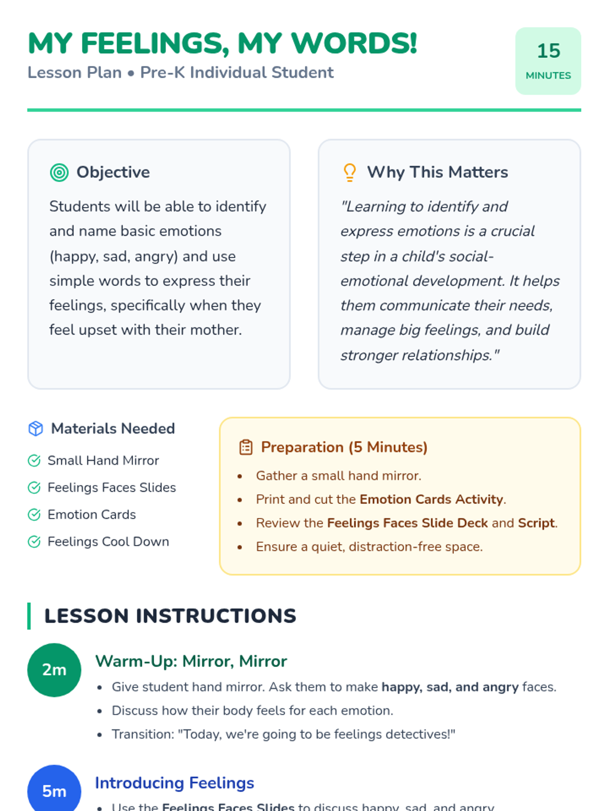 A 15-minute individual Tier 3 lesson for Pre-K students to identify and name feelings, specifically focusing on expressing big emotions like anger or sadness when interacting with caregivers.