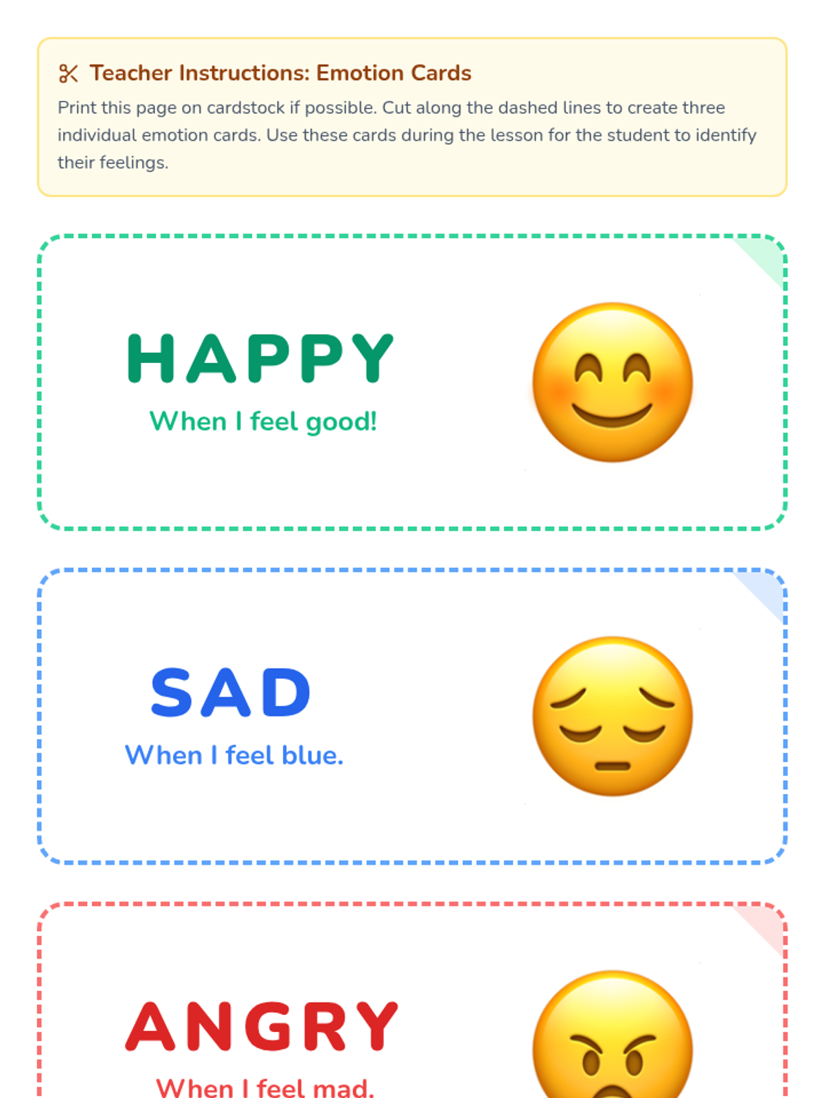 Students learn to identify five core emotions—Joy, Sadness, Anger, Fear, and Disgust—using color associations and visual cues. This lesson features high-contrast sorting cards for hands-on identification and communication support.