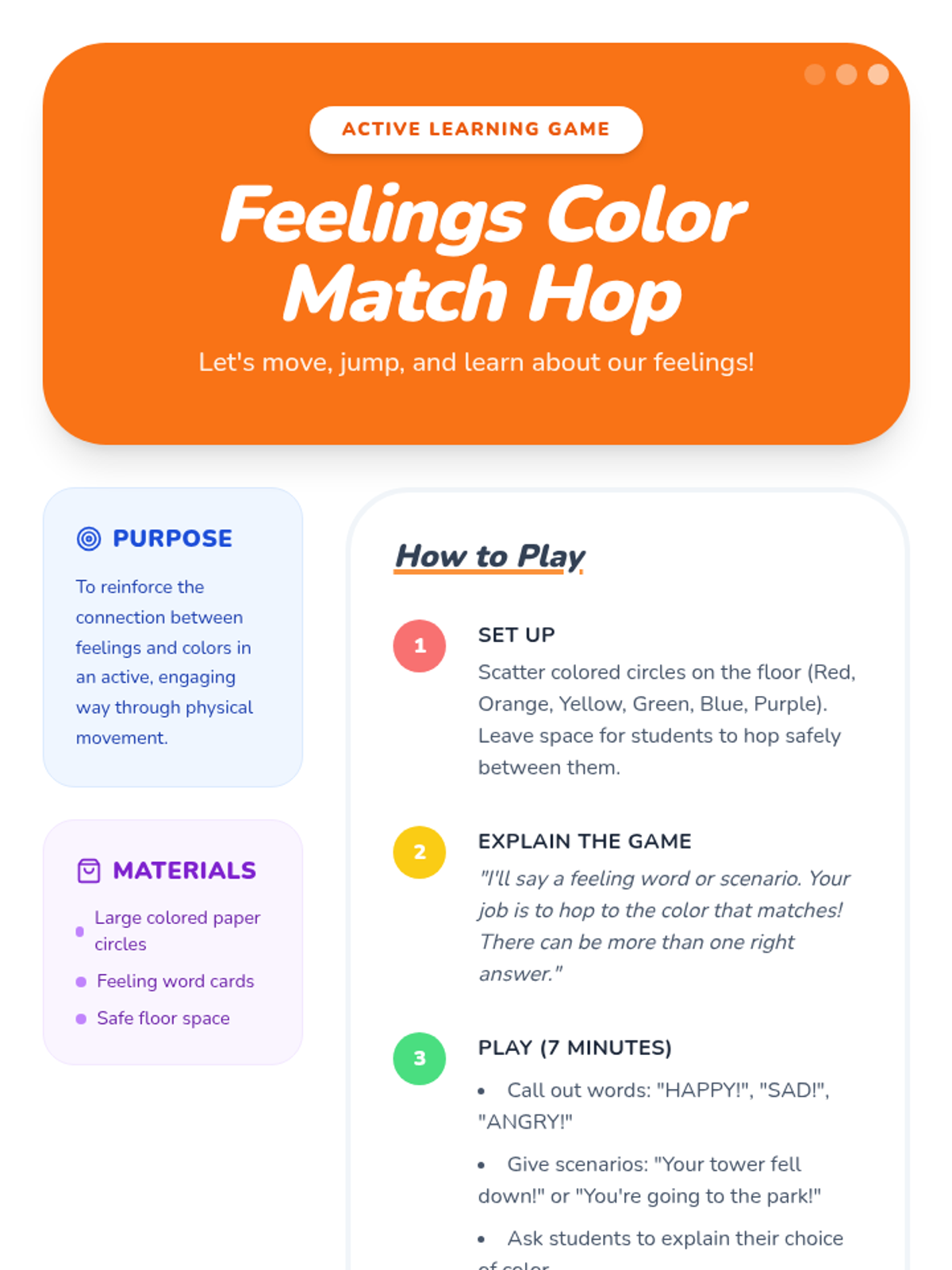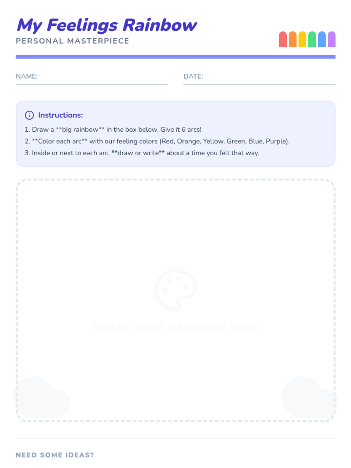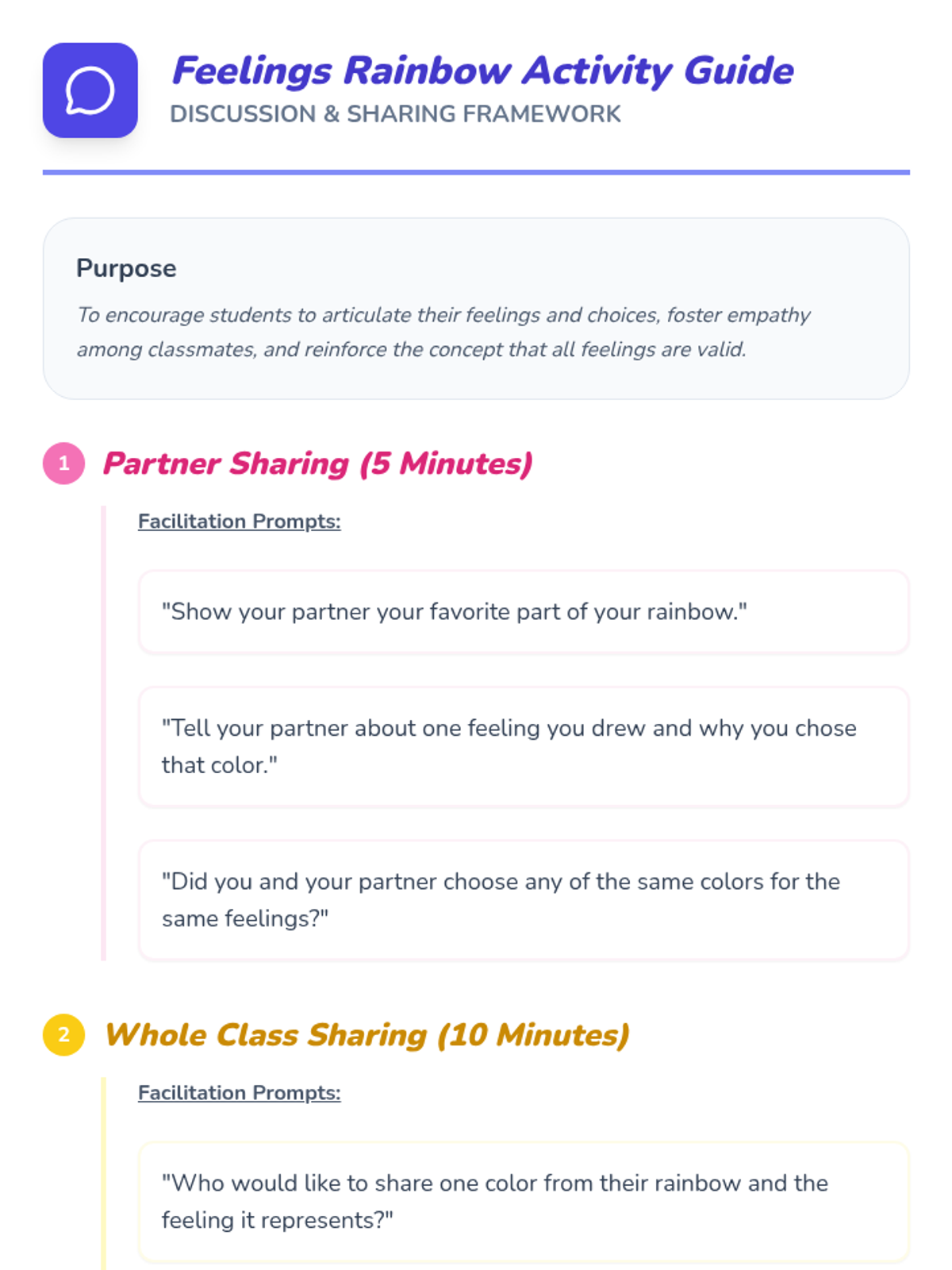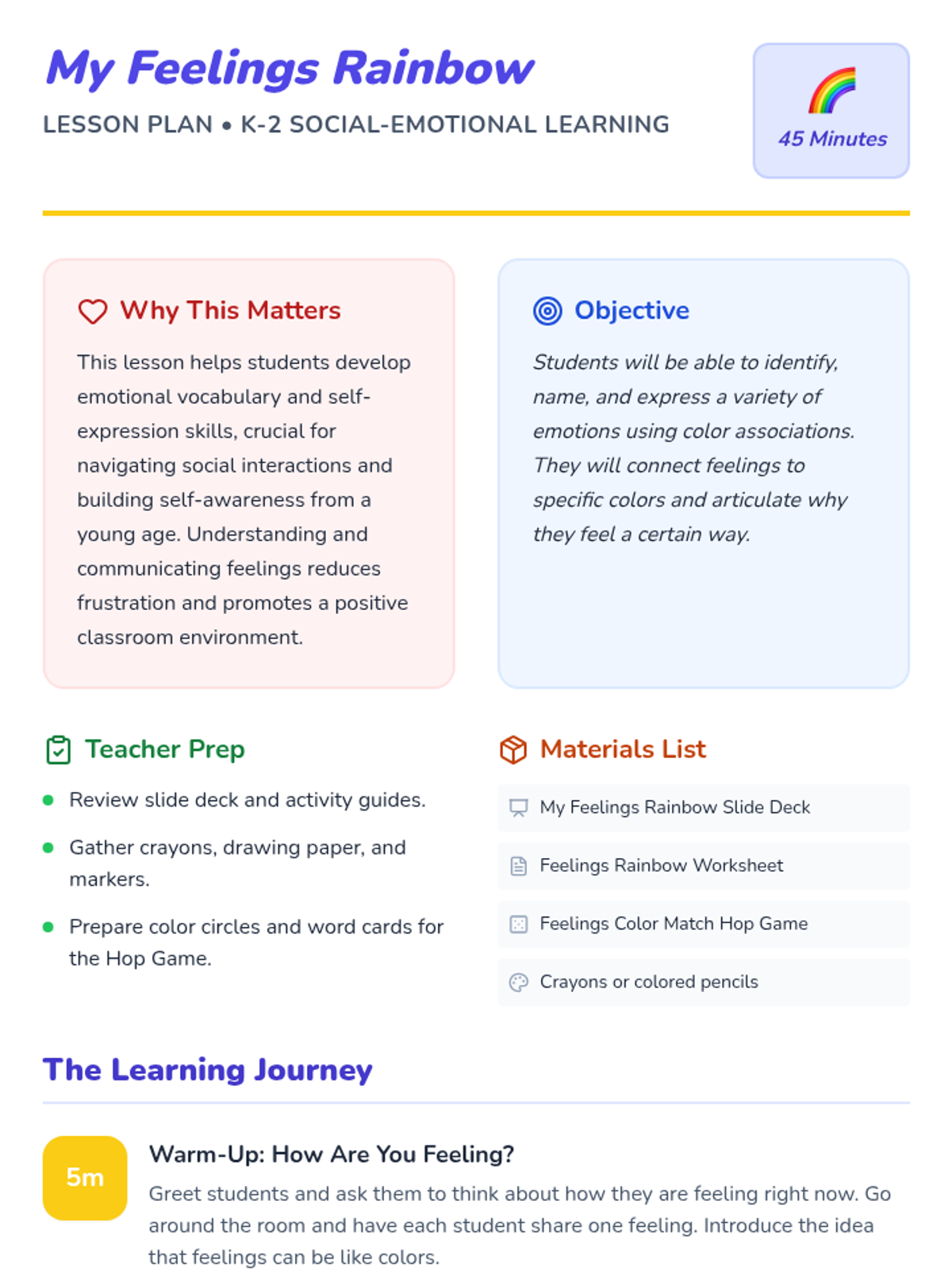 A vibrant K-2 lesson using rainbow colors to help students identify, name, and express emotions, building their emotional vocabulary through art and movement.