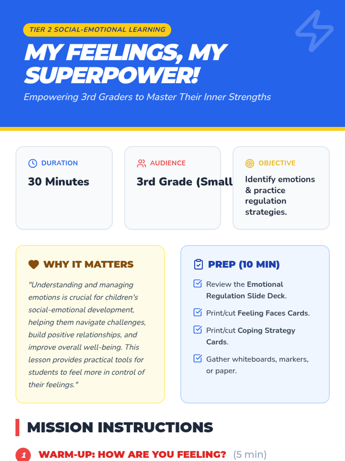 A 30-minute Tier 2 small group lesson for 3rd graders focused on identifying emotions and learning coping strategies through a 'superhero' lens.