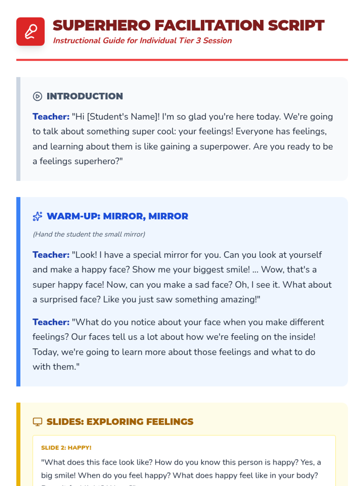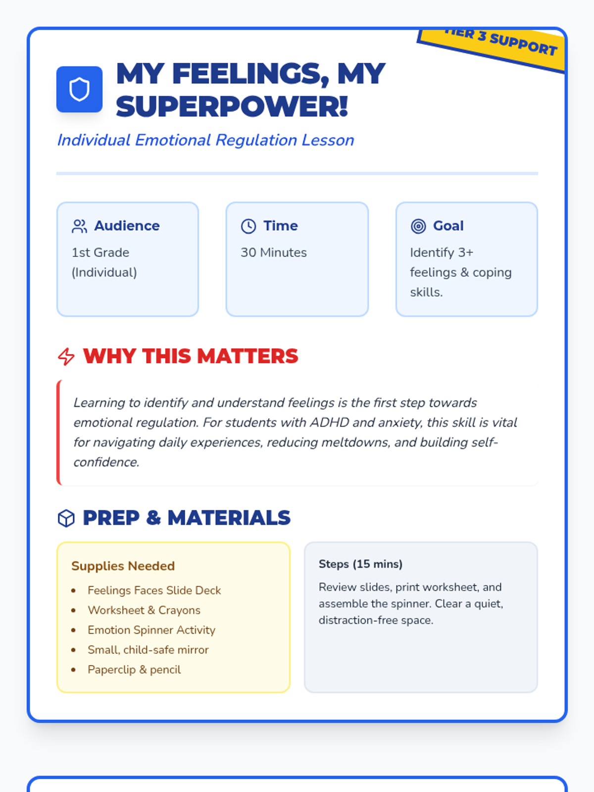 A 30-minute Tier 3 individual lesson for a 1st-grade student focusing on identifying emotions and learning basic coping strategies through a superhero theme.