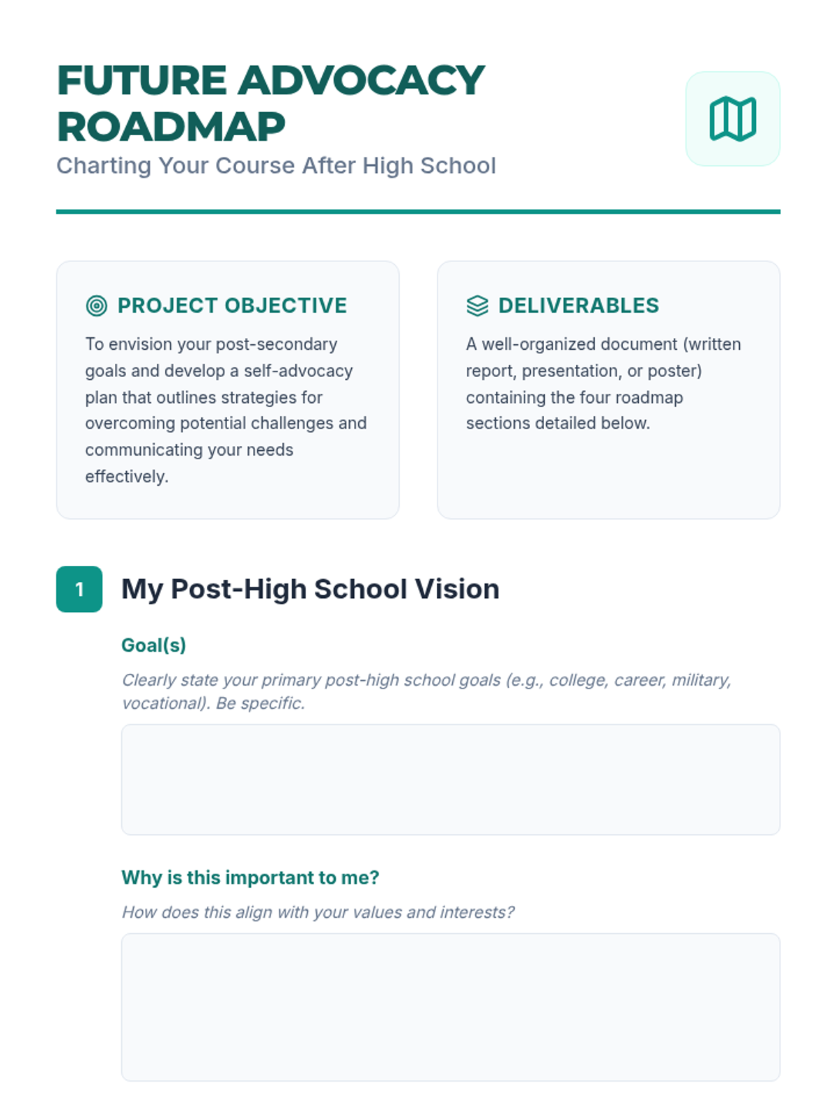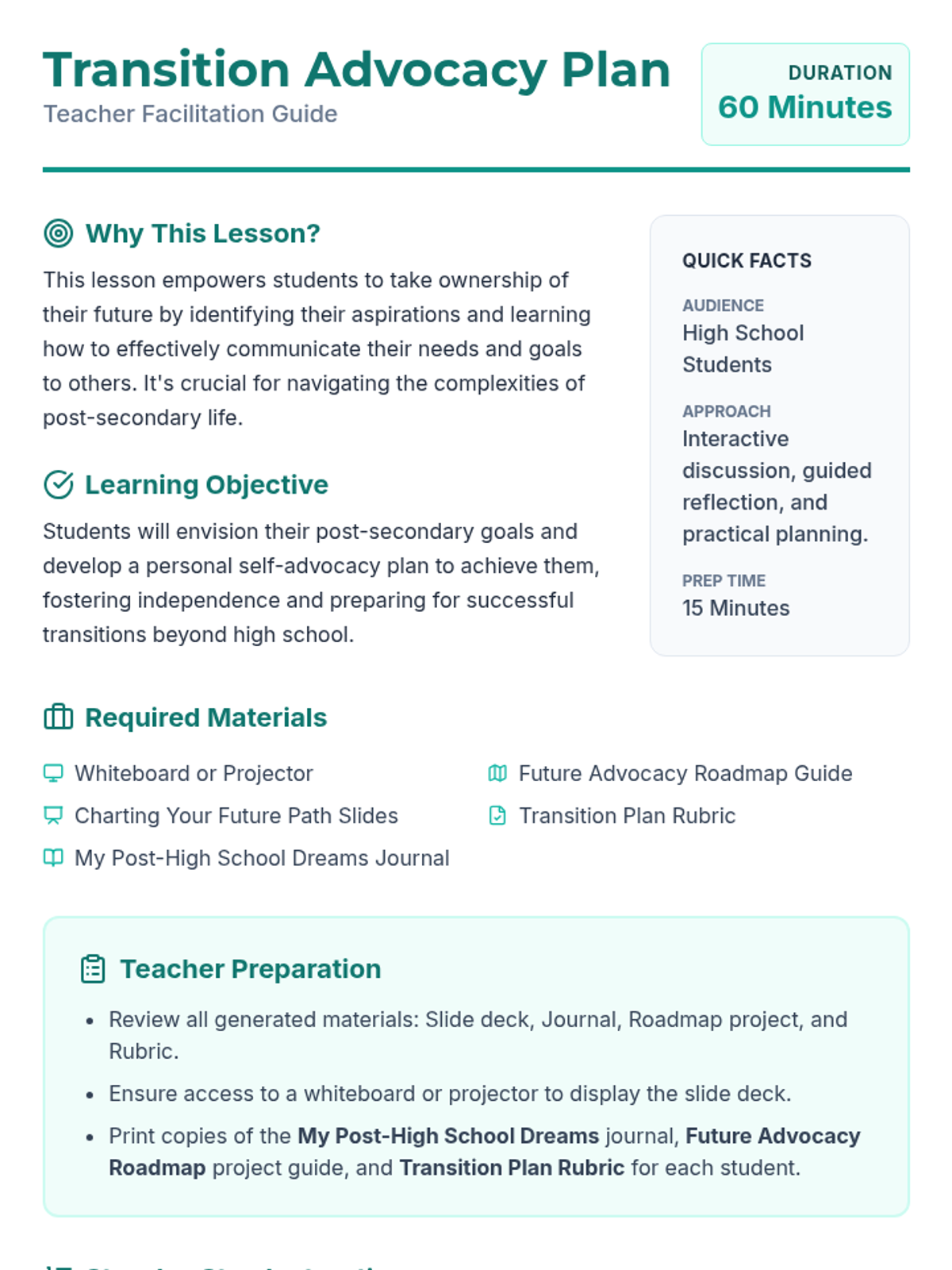 This lesson empowers high school students to envision their post-secondary goals and develop a concrete self-advocacy plan to achieve them. Students explore various paths, identify potential obstacles, and learn how to communicate their needs effectively.