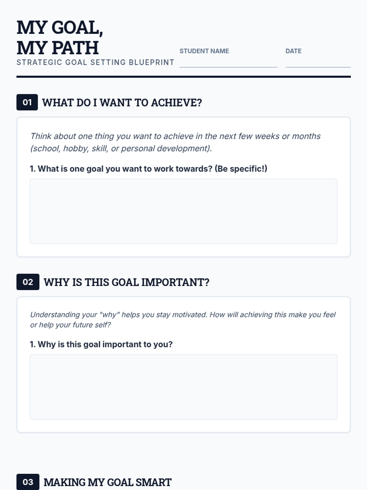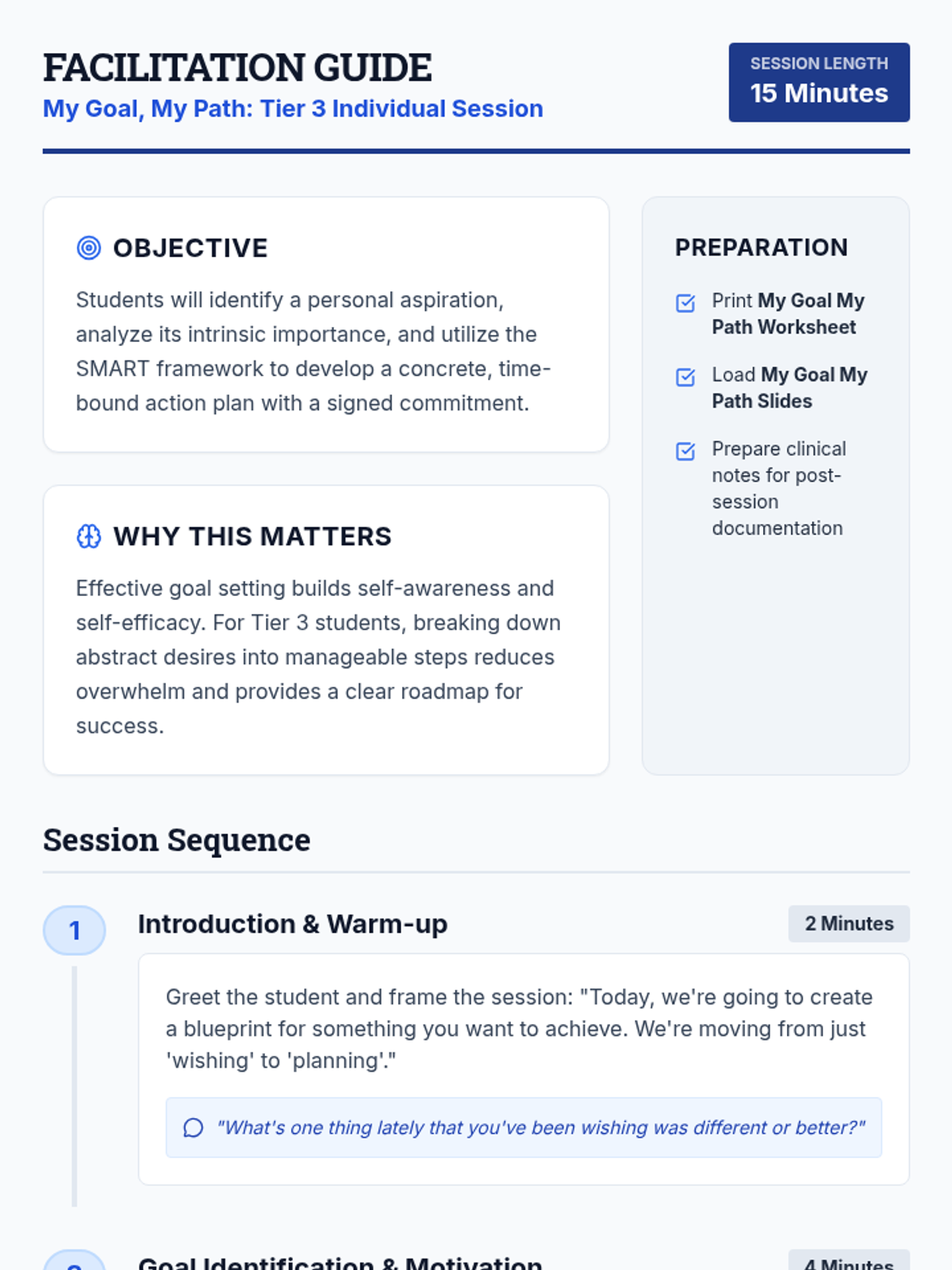 A 15-minute individual counseling session for 7th-grade students focusing on SMART goal setting. This Tier 3 intervention empowers students to define specific aspirations and create actionable paths to achievement.
