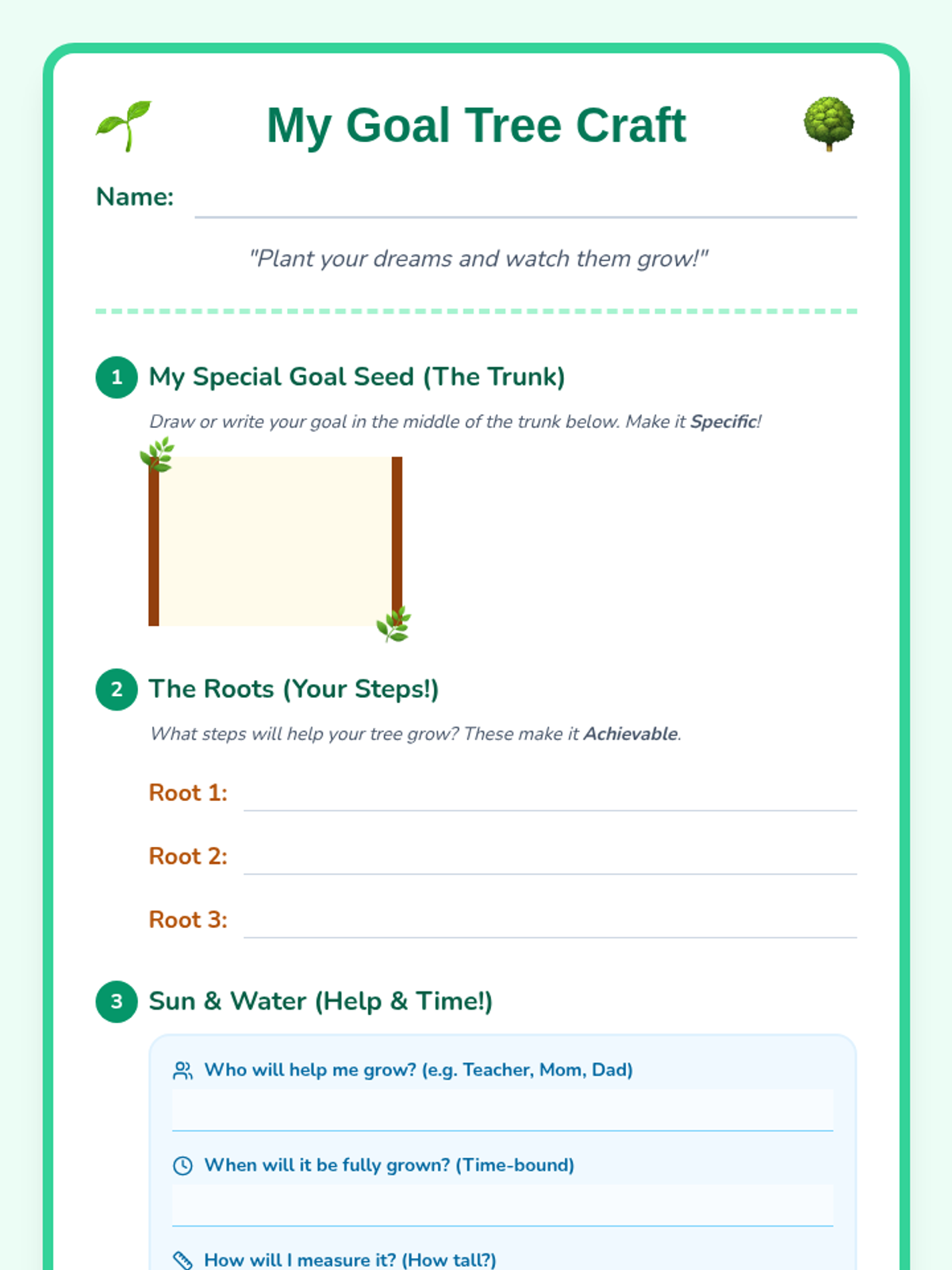 A 30-minute Kindergarten lesson that uses a tree growth analogy to introduce SMART goals, helping students visualize their aspirations and the steps needed to achieve them.