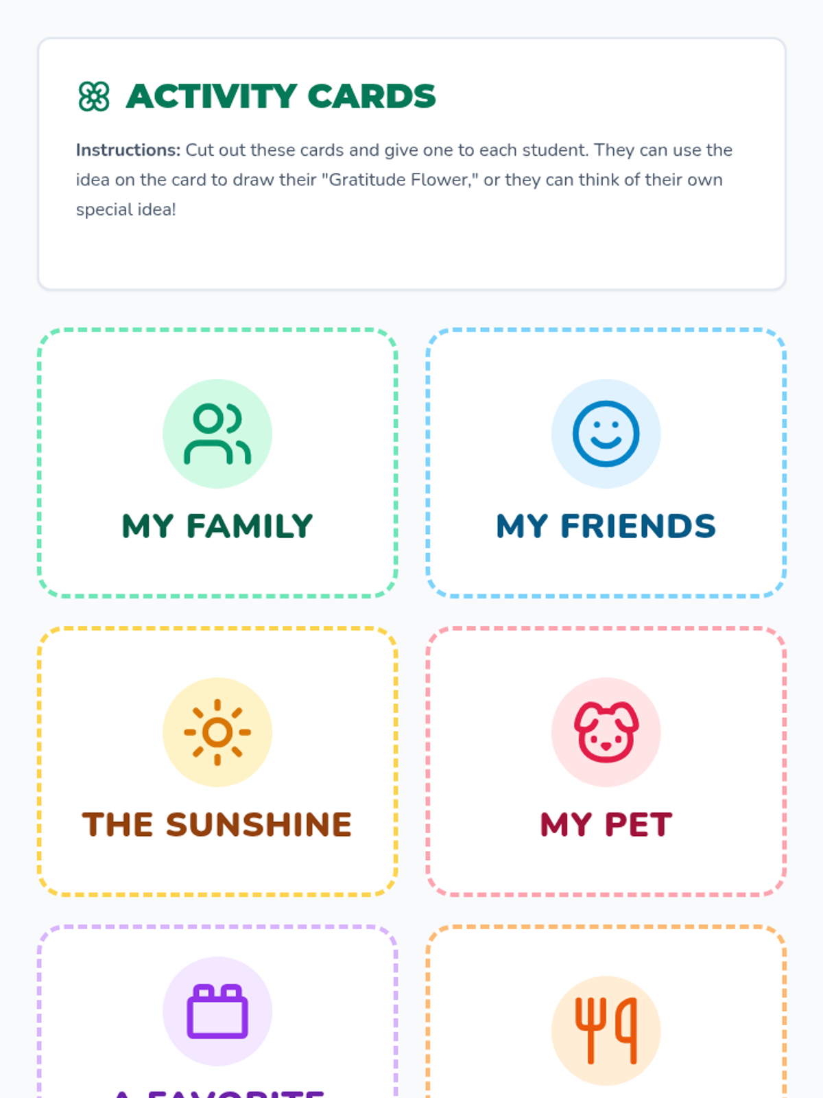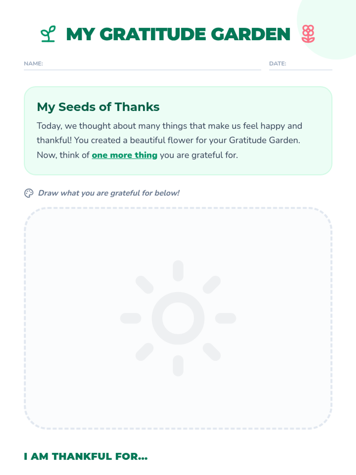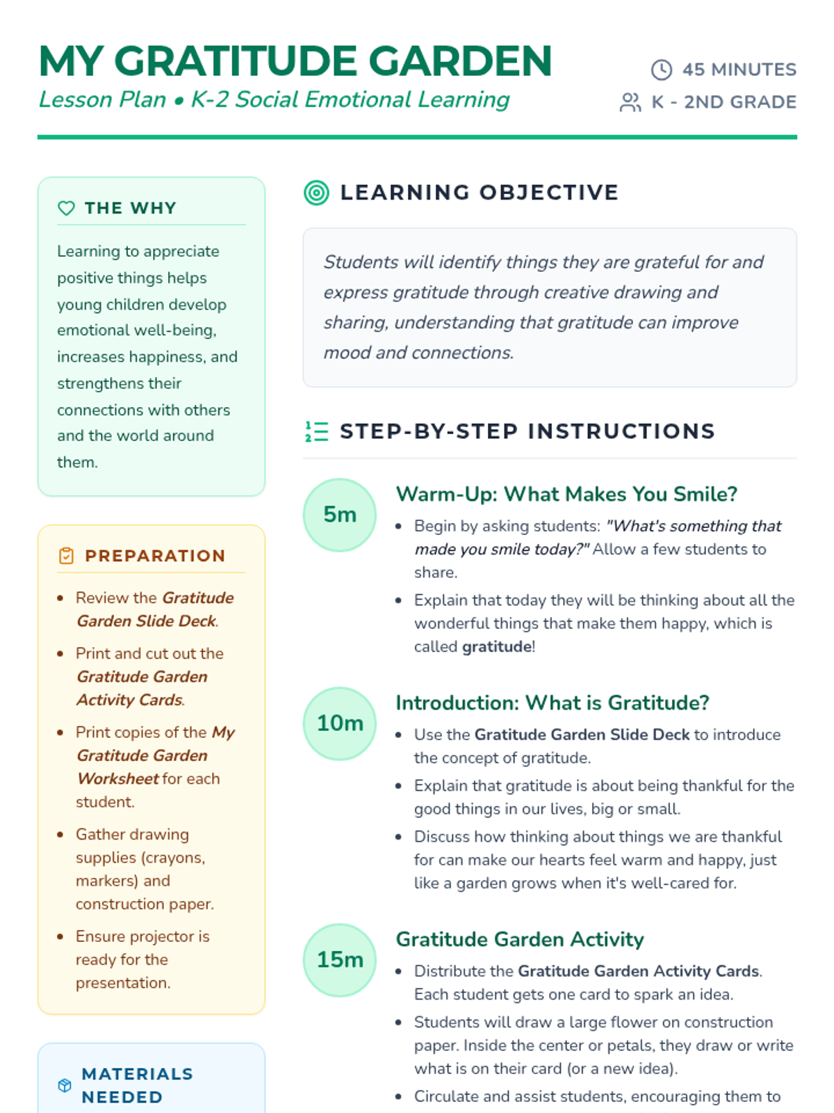 A hands-on social-emotional learning lesson for K-2 students to explore the concept of gratitude through the metaphor of a growing garden. Students identify things they are thankful for and create 'gratitude flowers' to foster positive emotions and connections.