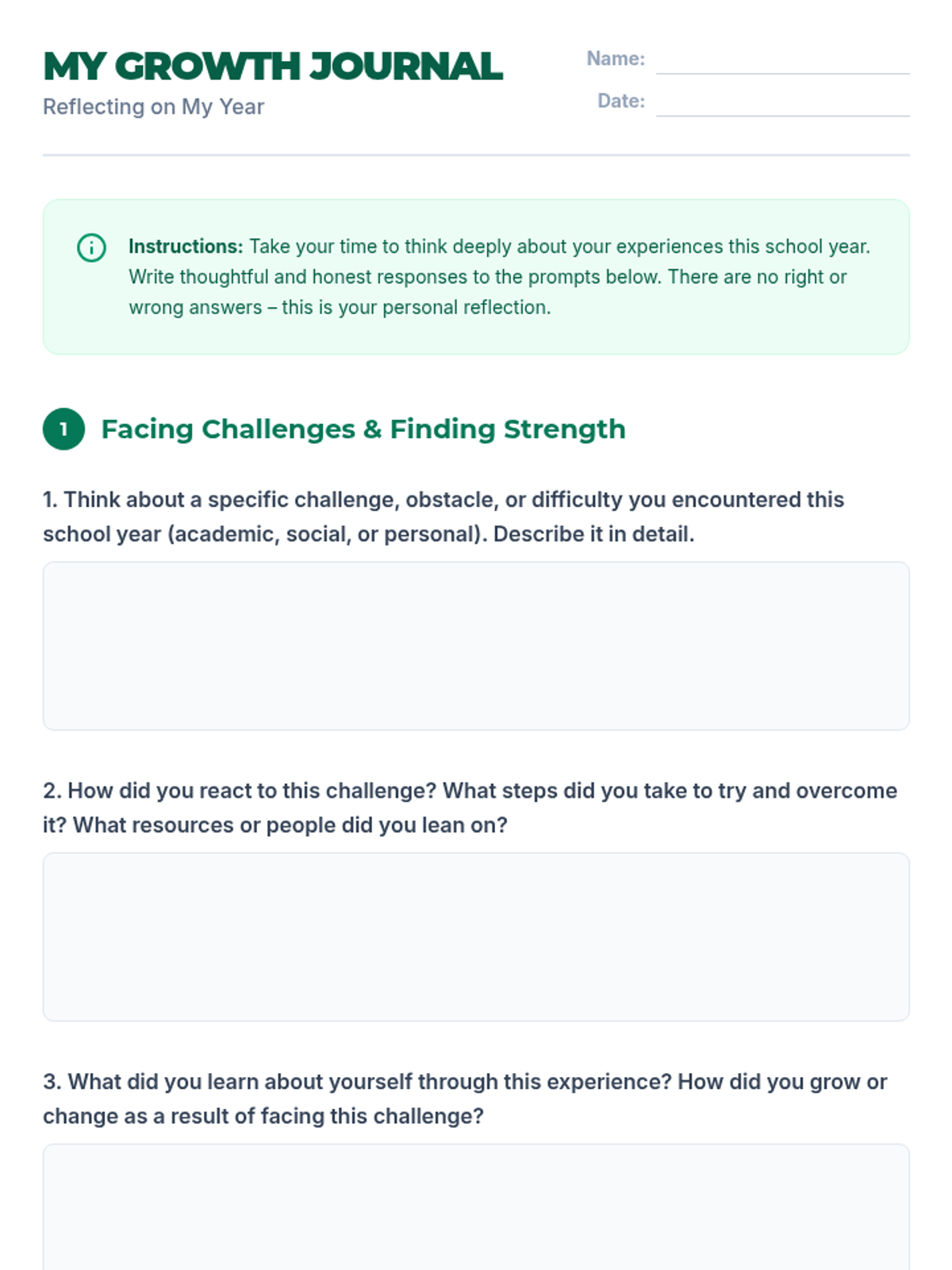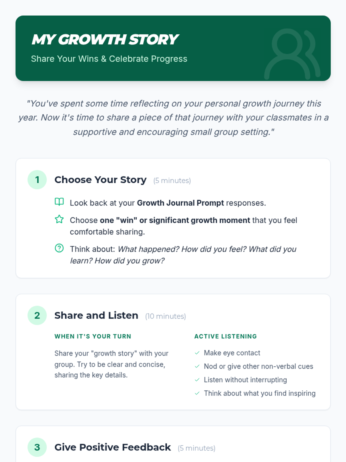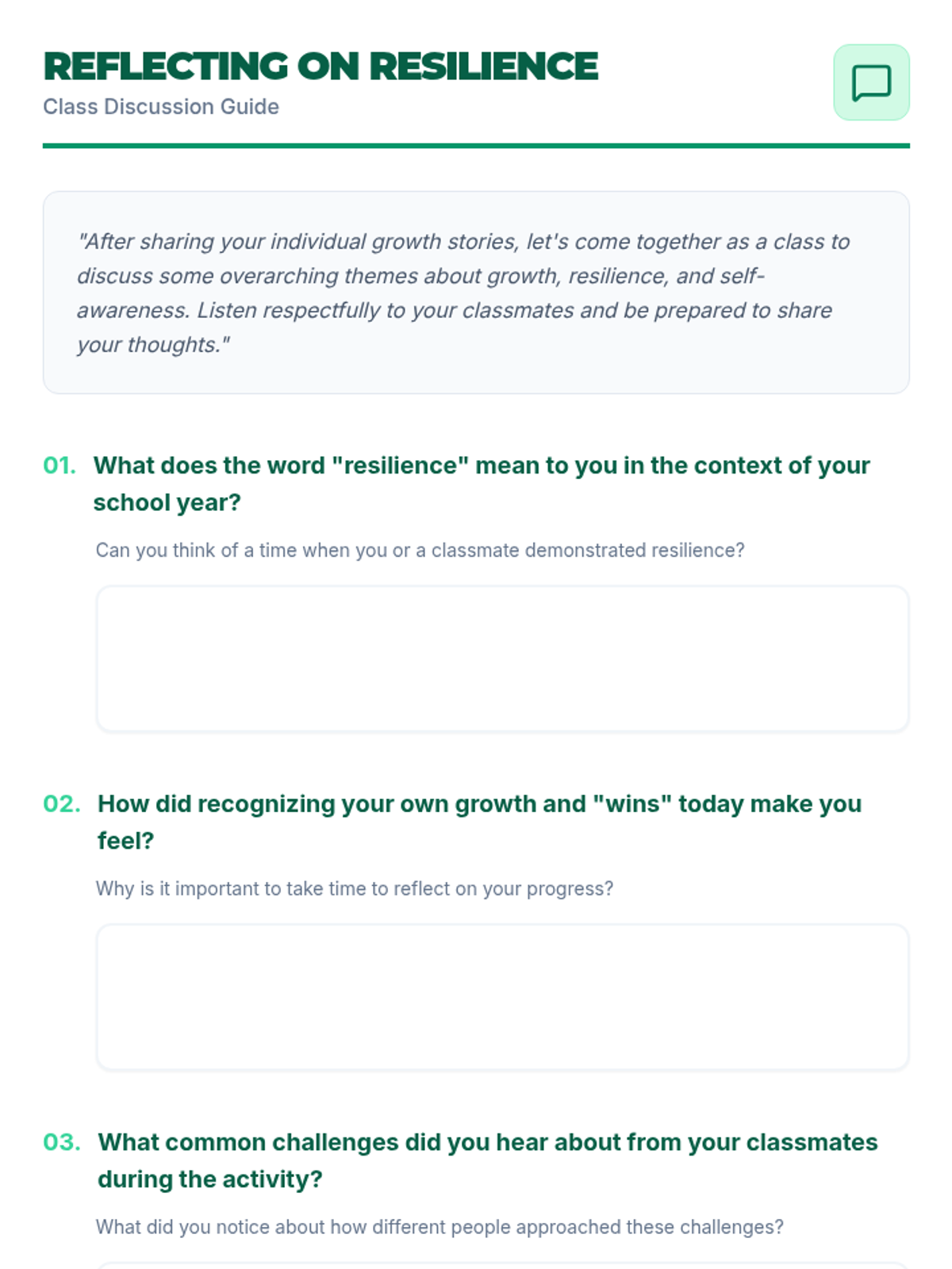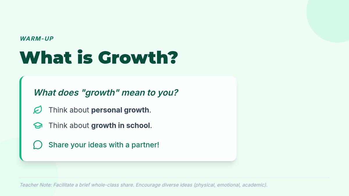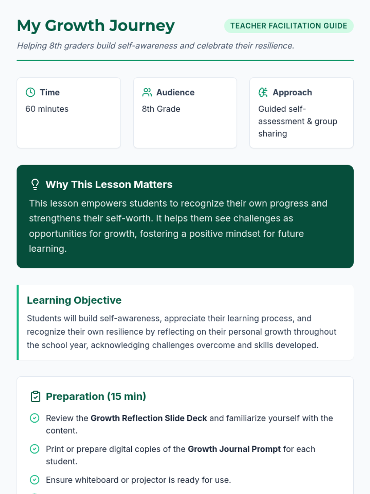 A single-session 8th-grade lesson focused on self-awareness, resilience, and personal growth. Students reflect on their school year journey through journaling, small group sharing, and class-wide discussion.