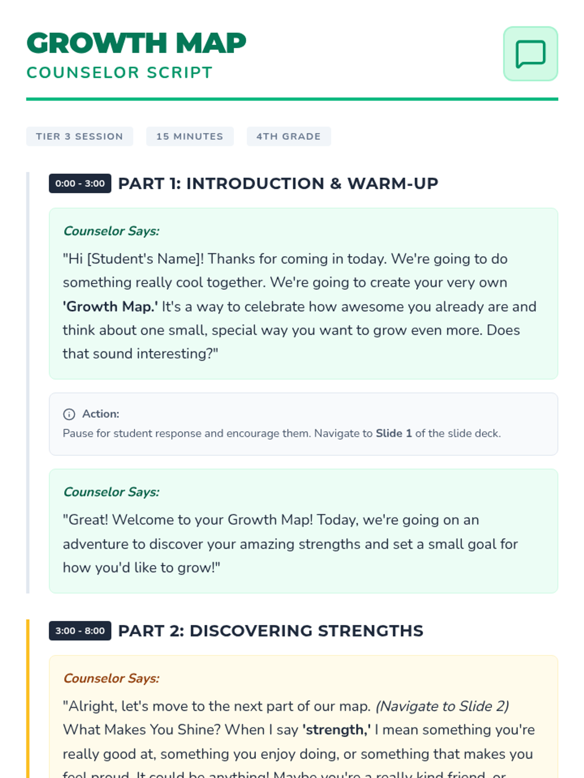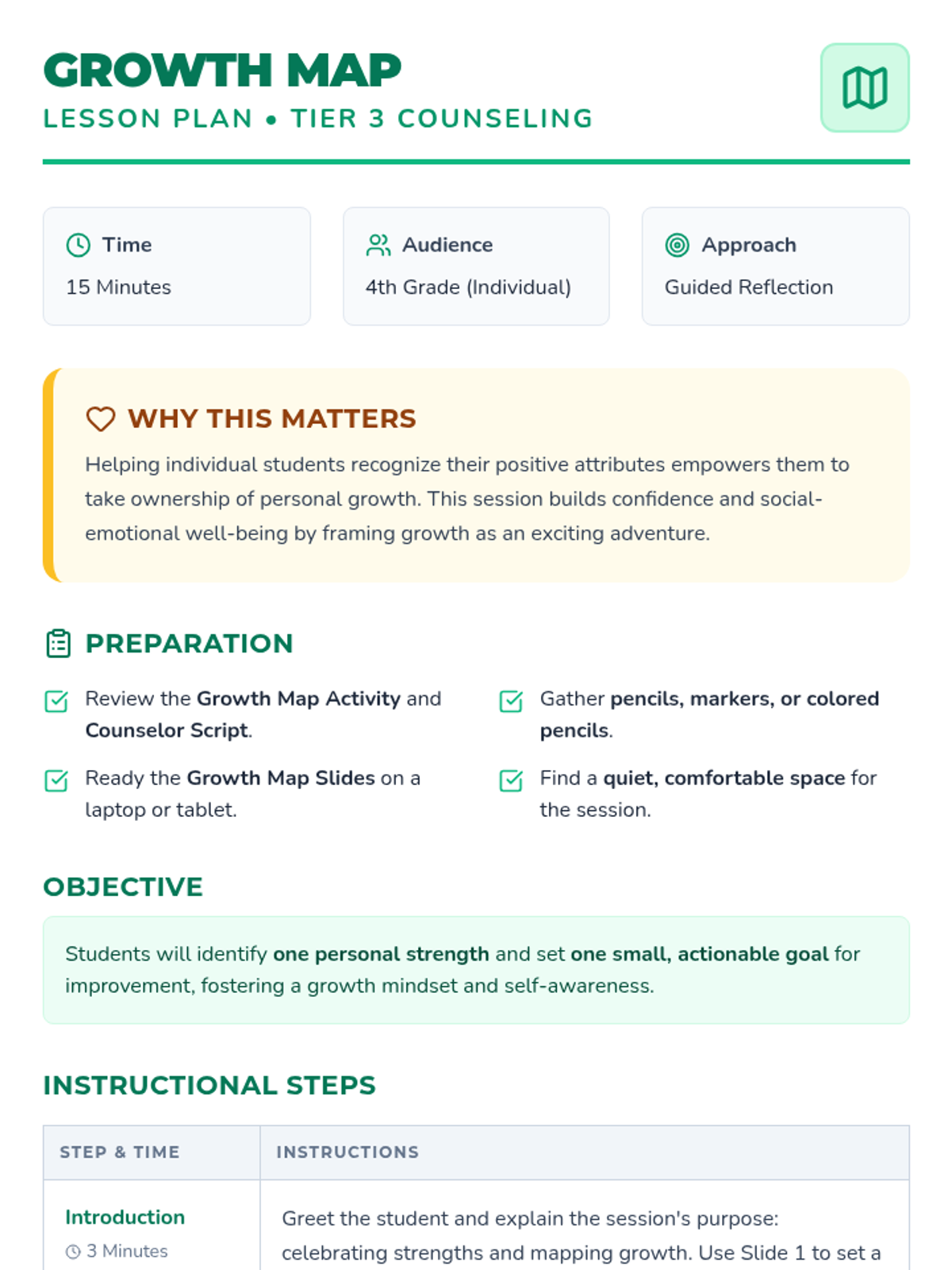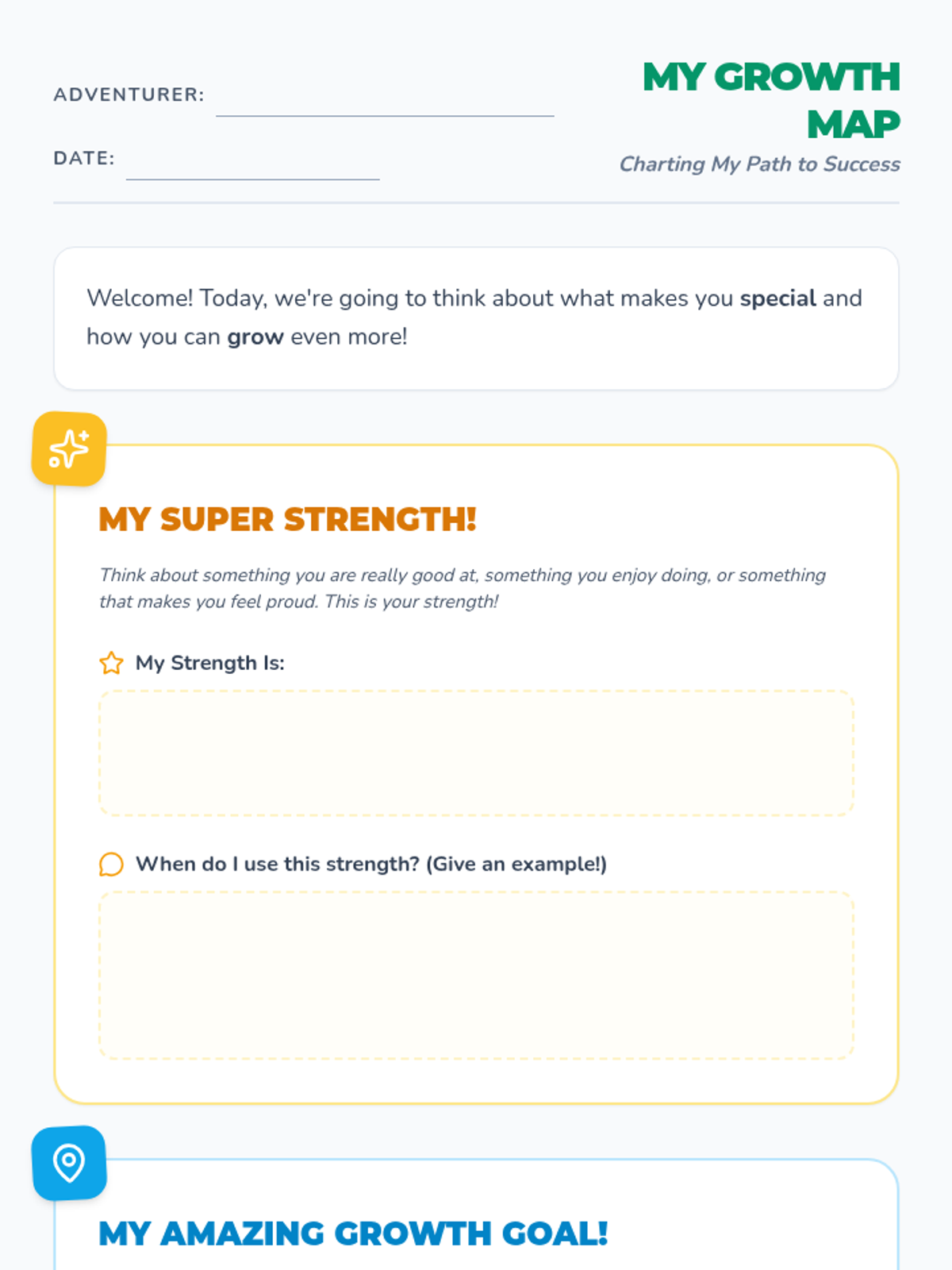 A personalized 15-minute Tier 3 counseling session for 4th-grade students to identify personal strengths and set an achievable growth goal using an adventure map metaphor.